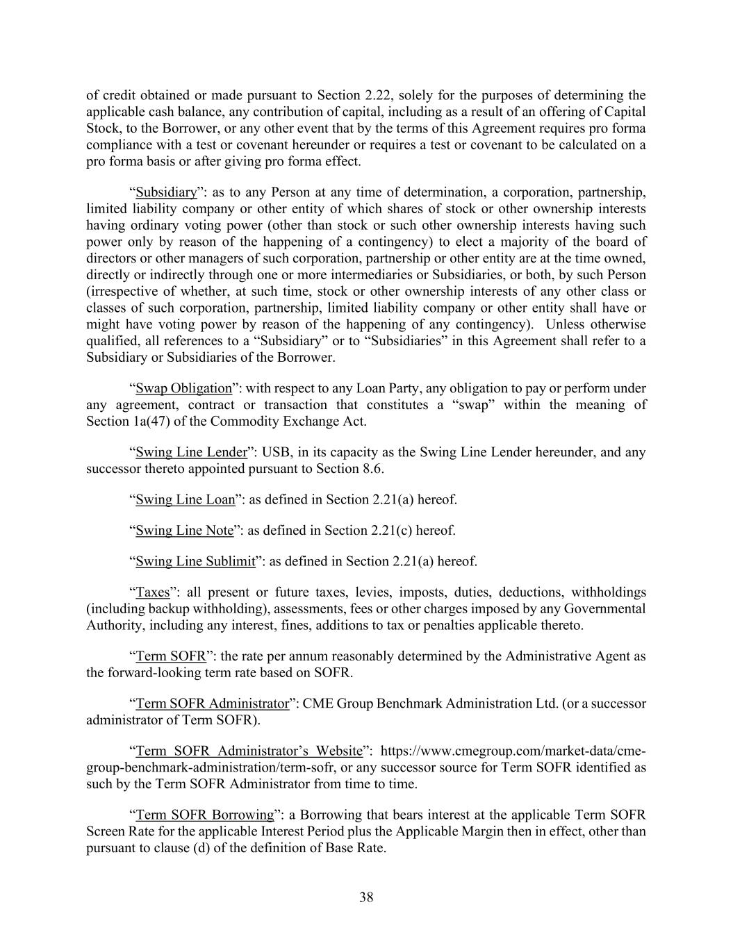 38 of credit obtained or made pursuant to Section 2.22, solely for the purposes of determining the applicable cash balance, any contribution of capital, including as a result of an offering of Capital Stock, to the Borrower, or any other event that by the terms of this Agreement requires pro forma compliance with a test or covenant hereunder or requires a test or covenant to be calculated on a pro forma basis or after giving pro forma effect. “Subsidiary”: as to any Person at any time of determination, a corporation, partnership, limited liability company or other entity of which shares of stock or other ownership interests having ordinary voting power (other than stock or such other ownership interests having such power only by reason of the happening of a contingency) to elect a majority of the board of directors or other managers of such corporation, partnership or other entity are at the time owned, directly or indirectly through one or more intermediaries or Subsidiaries, or both, by such Person (irrespective of whether, at such time, stock or other ownership interests of any other class or classes of such corporation, partnership, limited liability company or other entity shall have or might have voting power by reason of the happening of any contingency). Unless otherwise qualified, all references to a “Subsidiary” or to “Subsidiaries” in this Agreement shall refer to a Subsidiary or Subsidiaries of the Borrower. “Swap Obligation”: with respect to any Loan Party, any obligation to pay or perform under any agreement, contract or transaction that constitutes a “swap” within the meaning of Section 1a(47) of the Commodity Exchange Act. “Swing Line Lender”: USB, in its capacity as the Swing Line Lender hereunder, and any successor thereto appointed pursuant to Section 8.6. “Swing Line Loan”: as defined in Section 2.21(a) hereof. “Swing Line Note”: as defined in Section 2.21(c) hereof. “Swing Line Sublimit”: as defined in Section 2.21(a) hereof. “Taxes”: all present or future taxes, levies, imposts, duties, deductions, withholdings (including backup withholding), assessments, fees or other charges imposed by any Governmental Authority, including any interest, fines, additions to tax or penalties applicable thereto. “Term SOFR”: the rate per annum reasonably determined by the Administrative Agent as the forward-looking term rate based on SOFR. “Term SOFR Administrator”: CME Group Benchmark Administration Ltd. (or a successor administrator of Term SOFR). “Term SOFR Administrator’s Website”: https://www.cmegroup.com/market-data/cme- group-benchmark-administration/term-sofr, or any successor source for Term SOFR identified as such by the Term SOFR Administrator from time to time. “Term SOFR Borrowing”: a Borrowing that bears interest at the applicable Term SOFR Screen Rate for the applicable Interest Period plus the Applicable Margin then in effect, other than pursuant to clause (d) of the definition of Base Rate.