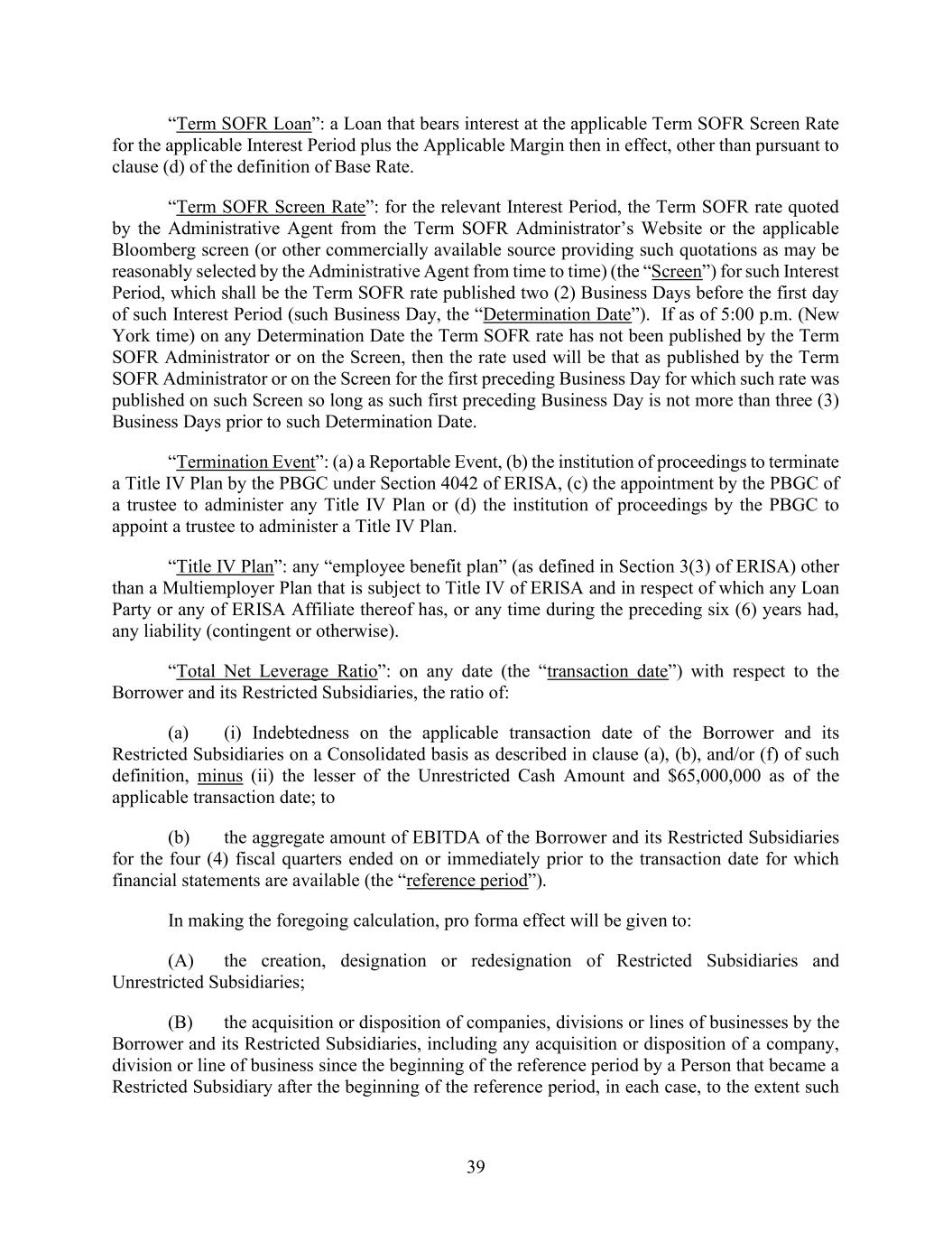 39 “Term SOFR Loan”: a Loan that bears interest at the applicable Term SOFR Screen Rate for the applicable Interest Period plus the Applicable Margin then in effect, other than pursuant to clause (d) of the definition of Base Rate. “Term SOFR Screen Rate”: for the relevant Interest Period, the Term SOFR rate quoted by the Administrative Agent from the Term SOFR Administrator’s Website or the applicable Bloomberg screen (or other commercially available source providing such quotations as may be reasonably selected by the Administrative Agent from time to time) (the “Screen”) for such Interest Period, which shall be the Term SOFR rate published two (2) Business Days before the first day of such Interest Period (such Business Day, the “Determination Date”). If as of 5:00 p.m. (New York time) on any Determination Date the Term SOFR rate has not been published by the Term SOFR Administrator or on the Screen, then the rate used will be that as published by the Term SOFR Administrator or on the Screen for the first preceding Business Day for which such rate was published on such Screen so long as such first preceding Business Day is not more than three (3) Business Days prior to such Determination Date. “Termination Event”: (a) a Reportable Event, (b) the institution of proceedings to terminate a Title IV Plan by the PBGC under Section 4042 of ERISA, (c) the appointment by the PBGC of a trustee to administer any Title IV Plan or (d) the institution of proceedings by the PBGC to appoint a trustee to administer a Title IV Plan. “Title IV Plan”: any “employee benefit plan” (as defined in Section 3(3) of ERISA) other than a Multiemployer Plan that is subject to Title IV of ERISA and in respect of which any Loan Party or any of ERISA Affiliate thereof has, or any time during the preceding six (6) years had, any liability (contingent or otherwise). “Total Net Leverage Ratio”: on any date (the “transaction date”) with respect to the Borrower and its Restricted Subsidiaries, the ratio of: (a) (i) Indebtedness on the applicable transaction date of the Borrower and its Restricted Subsidiaries on a Consolidated basis as described in clause (a), (b), and/or (f) of such definition, minus (ii) the lesser of the Unrestricted Cash Amount and $65,000,000 as of the applicable transaction date; to (b) the aggregate amount of EBITDA of the Borrower and its Restricted Subsidiaries for the four (4) fiscal quarters ended on or immediately prior to the transaction date for which financial statements are available (the “reference period”). In making the foregoing calculation, pro forma effect will be given to: (A) the creation, designation or redesignation of Restricted Subsidiaries and Unrestricted Subsidiaries; (B) the acquisition or disposition of companies, divisions or lines of businesses by the Borrower and its Restricted Subsidiaries, including any acquisition or disposition of a company, division or line of business since the beginning of the reference period by a Person that became a Restricted Subsidiary after the beginning of the reference period, in each case, to the extent such