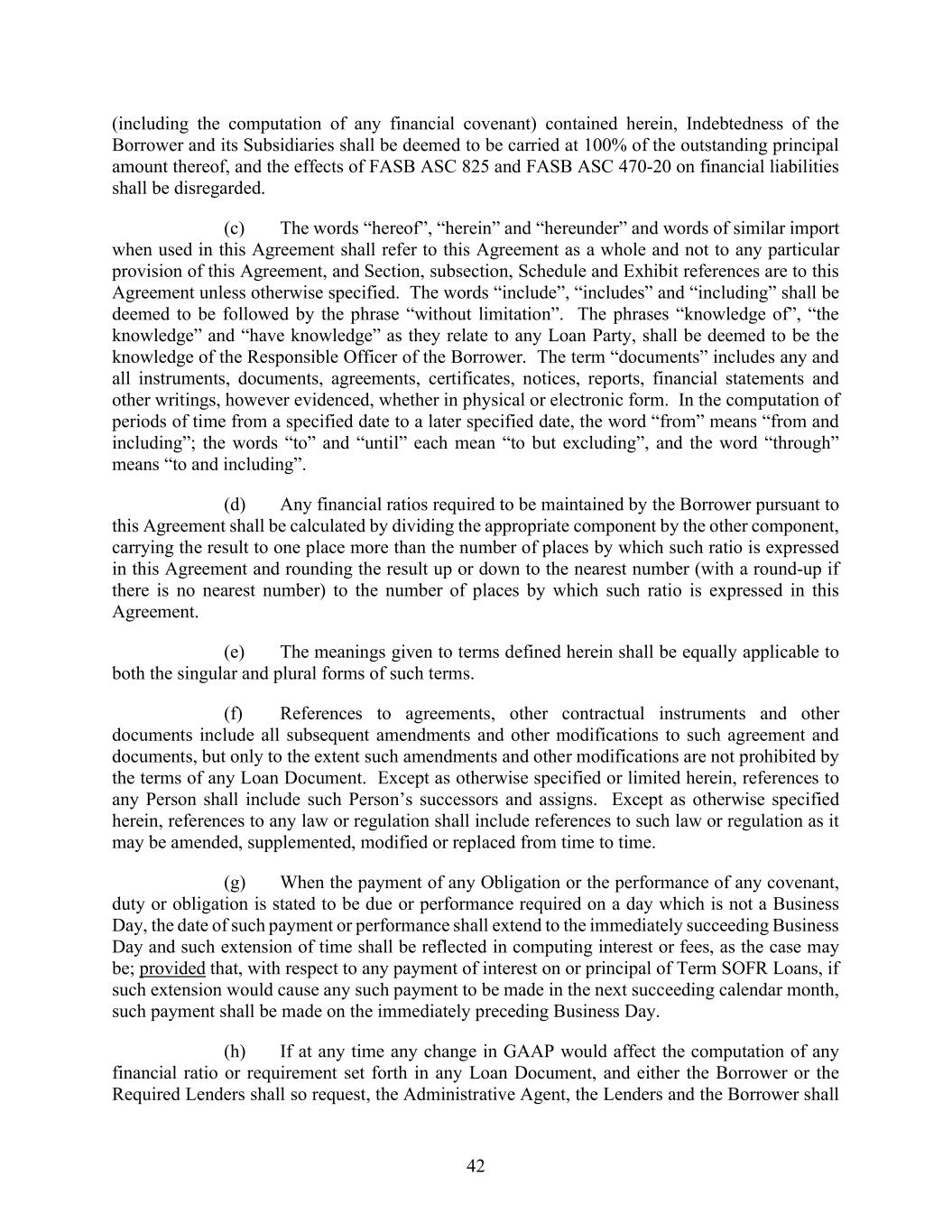 42 (including the computation of any financial covenant) contained herein, Indebtedness of the Borrower and its Subsidiaries shall be deemed to be carried at 100% of the outstanding principal amount thereof, and the effects of FASB ASC 825 and FASB ASC 470-20 on financial liabilities shall be disregarded. (c) The words “hereof”, “herein” and “hereunder” and words of similar import when used in this Agreement shall refer to this Agreement as a whole and not to any particular provision of this Agreement, and Section, subsection, Schedule and Exhibit references are to this Agreement unless otherwise specified. The words “include”, “includes” and “including” shall be deemed to be followed by the phrase “without limitation”. The phrases “knowledge of”, “the knowledge” and “have knowledge” as they relate to any Loan Party, shall be deemed to be the knowledge of the Responsible Officer of the Borrower. The term “documents” includes any and all instruments, documents, agreements, certificates, notices, reports, financial statements and other writings, however evidenced, whether in physical or electronic form. In the computation of periods of time from a specified date to a later specified date, the word “from” means “from and including”; the words “to” and “until” each mean “to but excluding”, and the word “through” means “to and including”. (d) Any financial ratios required to be maintained by the Borrower pursuant to this Agreement shall be calculated by dividing the appropriate component by the other component, carrying the result to one place more than the number of places by which such ratio is expressed in this Agreement and rounding the result up or down to the nearest number (with a round-up if there is no nearest number) to the number of places by which such ratio is expressed in this Agreement. (e) The meanings given to terms defined herein shall be equally applicable to both the singular and plural forms of such terms. (f) References to agreements, other contractual instruments and other documents include all subsequent amendments and other modifications to such agreement and documents, but only to the extent such amendments and other modifications are not prohibited by the terms of any Loan Document. Except as otherwise specified or limited herein, references to any Person shall include such Person’s successors and assigns. Except as otherwise specified herein, references to any law or regulation shall include references to such law or regulation as it may be amended, supplemented, modified or replaced from time to time. (g) When the payment of any Obligation or the performance of any covenant, duty or obligation is stated to be due or performance required on a day which is not a Business Day, the date of such payment or performance shall extend to the immediately succeeding Business Day and such extension of time shall be reflected in computing interest or fees, as the case may be; provided that, with respect to any payment of interest on or principal of Term SOFR Loans, if such extension would cause any such payment to be made in the next succeeding calendar month, such payment shall be made on the immediately preceding Business Day. (h) If at any time any change in GAAP would affect the computation of any financial ratio or requirement set forth in any Loan Document, and either the Borrower or the Required Lenders shall so request, the Administrative Agent, the Lenders and the Borrower shall
