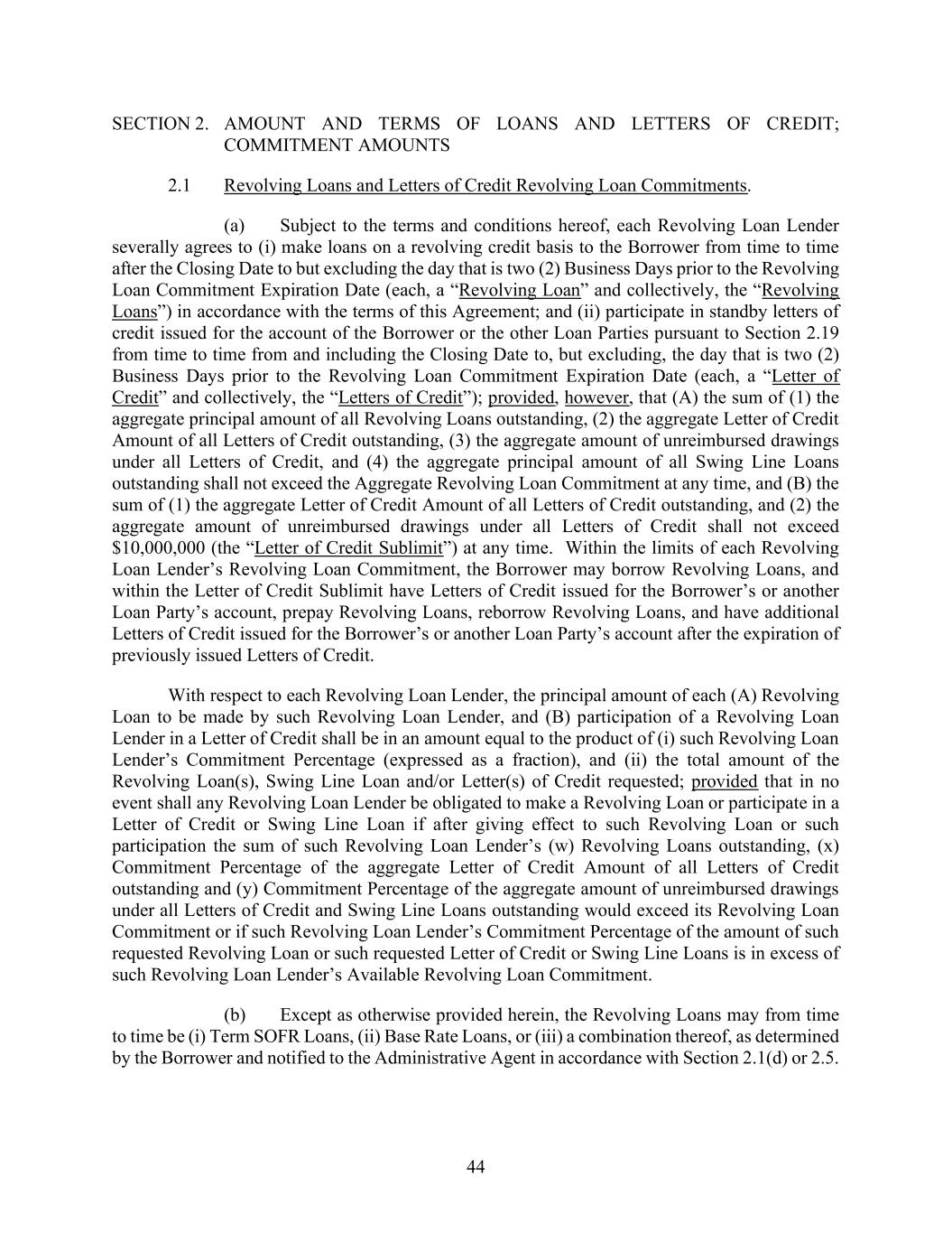 44 SECTION 2. AMOUNT AND TERMS OF LOANS AND LETTERS OF CREDIT; COMMITMENT AMOUNTS 2.1 Revolving Loans and Letters of Credit Revolving Loan Commitments. (a) Subject to the terms and conditions hereof, each Revolving Loan Lender severally agrees to (i) make loans on a revolving credit basis to the Borrower from time to time after the Closing Date to but excluding the day that is two (2) Business Days prior to the Revolving Loan Commitment Expiration Date (each, a “Revolving Loan” and collectively, the “Revolving Loans”) in accordance with the terms of this Agreement; and (ii) participate in standby letters of credit issued for the account of the Borrower or the other Loan Parties pursuant to Section 2.19 from time to time from and including the Closing Date to, but excluding, the day that is two (2) Business Days prior to the Revolving Loan Commitment Expiration Date (each, a “Letter of Credit” and collectively, the “Letters of Credit”); provided, however, that (A) the sum of (1) the aggregate principal amount of all Revolving Loans outstanding, (2) the aggregate Letter of Credit Amount of all Letters of Credit outstanding, (3) the aggregate amount of unreimbursed drawings under all Letters of Credit, and (4) the aggregate principal amount of all Swing Line Loans outstanding shall not exceed the Aggregate Revolving Loan Commitment at any time, and (B) the sum of (1) the aggregate Letter of Credit Amount of all Letters of Credit outstanding, and (2) the aggregate amount of unreimbursed drawings under all Letters of Credit shall not exceed $10,000,000 (the “Letter of Credit Sublimit”) at any time. Within the limits of each Revolving Loan Lender’s Revolving Loan Commitment, the Borrower may borrow Revolving Loans, and within the Letter of Credit Sublimit have Letters of Credit issued for the Borrower’s or another Loan Party’s account, prepay Revolving Loans, reborrow Revolving Loans, and have additional Letters of Credit issued for the Borrower’s or another Loan Party’s account after the expiration of previously issued Letters of Credit. With respect to each Revolving Loan Lender, the principal amount of each (A) Revolving Loan to be made by such Revolving Loan Lender, and (B) participation of a Revolving Loan Lender in a Letter of Credit shall be in an amount equal to the product of (i) such Revolving Loan Lender’s Commitment Percentage (expressed as a fraction), and (ii) the total amount of the Revolving Loan(s), Swing Line Loan and/or Letter(s) of Credit requested; provided that in no event shall any Revolving Loan Lender be obligated to make a Revolving Loan or participate in a Letter of Credit or Swing Line Loan if after giving effect to such Revolving Loan or such participation the sum of such Revolving Loan Lender’s (w) Revolving Loans outstanding, (x) Commitment Percentage of the aggregate Letter of Credit Amount of all Letters of Credit outstanding and (y) Commitment Percentage of the aggregate amount of unreimbursed drawings under all Letters of Credit and Swing Line Loans outstanding would exceed its Revolving Loan Commitment or if such Revolving Loan Lender’s Commitment Percentage of the amount of such requested Revolving Loan or such requested Letter of Credit or Swing Line Loans is in excess of such Revolving Loan Lender’s Available Revolving Loan Commitment. (b) Except as otherwise provided herein, the Revolving Loans may from time to time be (i) Term SOFR Loans, (ii) Base Rate Loans, or (iii) a combination thereof, as determined by the Borrower and notified to the Administrative Agent in accordance with Section 2.1(d) or 2.5.
