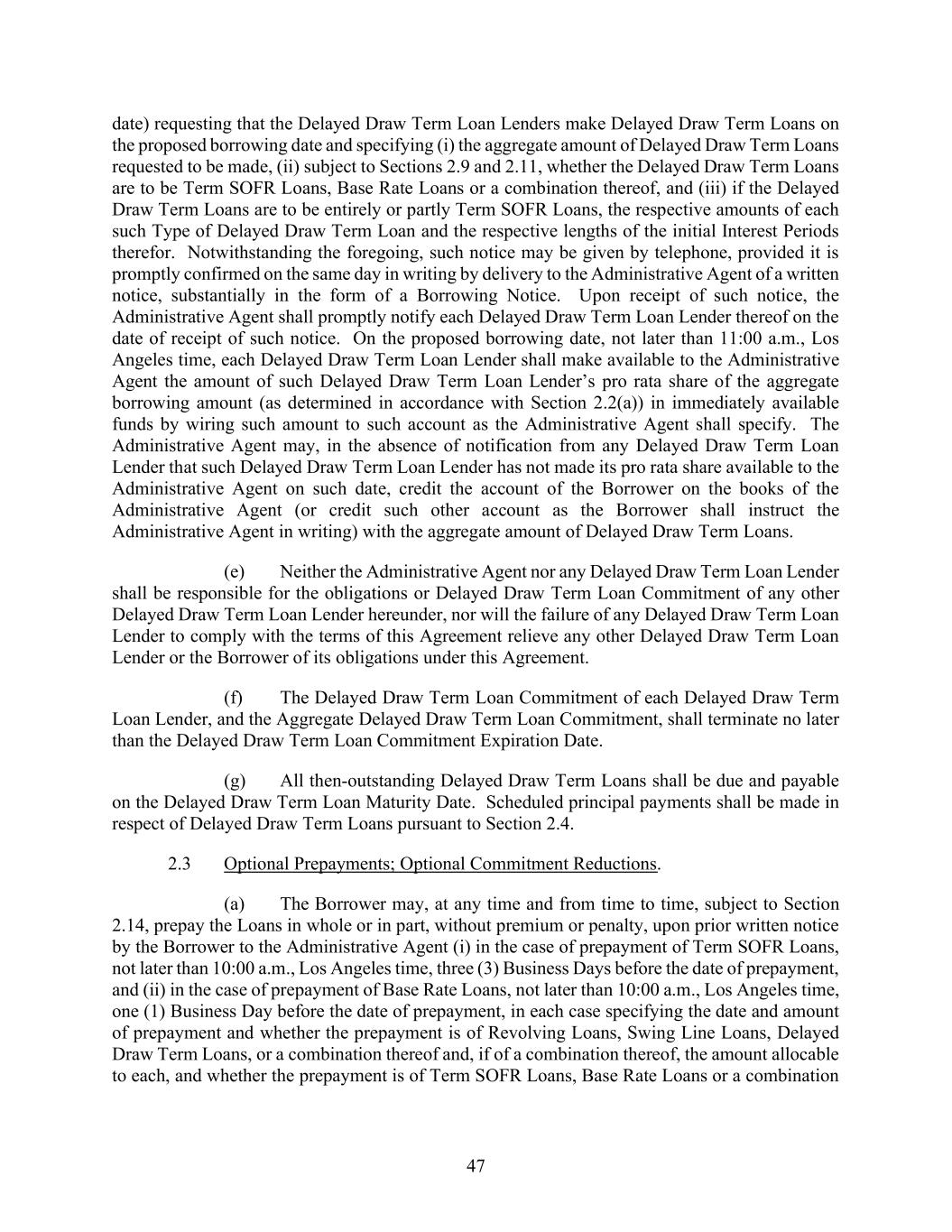 47 date) requesting that the Delayed Draw Term Loan Lenders make Delayed Draw Term Loans on the proposed borrowing date and specifying (i) the aggregate amount of Delayed Draw Term Loans requested to be made, (ii) subject to Sections 2.9 and 2.11, whether the Delayed Draw Term Loans are to be Term SOFR Loans, Base Rate Loans or a combination thereof, and (iii) if the Delayed Draw Term Loans are to be entirely or partly Term SOFR Loans, the respective amounts of each such Type of Delayed Draw Term Loan and the respective lengths of the initial Interest Periods therefor. Notwithstanding the foregoing, such notice may be given by telephone, provided it is promptly confirmed on the same day in writing by delivery to the Administrative Agent of a written notice, substantially in the form of a Borrowing Notice. Upon receipt of such notice, the Administrative Agent shall promptly notify each Delayed Draw Term Loan Lender thereof on the date of receipt of such notice. On the proposed borrowing date, not later than 11:00 a.m., Los Angeles time, each Delayed Draw Term Loan Lender shall make available to the Administrative Agent the amount of such Delayed Draw Term Loan Lender’s pro rata share of the aggregate borrowing amount (as determined in accordance with Section 2.2(a)) in immediately available funds by wiring such amount to such account as the Administrative Agent shall specify. The Administrative Agent may, in the absence of notification from any Delayed Draw Term Loan Lender that such Delayed Draw Term Loan Lender has not made its pro rata share available to the Administrative Agent on such date, credit the account of the Borrower on the books of the Administrative Agent (or credit such other account as the Borrower shall instruct the Administrative Agent in writing) with the aggregate amount of Delayed Draw Term Loans. (e) Neither the Administrative Agent nor any Delayed Draw Term Loan Lender shall be responsible for the obligations or Delayed Draw Term Loan Commitment of any other Delayed Draw Term Loan Lender hereunder, nor will the failure of any Delayed Draw Term Loan Lender to comply with the terms of this Agreement relieve any other Delayed Draw Term Loan Lender or the Borrower of its obligations under this Agreement. (f) The Delayed Draw Term Loan Commitment of each Delayed Draw Term Loan Lender, and the Aggregate Delayed Draw Term Loan Commitment, shall terminate no later than the Delayed Draw Term Loan Commitment Expiration Date. (g) All then-outstanding Delayed Draw Term Loans shall be due and payable on the Delayed Draw Term Loan Maturity Date. Scheduled principal payments shall be made in respect of Delayed Draw Term Loans pursuant to Section 2.4. 2.3 Optional Prepayments; Optional Commitment Reductions. (a) The Borrower may, at any time and from time to time, subject to Section 2.14, prepay the Loans in whole or in part, without premium or penalty, upon prior written notice by the Borrower to the Administrative Agent (i) in the case of prepayment of Term SOFR Loans, not later than 10:00 a.m., Los Angeles time, three (3) Business Days before the date of prepayment, and (ii) in the case of prepayment of Base Rate Loans, not later than 10:00 a.m., Los Angeles time, one (1) Business Day before the date of prepayment, in each case specifying the date and amount of prepayment and whether the prepayment is of Revolving Loans, Swing Line Loans, Delayed Draw Term Loans, or a combination thereof and, if of a combination thereof, the amount allocable to each, and whether the prepayment is of Term SOFR Loans, Base Rate Loans or a combination