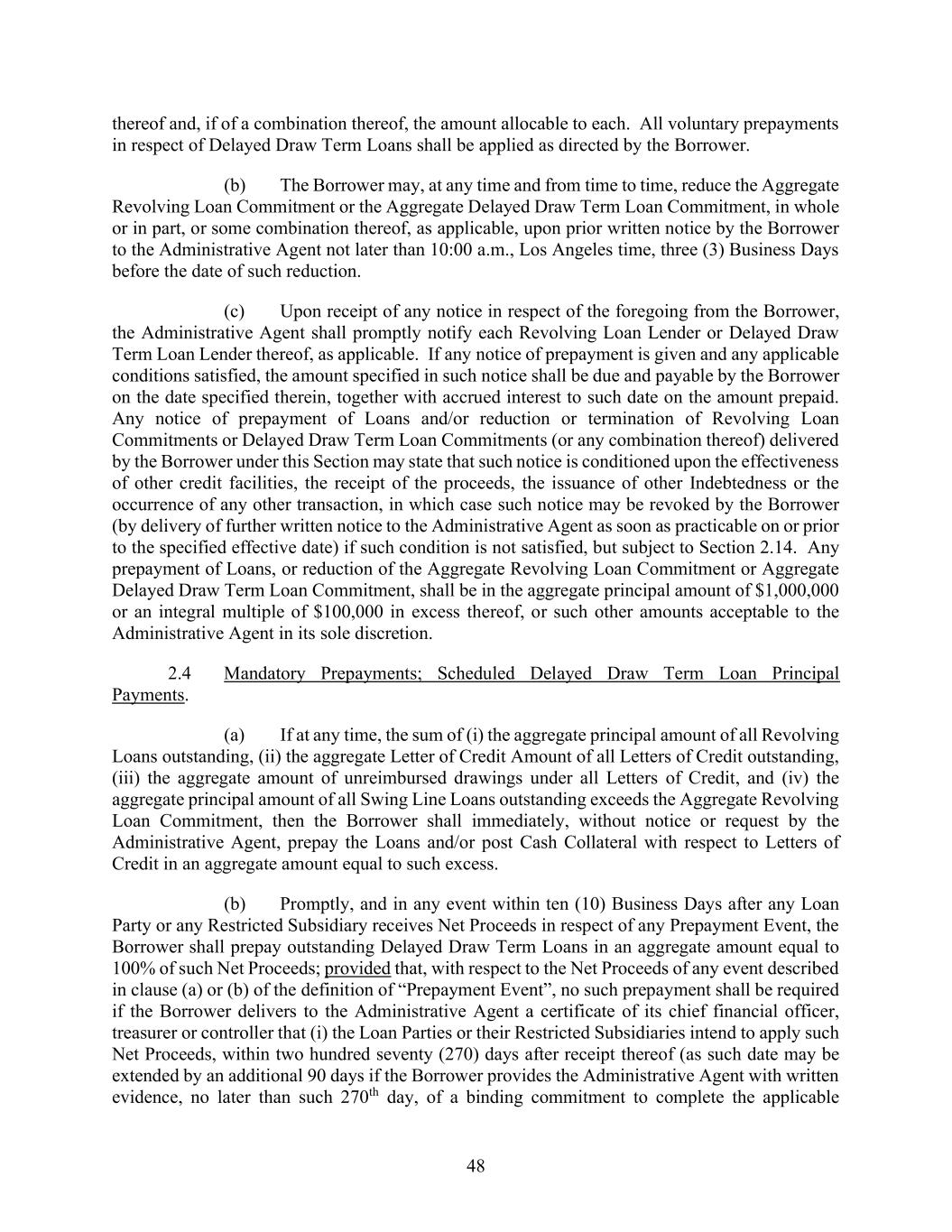 48 thereof and, if of a combination thereof, the amount allocable to each. All voluntary prepayments in respect of Delayed Draw Term Loans shall be applied as directed by the Borrower. (b) The Borrower may, at any time and from time to time, reduce the Aggregate Revolving Loan Commitment or the Aggregate Delayed Draw Term Loan Commitment, in whole or in part, or some combination thereof, as applicable, upon prior written notice by the Borrower to the Administrative Agent not later than 10:00 a.m., Los Angeles time, three (3) Business Days before the date of such reduction. (c) Upon receipt of any notice in respect of the foregoing from the Borrower, the Administrative Agent shall promptly notify each Revolving Loan Lender or Delayed Draw Term Loan Lender thereof, as applicable. If any notice of prepayment is given and any applicable conditions satisfied, the amount specified in such notice shall be due and payable by the Borrower on the date specified therein, together with accrued interest to such date on the amount prepaid. Any notice of prepayment of Loans and/or reduction or termination of Revolving Loan Commitments or Delayed Draw Term Loan Commitments (or any combination thereof) delivered by the Borrower under this Section may state that such notice is conditioned upon the effectiveness of other credit facilities, the receipt of the proceeds, the issuance of other Indebtedness or the occurrence of any other transaction, in which case such notice may be revoked by the Borrower (by delivery of further written notice to the Administrative Agent as soon as practicable on or prior to the specified effective date) if such condition is not satisfied, but subject to Section 2.14. Any prepayment of Loans, or reduction of the Aggregate Revolving Loan Commitment or Aggregate Delayed Draw Term Loan Commitment, shall be in the aggregate principal amount of $1,000,000 or an integral multiple of $100,000 in excess thereof, or such other amounts acceptable to the Administrative Agent in its sole discretion. 2.4 Mandatory Prepayments; Scheduled Delayed Draw Term Loan Principal Payments. (a) If at any time, the sum of (i) the aggregate principal amount of all Revolving Loans outstanding, (ii) the aggregate Letter of Credit Amount of all Letters of Credit outstanding, (iii) the aggregate amount of unreimbursed drawings under all Letters of Credit, and (iv) the aggregate principal amount of all Swing Line Loans outstanding exceeds the Aggregate Revolving Loan Commitment, then the Borrower shall immediately, without notice or request by the Administrative Agent, prepay the Loans and/or post Cash Collateral with respect to Letters of Credit in an aggregate amount equal to such excess. (b) Promptly, and in any event within ten (10) Business Days after any Loan Party or any Restricted Subsidiary receives Net Proceeds in respect of any Prepayment Event, the Borrower shall prepay outstanding Delayed Draw Term Loans in an aggregate amount equal to 100% of such Net Proceeds; provided that, with respect to the Net Proceeds of any event described in clause (a) or (b) of the definition of “Prepayment Event”, no such prepayment shall be required if the Borrower delivers to the Administrative Agent a certificate of its chief financial officer, treasurer or controller that (i) the Loan Parties or their Restricted Subsidiaries intend to apply such Net Proceeds, within two hundred seventy (270) days after receipt thereof (as such date may be extended by an additional 90 days if the Borrower provides the Administrative Agent with written evidence, no later than such 270th day, of a binding commitment to complete the applicable