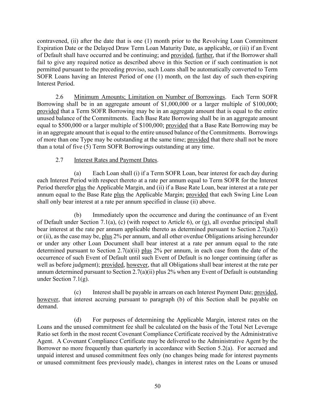 50 contravened, (ii) after the date that is one (1) month prior to the Revolving Loan Commitment Expiration Date or the Delayed Draw Term Loan Maturity Date, as applicable, or (iii) if an Event of Default shall have occurred and be continuing; and provided, further, that if the Borrower shall fail to give any required notice as described above in this Section or if such continuation is not permitted pursuant to the preceding proviso, such Loans shall be automatically converted to Term SOFR Loans having an Interest Period of one (1) month, on the last day of such then-expiring Interest Period. 2.6 Minimum Amounts; Limitation on Number of Borrowings. Each Term SOFR Borrowing shall be in an aggregate amount of $1,000,000 or a larger multiple of $100,000; provided that a Term SOFR Borrowing may be in an aggregate amount that is equal to the entire unused balance of the Commitments. Each Base Rate Borrowing shall be in an aggregate amount equal to $500,000 or a larger multiple of $100,000; provided that a Base Rate Borrowing may be in an aggregate amount that is equal to the entire unused balance of the Commitments. Borrowings of more than one Type may be outstanding at the same time; provided that there shall not be more than a total of five (5) Term SOFR Borrowings outstanding at any time. 2.7 Interest Rates and Payment Dates. (a) Each Loan shall (i) if a Term SOFR Loan, bear interest for each day during each Interest Period with respect thereto at a rate per annum equal to Term SOFR for the Interest Period therefor plus the Applicable Margin, and (ii) if a Base Rate Loan, bear interest at a rate per annum equal to the Base Rate plus the Applicable Margin; provided that each Swing Line Loan shall only bear interest at a rate per annum specified in clause (ii) above. (b) Immediately upon the occurrence and during the continuance of an Event of Default under Section 7.1(a), (c) (with respect to Article 6), or (g), all overdue principal shall bear interest at the rate per annum applicable thereto as determined pursuant to Section 2.7(a)(i) or (ii), as the case may be, plus 2% per annum, and all other overdue Obligations arising hereunder or under any other Loan Document shall bear interest at a rate per annum equal to the rate determined pursuant to Section 2.7(a)(ii) plus 2% per annum, in each case from the date of the occurrence of such Event of Default until such Event of Default is no longer continuing (after as well as before judgment); provided, however, that all Obligations shall bear interest at the rate per annum determined pursuant to Section 2.7(a)(ii) plus 2% when any Event of Default is outstanding under Section 7.1(g). (c) Interest shall be payable in arrears on each Interest Payment Date; provided, however, that interest accruing pursuant to paragraph (b) of this Section shall be payable on demand. (d) For purposes of determining the Applicable Margin, interest rates on the Loans and the unused commitment fee shall be calculated on the basis of the Total Net Leverage Ratio set forth in the most recent Covenant Compliance Certificate received by the Administrative Agent. A Covenant Compliance Certificate may be delivered to the Administrative Agent by the Borrower no more frequently than quarterly in accordance with Section 5.2(a). For accrued and unpaid interest and unused commitment fees only (no changes being made for interest payments or unused commitment fees previously made), changes in interest rates on the Loans or unused