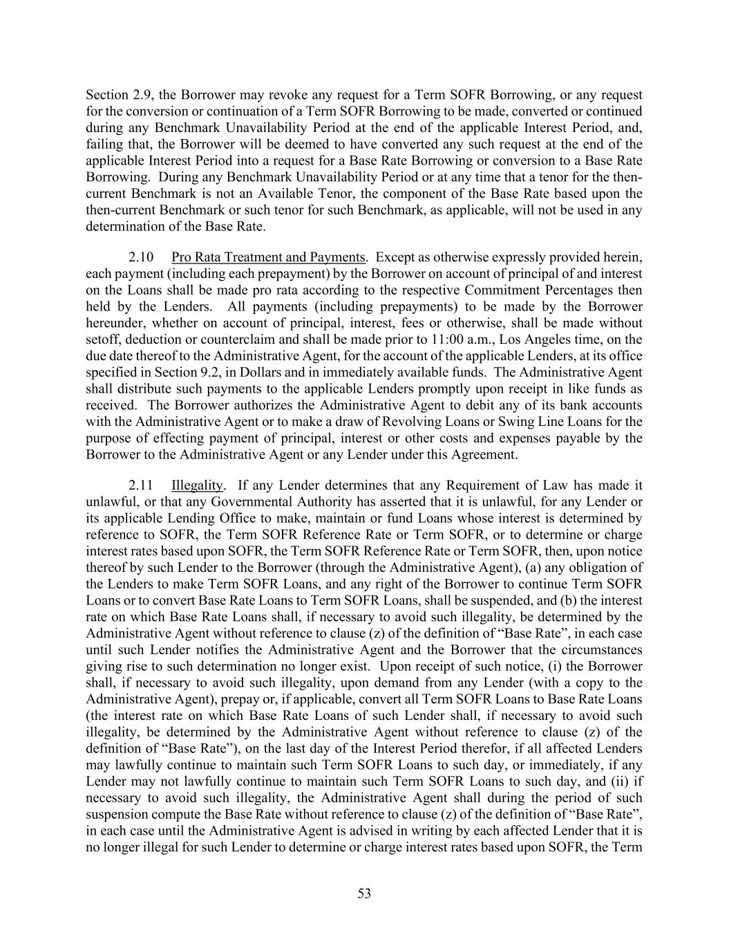 53 Section 2.9, the Borrower may revoke any request for a Term SOFR Borrowing, or any request for the conversion or continuation of a Term SOFR Borrowing to be made, converted or continued during any Benchmark Unavailability Period at the end of the applicable Interest Period, and, failing that, the Borrower will be deemed to have converted any such request at the end of the applicable Interest Period into a request for a Base Rate Borrowing or conversion to a Base Rate Borrowing. During any Benchmark Unavailability Period or at any time that a tenor for the then- current Benchmark is not an Available Tenor, the component of the Base Rate based upon the then-current Benchmark or such tenor for such Benchmark, as applicable, will not be used in any determination of the Base Rate. 2.10 Pro Rata Treatment and Payments. Except as otherwise expressly provided herein, each payment (including each prepayment) by the Borrower on account of principal of and interest on the Loans shall be made pro rata according to the respective Commitment Percentages then held by the Lenders. All payments (including prepayments) to be made by the Borrower hereunder, whether on account of principal, interest, fees or otherwise, shall be made without setoff, deduction or counterclaim and shall be made prior to 11:00 a.m., Los Angeles time, on the due date thereof to the Administrative Agent, for the account of the applicable Lenders, at its office specified in Section 9.2, in Dollars and in immediately available funds. The Administrative Agent shall distribute such payments to the applicable Lenders promptly upon receipt in like funds as received. The Borrower authorizes the Administrative Agent to debit any of its bank accounts with the Administrative Agent or to make a draw of Revolving Loans or Swing Line Loans for the purpose of effecting payment of principal, interest or other costs and expenses payable by the Borrower to the Administrative Agent or any Lender under this Agreement. 2.11 Illegality. If any Lender determines that any Requirement of Law has made it unlawful, or that any Governmental Authority has asserted that it is unlawful, for any Lender or its applicable Lending Office to make, maintain or fund Loans whose interest is determined by reference to SOFR, the Term SOFR Reference Rate or Term SOFR, or to determine or charge interest rates based upon SOFR, the Term SOFR Reference Rate or Term SOFR, then, upon notice thereof by such Lender to the Borrower (through the Administrative Agent), (a) any obligation of the Lenders to make Term SOFR Loans, and any right of the Borrower to continue Term SOFR Loans or to convert Base Rate Loans to Term SOFR Loans, shall be suspended, and (b) the interest rate on which Base Rate Loans shall, if necessary to avoid such illegality, be determined by the Administrative Agent without reference to clause (z) of the definition of “Base Rate”, in each case until such Lender notifies the Administrative Agent and the Borrower that the circumstances giving rise to such determination no longer exist. Upon receipt of such notice, (i) the Borrower shall, if necessary to avoid such illegality, upon demand from any Lender (with a copy to the Administrative Agent), prepay or, if applicable, convert all Term SOFR Loans to Base Rate Loans (the interest rate on which Base Rate Loans of such Lender shall, if necessary to avoid such illegality, be determined by the Administrative Agent without reference to clause (z) of the definition of “Base Rate”), on the last day of the Interest Period therefor, if all affected Lenders may lawfully continue to maintain such Term SOFR Loans to such day, or immediately, if any Lender may not lawfully continue to maintain such Term SOFR Loans to such day, and (ii) if necessary to avoid such illegality, the Administrative Agent shall during the period of such suspension compute the Base Rate without reference to clause (z) of the definition of “Base Rate”, in each case until the Administrative Agent is advised in writing by each affected Lender that it is no longer illegal for such Lender to determine or charge interest rates based upon SOFR, the Term