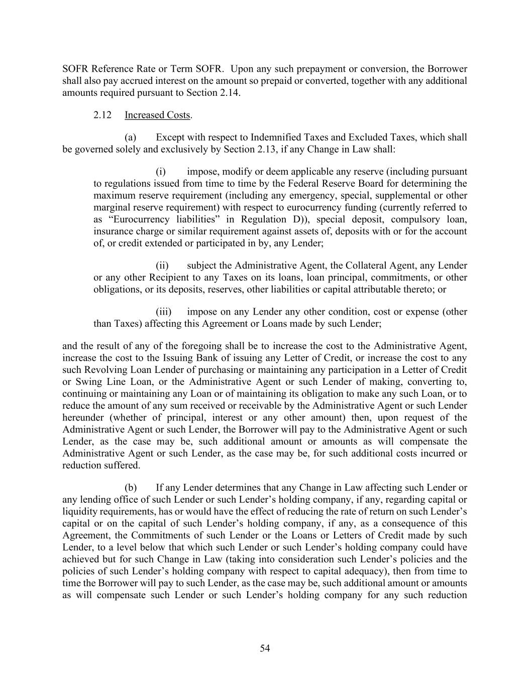 54 SOFR Reference Rate or Term SOFR. Upon any such prepayment or conversion, the Borrower shall also pay accrued interest on the amount so prepaid or converted, together with any additional amounts required pursuant to Section 2.14. 2.12 Increased Costs. (a) Except with respect to Indemnified Taxes and Excluded Taxes, which shall be governed solely and exclusively by Section 2.13, if any Change in Law shall: (i) impose, modify or deem applicable any reserve (including pursuant to regulations issued from time to time by the Federal Reserve Board for determining the maximum reserve requirement (including any emergency, special, supplemental or other marginal reserve requirement) with respect to eurocurrency funding (currently referred to as “Eurocurrency liabilities” in Regulation D)), special deposit, compulsory loan, insurance charge or similar requirement against assets of, deposits with or for the account of, or credit extended or participated in by, any Lender; (ii) subject the Administrative Agent, the Collateral Agent, any Lender or any other Recipient to any Taxes on its loans, loan principal, commitments, or other obligations, or its deposits, reserves, other liabilities or capital attributable thereto; or (iii) impose on any Lender any other condition, cost or expense (other than Taxes) affecting this Agreement or Loans made by such Lender; and the result of any of the foregoing shall be to increase the cost to the Administrative Agent, increase the cost to the Issuing Bank of issuing any Letter of Credit, or increase the cost to any such Revolving Loan Lender of purchasing or maintaining any participation in a Letter of Credit or Swing Line Loan, or the Administrative Agent or such Lender of making, converting to, continuing or maintaining any Loan or of maintaining its obligation to make any such Loan, or to reduce the amount of any sum received or receivable by the Administrative Agent or such Lender hereunder (whether of principal, interest or any other amount) then, upon request of the Administrative Agent or such Lender, the Borrower will pay to the Administrative Agent or such Lender, as the case may be, such additional amount or amounts as will compensate the Administrative Agent or such Lender, as the case may be, for such additional costs incurred or reduction suffered. (b) If any Lender determines that any Change in Law affecting such Lender or any lending office of such Lender or such Lender’s holding company, if any, regarding capital or liquidity requirements, has or would have the effect of reducing the rate of return on such Lender’s capital or on the capital of such Lender’s holding company, if any, as a consequence of this Agreement, the Commitments of such Lender or the Loans or Letters of Credit made by such Lender, to a level below that which such Lender or such Lender’s holding company could have achieved but for such Change in Law (taking into consideration such Lender’s policies and the policies of such Lender’s holding company with respect to capital adequacy), then from time to time the Borrower will pay to such Lender, as the case may be, such additional amount or amounts as will compensate such Lender or such Lender’s holding company for any such reduction