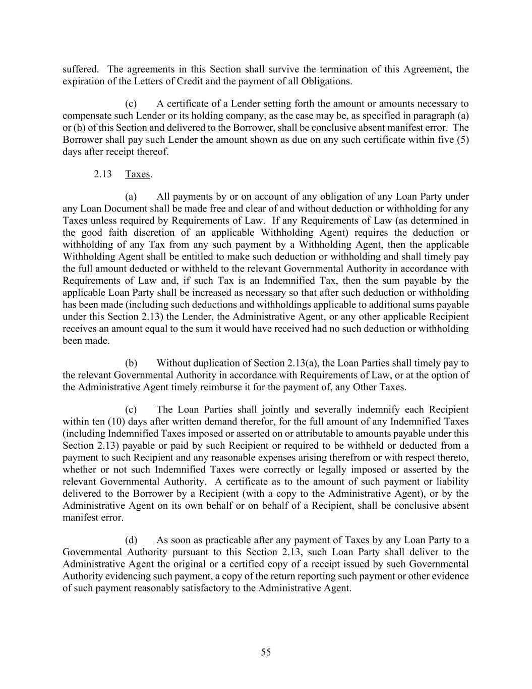 55 suffered. The agreements in this Section shall survive the termination of this Agreement, the expiration of the Letters of Credit and the payment of all Obligations. (c) A certificate of a Lender setting forth the amount or amounts necessary to compensate such Lender or its holding company, as the case may be, as specified in paragraph (a) or (b) of this Section and delivered to the Borrower, shall be conclusive absent manifest error. The Borrower shall pay such Lender the amount shown as due on any such certificate within five (5) days after receipt thereof. 2.13 Taxes. (a) All payments by or on account of any obligation of any Loan Party under any Loan Document shall be made free and clear of and without deduction or withholding for any Taxes unless required by Requirements of Law. If any Requirements of Law (as determined in the good faith discretion of an applicable Withholding Agent) requires the deduction or withholding of any Tax from any such payment by a Withholding Agent, then the applicable Withholding Agent shall be entitled to make such deduction or withholding and shall timely pay the full amount deducted or withheld to the relevant Governmental Authority in accordance with Requirements of Law and, if such Tax is an Indemnified Tax, then the sum payable by the applicable Loan Party shall be increased as necessary so that after such deduction or withholding has been made (including such deductions and withholdings applicable to additional sums payable under this Section 2.13) the Lender, the Administrative Agent, or any other applicable Recipient receives an amount equal to the sum it would have received had no such deduction or withholding been made. (b) Without duplication of Section 2.13(a), the Loan Parties shall timely pay to the relevant Governmental Authority in accordance with Requirements of Law, or at the option of the Administrative Agent timely reimburse it for the payment of, any Other Taxes. (c) The Loan Parties shall jointly and severally indemnify each Recipient within ten (10) days after written demand therefor, for the full amount of any Indemnified Taxes (including Indemnified Taxes imposed or asserted on or attributable to amounts payable under this Section 2.13) payable or paid by such Recipient or required to be withheld or deducted from a payment to such Recipient and any reasonable expenses arising therefrom or with respect thereto, whether or not such Indemnified Taxes were correctly or legally imposed or asserted by the relevant Governmental Authority. A certificate as to the amount of such payment or liability delivered to the Borrower by a Recipient (with a copy to the Administrative Agent), or by the Administrative Agent on its own behalf or on behalf of a Recipient, shall be conclusive absent manifest error. (d) As soon as practicable after any payment of Taxes by any Loan Party to a Governmental Authority pursuant to this Section 2.13, such Loan Party shall deliver to the Administrative Agent the original or a certified copy of a receipt issued by such Governmental Authority evidencing such payment, a copy of the return reporting such payment or other evidence of such payment reasonably satisfactory to the Administrative Agent.