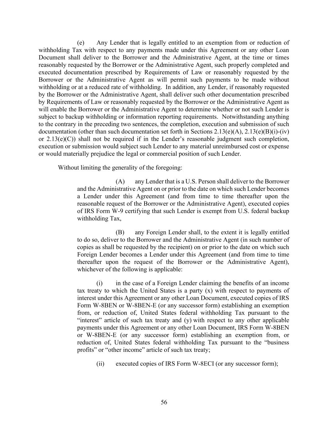 56 (e) Any Lender that is legally entitled to an exemption from or reduction of withholding Tax with respect to any payments made under this Agreement or any other Loan Document shall deliver to the Borrower and the Administrative Agent, at the time or times reasonably requested by the Borrower or the Administrative Agent, such properly completed and executed documentation prescribed by Requirements of Law or reasonably requested by the Borrower or the Administrative Agent as will permit such payments to be made without withholding or at a reduced rate of withholding. In addition, any Lender, if reasonably requested by the Borrower or the Administrative Agent, shall deliver such other documentation prescribed by Requirements of Law or reasonably requested by the Borrower or the Administrative Agent as will enable the Borrower or the Administrative Agent to determine whether or not such Lender is subject to backup withholding or information reporting requirements. Notwithstanding anything to the contrary in the preceding two sentences, the completion, execution and submission of such documentation (other than such documentation set forth in Sections 2.13(e)(A), 2.13(e)(B)(i)-(iv) or 2.13(e)(C)) shall not be required if in the Lender’s reasonable judgment such completion, execution or submission would subject such Lender to any material unreimbursed cost or expense or would materially prejudice the legal or commercial position of such Lender. Without limiting the generality of the foregoing: (A) any Lender that is a U.S. Person shall deliver to the Borrower and the Administrative Agent on or prior to the date on which such Lender becomes a Lender under this Agreement (and from time to time thereafter upon the reasonable request of the Borrower or the Administrative Agent), executed copies of IRS Form W-9 certifying that such Lender is exempt from U.S. federal backup withholding Tax, (B) any Foreign Lender shall, to the extent it is legally entitled to do so, deliver to the Borrower and the Administrative Agent (in such number of copies as shall be requested by the recipient) on or prior to the date on which such Foreign Lender becomes a Lender under this Agreement (and from time to time thereafter upon the request of the Borrower or the Administrative Agent), whichever of the following is applicable: (i) in the case of a Foreign Lender claiming the benefits of an income tax treaty to which the United States is a party (x) with respect to payments of interest under this Agreement or any other Loan Document, executed copies of IRS Form W-8BEN or W-8BEN-E (or any successor form) establishing an exemption from, or reduction of, United States federal withholding Tax pursuant to the “interest” article of such tax treaty and (y) with respect to any other applicable payments under this Agreement or any other Loan Document, IRS Form W-8BEN or W-8BEN-E (or any successor form) establishing an exemption from, or reduction of, United States federal withholding Tax pursuant to the “business profits” or “other income” article of such tax treaty; (ii) executed copies of IRS Form W-8ECI (or any successor form);