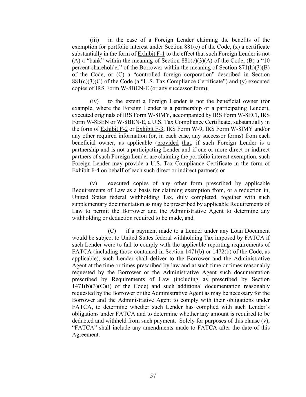 57 (iii) in the case of a Foreign Lender claiming the benefits of the exemption for portfolio interest under Section 881(c) of the Code, (x) a certificate substantially in the form of Exhibit F-1 to the effect that such Foreign Lender is not (A) a “bank” within the meaning of Section 881(c)(3)(A) of the Code, (B) a “10 percent shareholder” of the Borrower within the meaning of Section 871(h)(3)(B) of the Code, or (C) a “controlled foreign corporation” described in Section 881(c)(3)(C) of the Code (a “U.S. Tax Compliance Certificate”) and (y) executed copies of IRS Form W-8BEN-E (or any successor form); (iv) to the extent a Foreign Lender is not the beneficial owner (for example, where the Foreign Lender is a partnership or a participating Lender), executed originals of IRS Form W-8IMY, accompanied by IRS Form W-8ECI, IRS Form W-8BEN or W-8BEN-E, a U.S. Tax Compliance Certificate, substantially in the form of Exhibit F-2 or Exhibit F-3, IRS Form W-9, IRS Form W-8IMY and/or any other required information (or, in each case, any successor forms) from each beneficial owner, as applicable (provided that, if such Foreign Lender is a partnership and is not a participating Lender and if one or more direct or indirect partners of such Foreign Lender are claiming the portfolio interest exemption, such Foreign Lender may provide a U.S. Tax Compliance Certificate in the form of Exhibit F-4 on behalf of each such direct or indirect partner); or (v) executed copies of any other form prescribed by applicable Requirements of Law as a basis for claiming exemption from, or a reduction in, United States federal withholding Tax, duly completed, together with such supplementary documentation as may be prescribed by applicable Requirements of Law to permit the Borrower and the Administrative Agent to determine any withholding or deduction required to be made, and (C) if a payment made to a Lender under any Loan Document would be subject to United States federal withholding Tax imposed by FATCA if such Lender were to fail to comply with the applicable reporting requirements of FATCA (including those contained in Section 1471(b) or 1472(b) of the Code, as applicable), such Lender shall deliver to the Borrower and the Administrative Agent at the time or times prescribed by law and at such time or times reasonably requested by the Borrower or the Administrative Agent such documentation prescribed by Requirements of Law (including as prescribed by Section 1471(b)(3)(C)(i) of the Code) and such additional documentation reasonably requested by the Borrower or the Administrative Agent as may be necessary for the Borrower and the Administrative Agent to comply with their obligations under FATCA, to determine whether such Lender has complied with such Lender’s obligations under FATCA and to determine whether any amount is required to be deducted and withheld from such payment. Solely for purposes of this clause (v), “FATCA” shall include any amendments made to FATCA after the date of this Agreement.
