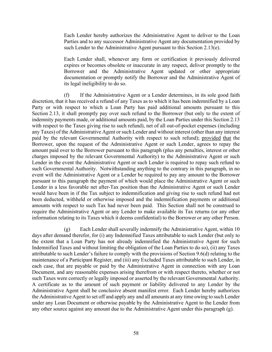 58 Each Lender hereby authorizes the Administrative Agent to deliver to the Loan Parties and to any successor Administrative Agent any documentation provided by such Lender to the Administrative Agent pursuant to this Section 2.13(e). Each Lender shall, whenever any form or certification it previously delivered expires or becomes obsolete or inaccurate in any respect, deliver promptly to the Borrower and the Administrative Agent updated or other appropriate documentation or promptly notify the Borrower and the Administrative Agent of its legal ineligibility to do so. (f) If the Administrative Agent or a Lender determines, in its sole good faith discretion, that it has received a refund of any Taxes as to which it has been indemnified by a Loan Party or with respect to which a Loan Party has paid additional amounts pursuant to this Section 2.13, it shall promptly pay over such refund to the Borrower (but only to the extent of indemnity payments made, or additional amounts paid, by the Loan Parties under this Section 2.13 with respect to the Taxes giving rise to such refund), net of all out-of-pocket expenses (including any Taxes) of the Administrative Agent or such Lender and without interest (other than any interest paid by the relevant Governmental Authority with respect to such refund); provided that the Borrower, upon the request of the Administrative Agent or such Lender, agrees to repay the amount paid over to the Borrower pursuant to this paragraph (plus any penalties, interest or other charges imposed by the relevant Governmental Authority) to the Administrative Agent or such Lender in the event the Administrative Agent or such Lender is required to repay such refund to such Governmental Authority. Notwithstanding anything to the contrary in this paragraph, in no event will the Administrative Agent or a Lender be required to pay any amount to the Borrower pursuant to this paragraph the payment of which would place the Administrative Agent or such Lender in a less favorable net after-Tax position than the Administrative Agent or such Lender would have been in if the Tax subject to indemnification and giving rise to such refund had not been deducted, withheld or otherwise imposed and the indemnification payments or additional amounts with respect to such Tax had never been paid. This Section shall not be construed to require the Administrative Agent or any Lender to make available its Tax returns (or any other information relating to its Taxes which it deems confidential) to the Borrower or any other Person. (g) Each Lender shall severally indemnify the Administrative Agent, within 10 days after demand therefor, for (i) any Indemnified Taxes attributable to such Lender (but only to the extent that a Loan Party has not already indemnified the Administrative Agent for such Indemnified Taxes and without limiting the obligation of the Loan Parties to do so), (ii) any Taxes attributable to such Lender’s failure to comply with the provisions of Section 9.6(d) relating to the maintenance of a Participant Register, and (iii) any Excluded Taxes attributable to such Lender, in each case, that are payable or paid by the Administrative Agent in connection with any Loan Document, and any reasonable expenses arising therefrom or with respect thereto, whether or not such Taxes were correctly or legally imposed or asserted by the relevant Governmental Authority. A certificate as to the amount of such payment or liability delivered to any Lender by the Administrative Agent shall be conclusive absent manifest error. Each Lender hereby authorizes the Administrative Agent to set off and apply any and all amounts at any time owing to such Lender under any Loan Document or otherwise payable by the Administrative Agent to the Lender from any other source against any amount due to the Administrative Agent under this paragraph (g).