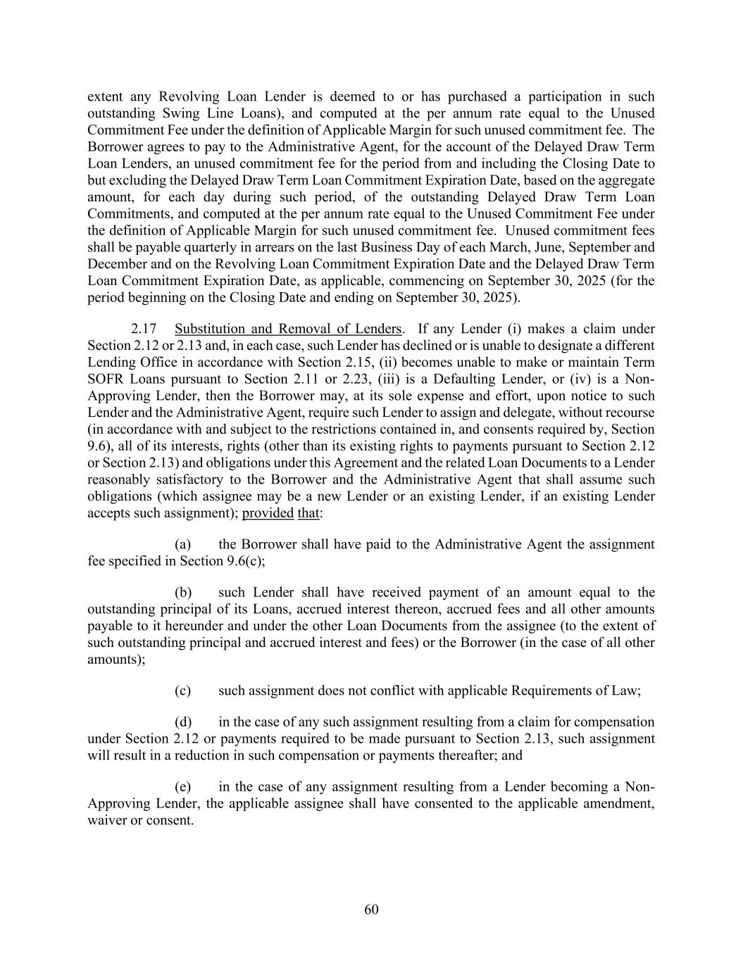 60 extent any Revolving Loan Lender is deemed to or has purchased a participation in such outstanding Swing Line Loans), and computed at the per annum rate equal to the Unused Commitment Fee under the definition of Applicable Margin for such unused commitment fee. The Borrower agrees to pay to the Administrative Agent, for the account of the Delayed Draw Term Loan Lenders, an unused commitment fee for the period from and including the Closing Date to but excluding the Delayed Draw Term Loan Commitment Expiration Date, based on the aggregate amount, for each day during such period, of the outstanding Delayed Draw Term Loan Commitments, and computed at the per annum rate equal to the Unused Commitment Fee under the definition of Applicable Margin for such unused commitment fee. Unused commitment fees shall be payable quarterly in arrears on the last Business Day of each March, June, September and December and on the Revolving Loan Commitment Expiration Date and the Delayed Draw Term Loan Commitment Expiration Date, as applicable, commencing on September 30, 2025 (for the period beginning on the Closing Date and ending on September 30, 2025). 2.17 Substitution and Removal of Lenders. If any Lender (i) makes a claim under Section 2.12 or 2.13 and, in each case, such Lender has declined or is unable to designate a different Lending Office in accordance with Section 2.15, (ii) becomes unable to make or maintain Term SOFR Loans pursuant to Section 2.11 or 2.23, (iii) is a Defaulting Lender, or (iv) is a Non- Approving Lender, then the Borrower may, at its sole expense and effort, upon notice to such Lender and the Administrative Agent, require such Lender to assign and delegate, without recourse (in accordance with and subject to the restrictions contained in, and consents required by, Section 9.6), all of its interests, rights (other than its existing rights to payments pursuant to Section 2.12 or Section 2.13) and obligations under this Agreement and the related Loan Documents to a Lender reasonably satisfactory to the Borrower and the Administrative Agent that shall assume such obligations (which assignee may be a new Lender or an existing Lender, if an existing Lender accepts such assignment); provided that: (a) the Borrower shall have paid to the Administrative Agent the assignment fee specified in Section 9.6(c); (b) such Lender shall have received payment of an amount equal to the outstanding principal of its Loans, accrued interest thereon, accrued fees and all other amounts payable to it hereunder and under the other Loan Documents from the assignee (to the extent of such outstanding principal and accrued interest and fees) or the Borrower (in the case of all other amounts); (c) such assignment does not conflict with applicable Requirements of Law; (d) in the case of any such assignment resulting from a claim for compensation under Section 2.12 or payments required to be made pursuant to Section 2.13, such assignment will result in a reduction in such compensation or payments thereafter; and (e) in the case of any assignment resulting from a Lender becoming a Non- Approving Lender, the applicable assignee shall have consented to the applicable amendment, waiver or consent.