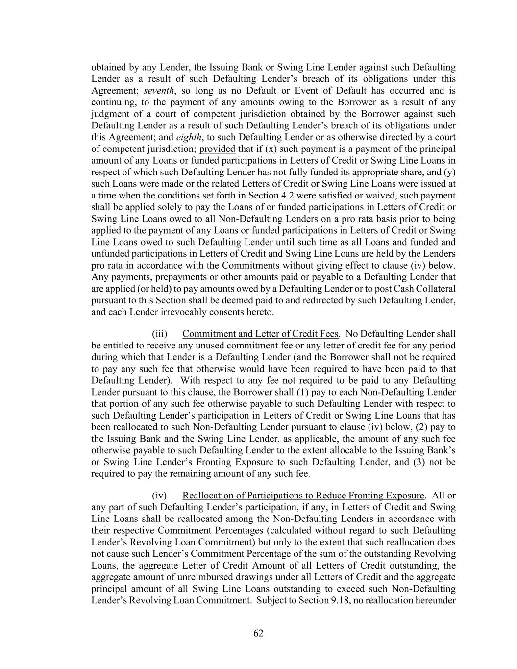 62 obtained by any Lender, the Issuing Bank or Swing Line Lender against such Defaulting Lender as a result of such Defaulting Lender’s breach of its obligations under this Agreement; seventh, so long as no Default or Event of Default has occurred and is continuing, to the payment of any amounts owing to the Borrower as a result of any judgment of a court of competent jurisdiction obtained by the Borrower against such Defaulting Lender as a result of such Defaulting Lender’s breach of its obligations under this Agreement; and eighth, to such Defaulting Lender or as otherwise directed by a court of competent jurisdiction; provided that if (x) such payment is a payment of the principal amount of any Loans or funded participations in Letters of Credit or Swing Line Loans in respect of which such Defaulting Lender has not fully funded its appropriate share, and (y) such Loans were made or the related Letters of Credit or Swing Line Loans were issued at a time when the conditions set forth in Section 4.2 were satisfied or waived, such payment shall be applied solely to pay the Loans of or funded participations in Letters of Credit or Swing Line Loans owed to all Non-Defaulting Lenders on a pro rata basis prior to being applied to the payment of any Loans or funded participations in Letters of Credit or Swing Line Loans owed to such Defaulting Lender until such time as all Loans and funded and unfunded participations in Letters of Credit and Swing Line Loans are held by the Lenders pro rata in accordance with the Commitments without giving effect to clause (iv) below. Any payments, prepayments or other amounts paid or payable to a Defaulting Lender that are applied (or held) to pay amounts owed by a Defaulting Lender or to post Cash Collateral pursuant to this Section shall be deemed paid to and redirected by such Defaulting Lender, and each Lender irrevocably consents hereto. (iii) Commitment and Letter of Credit Fees. No Defaulting Lender shall be entitled to receive any unused commitment fee or any letter of credit fee for any period during which that Lender is a Defaulting Lender (and the Borrower shall not be required to pay any such fee that otherwise would have been required to have been paid to that Defaulting Lender). With respect to any fee not required to be paid to any Defaulting Lender pursuant to this clause, the Borrower shall (1) pay to each Non-Defaulting Lender that portion of any such fee otherwise payable to such Defaulting Lender with respect to such Defaulting Lender’s participation in Letters of Credit or Swing Line Loans that has been reallocated to such Non-Defaulting Lender pursuant to clause (iv) below, (2) pay to the Issuing Bank and the Swing Line Lender, as applicable, the amount of any such fee otherwise payable to such Defaulting Lender to the extent allocable to the Issuing Bank’s or Swing Line Lender’s Fronting Exposure to such Defaulting Lender, and (3) not be required to pay the remaining amount of any such fee. (iv) Reallocation of Participations to Reduce Fronting Exposure. All or any part of such Defaulting Lender’s participation, if any, in Letters of Credit and Swing Line Loans shall be reallocated among the Non-Defaulting Lenders in accordance with their respective Commitment Percentages (calculated without regard to such Defaulting Lender’s Revolving Loan Commitment) but only to the extent that such reallocation does not cause such Lender’s Commitment Percentage of the sum of the outstanding Revolving Loans, the aggregate Letter of Credit Amount of all Letters of Credit outstanding, the aggregate amount of unreimbursed drawings under all Letters of Credit and the aggregate principal amount of all Swing Line Loans outstanding to exceed such Non-Defaulting Lender’s Revolving Loan Commitment. Subject to Section 9.18, no reallocation hereunder