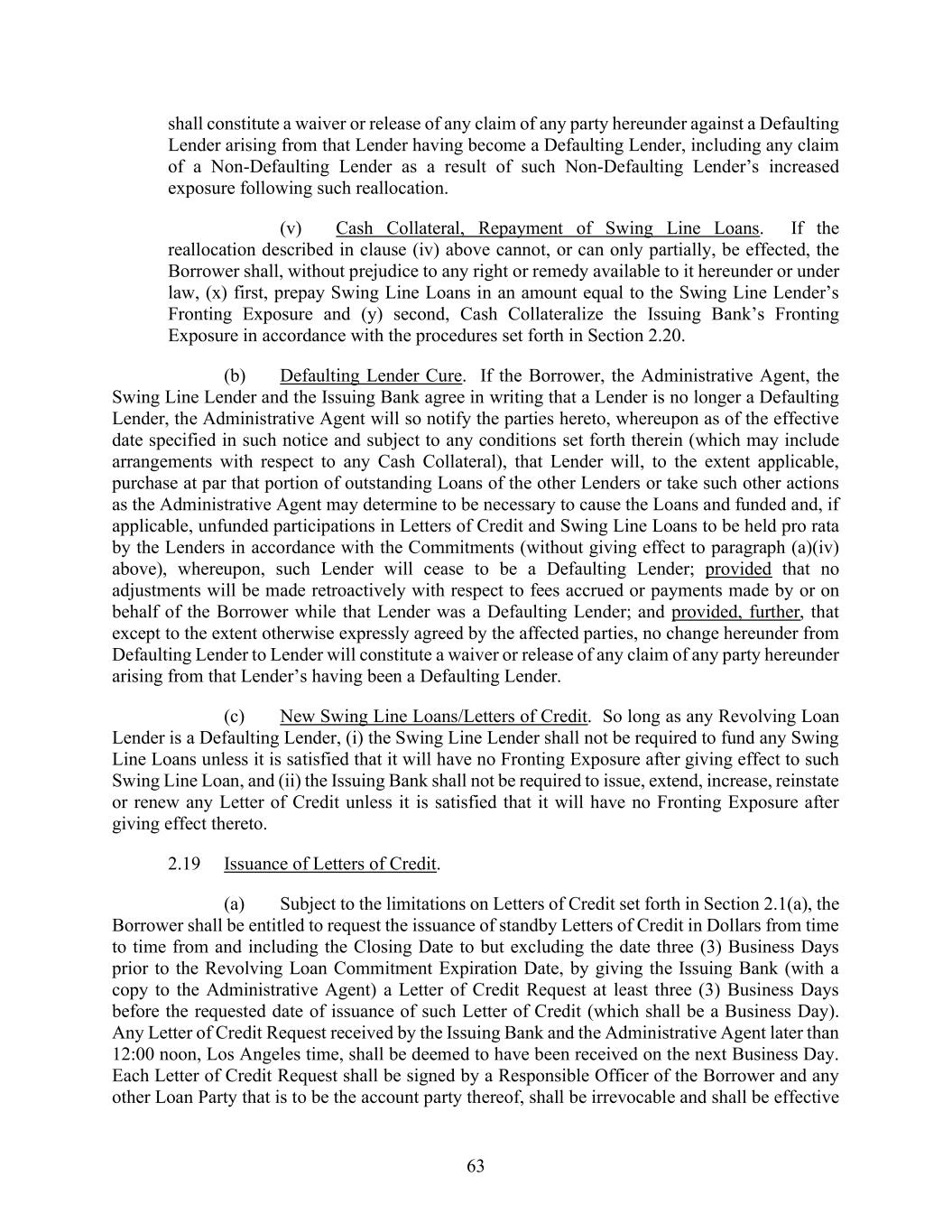 63 shall constitute a waiver or release of any claim of any party hereunder against a Defaulting Lender arising from that Lender having become a Defaulting Lender, including any claim of a Non-Defaulting Lender as a result of such Non-Defaulting Lender’s increased exposure following such reallocation. (v) Cash Collateral, Repayment of Swing Line Loans. If the reallocation described in clause (iv) above cannot, or can only partially, be effected, the Borrower shall, without prejudice to any right or remedy available to it hereunder or under law, (x) first, prepay Swing Line Loans in an amount equal to the Swing Line Lender’s Fronting Exposure and (y) second, Cash Collateralize the Issuing Bank’s Fronting Exposure in accordance with the procedures set forth in Section 2.20. (b) Defaulting Lender Cure. If the Borrower, the Administrative Agent, the Swing Line Lender and the Issuing Bank agree in writing that a Lender is no longer a Defaulting Lender, the Administrative Agent will so notify the parties hereto, whereupon as of the effective date specified in such notice and subject to any conditions set forth therein (which may include arrangements with respect to any Cash Collateral), that Lender will, to the extent applicable, purchase at par that portion of outstanding Loans of the other Lenders or take such other actions as the Administrative Agent may determine to be necessary to cause the Loans and funded and, if applicable, unfunded participations in Letters of Credit and Swing Line Loans to be held pro rata by the Lenders in accordance with the Commitments (without giving effect to paragraph (a)(iv) above), whereupon, such Lender will cease to be a Defaulting Lender; provided that no adjustments will be made retroactively with respect to fees accrued or payments made by or on behalf of the Borrower while that Lender was a Defaulting Lender; and provided, further, that except to the extent otherwise expressly agreed by the affected parties, no change hereunder from Defaulting Lender to Lender will constitute a waiver or release of any claim of any party hereunder arising from that Lender’s having been a Defaulting Lender. (c) New Swing Line Loans/Letters of Credit. So long as any Revolving Loan Lender is a Defaulting Lender, (i) the Swing Line Lender shall not be required to fund any Swing Line Loans unless it is satisfied that it will have no Fronting Exposure after giving effect to such Swing Line Loan, and (ii) the Issuing Bank shall not be required to issue, extend, increase, reinstate or renew any Letter of Credit unless it is satisfied that it will have no Fronting Exposure after giving effect thereto. 2.19 Issuance of Letters of Credit. (a) Subject to the limitations on Letters of Credit set forth in Section 2.1(a), the Borrower shall be entitled to request the issuance of standby Letters of Credit in Dollars from time to time from and including the Closing Date to but excluding the date three (3) Business Days prior to the Revolving Loan Commitment Expiration Date, by giving the Issuing Bank (with a copy to the Administrative Agent) a Letter of Credit Request at least three (3) Business Days before the requested date of issuance of such Letter of Credit (which shall be a Business Day). Any Letter of Credit Request received by the Issuing Bank and the Administrative Agent later than 12:00 noon, Los Angeles time, shall be deemed to have been received on the next Business Day. Each Letter of Credit Request shall be signed by a Responsible Officer of the Borrower and any other Loan Party that is to be the account party thereof, shall be irrevocable and shall be effective