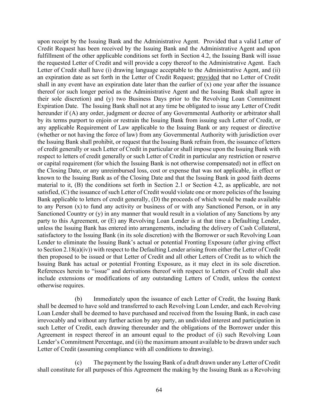 64 upon receipt by the Issuing Bank and the Administrative Agent. Provided that a valid Letter of Credit Request has been received by the Issuing Bank and the Administrative Agent and upon fulfillment of the other applicable conditions set forth in Section 4.2, the Issuing Bank will issue the requested Letter of Credit and will provide a copy thereof to the Administrative Agent. Each Letter of Credit shall have (i) drawing language acceptable to the Administrative Agent, and (ii) an expiration date as set forth in the Letter of Credit Request; provided that no Letter of Credit shall in any event have an expiration date later than the earlier of (x) one year after the issuance thereof (or such longer period as the Administrative Agent and the Issuing Bank shall agree in their sole discretion) and (y) two Business Days prior to the Revolving Loan Commitment Expiration Date. The Issuing Bank shall not at any time be obligated to issue any Letter of Credit hereunder if (A) any order, judgment or decree of any Governmental Authority or arbitrator shall by its terms purport to enjoin or restrain the Issuing Bank from issuing such Letter of Credit, or any applicable Requirement of Law applicable to the Issuing Bank or any request or directive (whether or not having the force of law) from any Governmental Authority with jurisdiction over the Issuing Bank shall prohibit, or request that the Issuing Bank refrain from, the issuance of letters of credit generally or such Letter of Credit in particular or shall impose upon the Issuing Bank with respect to letters of credit generally or such Letter of Credit in particular any restriction or reserve or capital requirement (for which the Issuing Bank is not otherwise compensated) not in effect on the Closing Date, or any unreimbursed loss, cost or expense that was not applicable, in effect or known to the Issuing Bank as of the Closing Date and that the Issuing Bank in good faith deems material to it, (B) the conditions set forth in Section 2.1 or Section 4.2, as applicable, are not satisfied, (C) the issuance of such Letter of Credit would violate one or more policies of the Issuing Bank applicable to letters of credit generally, (D) the proceeds of which would be made available to any Person (x) to fund any activity or business of or with any Sanctioned Person, or in any Sanctioned Country or (y) in any manner that would result in a violation of any Sanctions by any party to this Agreement, or (E) any Revolving Loan Lender is at that time a Defaulting Lender, unless the Issuing Bank has entered into arrangements, including the delivery of Cash Collateral, satisfactory to the Issuing Bank (in its sole discretion) with the Borrower or such Revolving Loan Lender to eliminate the Issuing Bank’s actual or potential Fronting Exposure (after giving effect to Section 2.18(a)(iv)) with respect to the Defaulting Lender arising from either the Letter of Credit then proposed to be issued or that Letter of Credit and all other Letters of Credit as to which the Issuing Bank has actual or potential Fronting Exposure, as it may elect in its sole discretion. References herein to “issue” and derivations thereof with respect to Letters of Credit shall also include extensions or modifications of any outstanding Letters of Credit, unless the context otherwise requires. (b) Immediately upon the issuance of each Letter of Credit, the Issuing Bank shall be deemed to have sold and transferred to each Revolving Loan Lender, and each Revolving Loan Lender shall be deemed to have purchased and received from the Issuing Bank, in each case irrevocably and without any further action by any party, an undivided interest and participation in such Letter of Credit, each drawing thereunder and the obligations of the Borrower under this Agreement in respect thereof in an amount equal to the product of (i) such Revolving Loan Lender’s Commitment Percentage, and (ii) the maximum amount available to be drawn under such Letter of Credit (assuming compliance with all conditions to drawing). (c) The payment by the Issuing Bank of a draft drawn under any Letter of Credit shall constitute for all purposes of this Agreement the making by the Issuing Bank as a Revolving