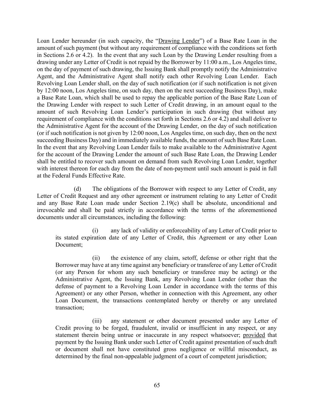 65 Loan Lender hereunder (in such capacity, the “Drawing Lender”) of a Base Rate Loan in the amount of such payment (but without any requirement of compliance with the conditions set forth in Sections 2.6 or 4.2). In the event that any such Loan by the Drawing Lender resulting from a drawing under any Letter of Credit is not repaid by the Borrower by 11:00 a.m., Los Angeles time, on the day of payment of such drawing, the Issuing Bank shall promptly notify the Administrative Agent, and the Administrative Agent shall notify each other Revolving Loan Lender. Each Revolving Loan Lender shall, on the day of such notification (or if such notification is not given by 12:00 noon, Los Angeles time, on such day, then on the next succeeding Business Day), make a Base Rate Loan, which shall be used to repay the applicable portion of the Base Rate Loan of the Drawing Lender with respect to such Letter of Credit drawing, in an amount equal to the amount of such Revolving Loan Lender’s participation in such drawing (but without any requirement of compliance with the conditions set forth in Sections 2.6 or 4.2) and shall deliver to the Administrative Agent for the account of the Drawing Lender, on the day of such notification (or if such notification is not given by 12:00 noon, Los Angeles time, on such day, then on the next succeeding Business Day) and in immediately available funds, the amount of such Base Rate Loan. In the event that any Revolving Loan Lender fails to make available to the Administrative Agent for the account of the Drawing Lender the amount of such Base Rate Loan, the Drawing Lender shall be entitled to recover such amount on demand from such Revolving Loan Lender, together with interest thereon for each day from the date of non-payment until such amount is paid in full at the Federal Funds Effective Rate. (d) The obligations of the Borrower with respect to any Letter of Credit, any Letter of Credit Request and any other agreement or instrument relating to any Letter of Credit and any Base Rate Loan made under Section 2.19(c) shall be absolute, unconditional and irrevocable and shall be paid strictly in accordance with the terms of the aforementioned documents under all circumstances, including the following: (i) any lack of validity or enforceability of any Letter of Credit prior to its stated expiration date of any Letter of Credit, this Agreement or any other Loan Document; (ii) the existence of any claim, setoff, defense or other right that the Borrower may have at any time against any beneficiary or transferee of any Letter of Credit (or any Person for whom any such beneficiary or transferee may be acting) or the Administrative Agent, the Issuing Bank, any Revolving Loan Lender (other than the defense of payment to a Revolving Loan Lender in accordance with the terms of this Agreement) or any other Person, whether in connection with this Agreement, any other Loan Document, the transactions contemplated hereby or thereby or any unrelated transaction; (iii) any statement or other document presented under any Letter of Credit proving to be forged, fraudulent, invalid or insufficient in any respect, or any statement therein being untrue or inaccurate in any respect whatsoever; provided that payment by the Issuing Bank under such Letter of Credit against presentation of such draft or document shall not have constituted gross negligence or willful misconduct, as determined by the final non-appealable judgment of a court of competent jurisdiction;