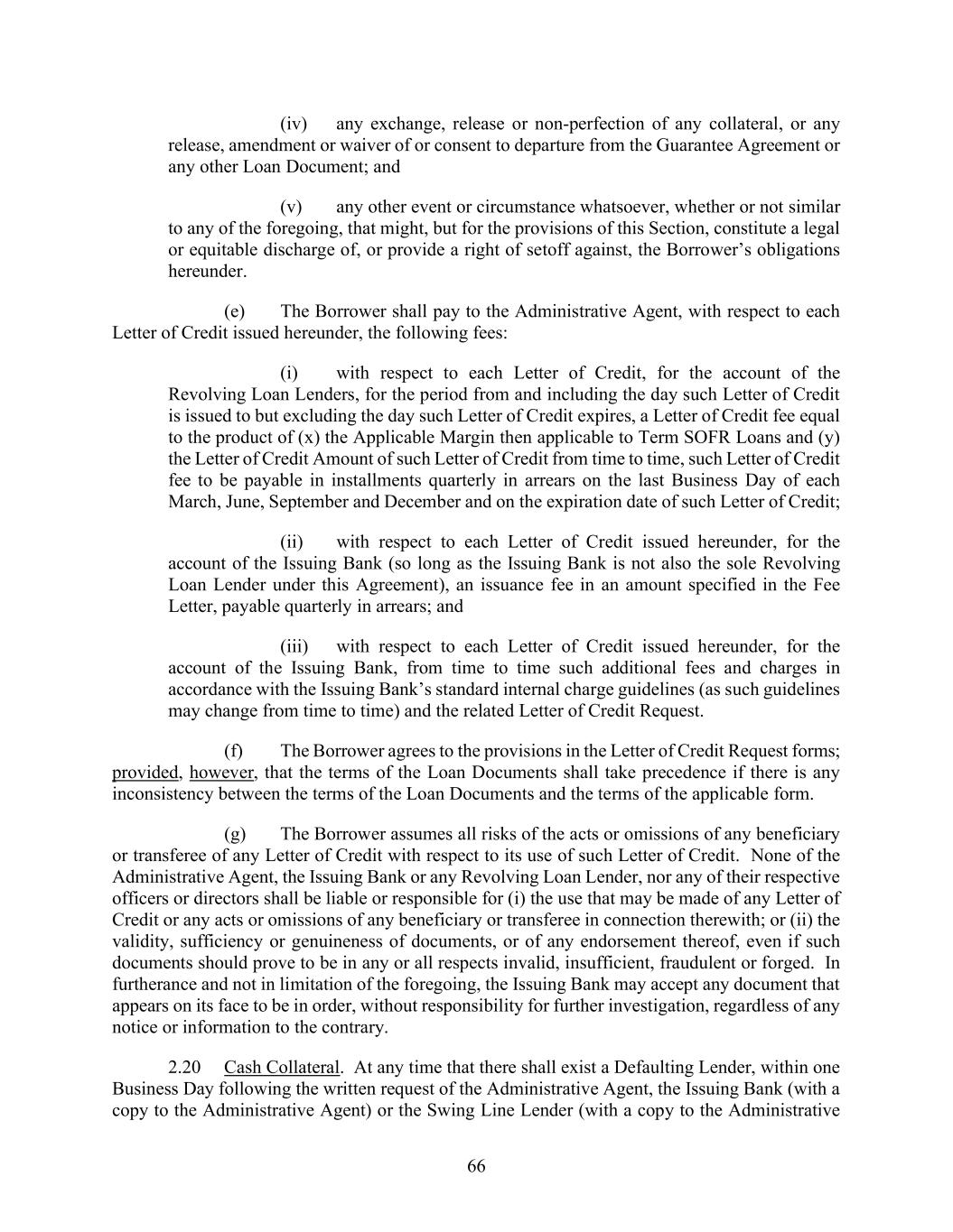 66 (iv) any exchange, release or non-perfection of any collateral, or any release, amendment or waiver of or consent to departure from the Guarantee Agreement or any other Loan Document; and (v) any other event or circumstance whatsoever, whether or not similar to any of the foregoing, that might, but for the provisions of this Section, constitute a legal or equitable discharge of, or provide a right of setoff against, the Borrower’s obligations hereunder. (e) The Borrower shall pay to the Administrative Agent, with respect to each Letter of Credit issued hereunder, the following fees: (i) with respect to each Letter of Credit, for the account of the Revolving Loan Lenders, for the period from and including the day such Letter of Credit is issued to but excluding the day such Letter of Credit expires, a Letter of Credit fee equal to the product of (x) the Applicable Margin then applicable to Term SOFR Loans and (y) the Letter of Credit Amount of such Letter of Credit from time to time, such Letter of Credit fee to be payable in installments quarterly in arrears on the last Business Day of each March, June, September and December and on the expiration date of such Letter of Credit; (ii) with respect to each Letter of Credit issued hereunder, for the account of the Issuing Bank (so long as the Issuing Bank is not also the sole Revolving Loan Lender under this Agreement), an issuance fee in an amount specified in the Fee Letter, payable quarterly in arrears; and (iii) with respect to each Letter of Credit issued hereunder, for the account of the Issuing Bank, from time to time such additional fees and charges in accordance with the Issuing Bank’s standard internal charge guidelines (as such guidelines may change from time to time) and the related Letter of Credit Request. (f) The Borrower agrees to the provisions in the Letter of Credit Request forms; provided, however, that the terms of the Loan Documents shall take precedence if there is any inconsistency between the terms of the Loan Documents and the terms of the applicable form. (g) The Borrower assumes all risks of the acts or omissions of any beneficiary or transferee of any Letter of Credit with respect to its use of such Letter of Credit. None of the Administrative Agent, the Issuing Bank or any Revolving Loan Lender, nor any of their respective officers or directors shall be liable or responsible for (i) the use that may be made of any Letter of Credit or any acts or omissions of any beneficiary or transferee in connection therewith; or (ii) the validity, sufficiency or genuineness of documents, or of any endorsement thereof, even if such documents should prove to be in any or all respects invalid, insufficient, fraudulent or forged. In furtherance and not in limitation of the foregoing, the Issuing Bank may accept any document that appears on its face to be in order, without responsibility for further investigation, regardless of any notice or information to the contrary. 2.20 Cash Collateral. At any time that there shall exist a Defaulting Lender, within one Business Day following the written request of the Administrative Agent, the Issuing Bank (with a copy to the Administrative Agent) or the Swing Line Lender (with a copy to the Administrative