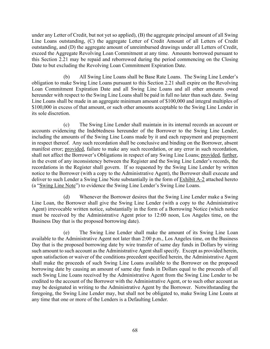 68 under any Letter of Credit, but not yet so applied), (B) the aggregate principal amount of all Swing Line Loans outstanding, (C) the aggregate Letter of Credit Amount of all Letters of Credit outstanding, and (D) the aggregate amount of unreimbursed drawings under all Letters of Credit, exceed the Aggregate Revolving Loan Commitment at any time. Amounts borrowed pursuant to this Section 2.21 may be repaid and reborrowed during the period commencing on the Closing Date to but excluding the Revolving Loan Commitment Expiration Date. (b) All Swing Line Loans shall be Base Rate Loans. The Swing Line Lender’s obligation to make Swing Line Loans pursuant to this Section 2.21 shall expire on the Revolving Loan Commitment Expiration Date and all Swing Line Loans and all other amounts owed hereunder with respect to the Swing Line Loans shall be paid in full no later than such date. Swing Line Loans shall be made in an aggregate minimum amount of $100,000 and integral multiples of $100,000 in excess of that amount, or such other amounts acceptable to the Swing Line Lender in its sole discretion. (c) The Swing Line Lender shall maintain in its internal records an account or accounts evidencing the Indebtedness hereunder of the Borrower to the Swing Line Lender, including the amounts of the Swing Line Loans made by it and each repayment and prepayment in respect thereof. Any such recordation shall be conclusive and binding on the Borrower, absent manifest error; provided, failure to make any such recordation, or any error in such recordation, shall not affect the Borrower’s Obligations in respect of any Swing Line Loans; provided, further, in the event of any inconsistency between the Register and the Swing Line Lender’s records, the recordations in the Register shall govern. If so requested by the Swing Line Lender by written notice to the Borrower (with a copy to the Administrative Agent), the Borrower shall execute and deliver to such Lender a Swing Line Note substantially in the form of Exhibit A-2 attached hereto (a “Swing Line Note”) to evidence the Swing Line Lender’s Swing Line Loans. (d) Whenever the Borrower desires that the Swing Line Lender make a Swing Line Loan, the Borrower shall give the Swing Line Lender (with a copy to the Administrative Agent) irrevocable written notice, substantially in the form of a Borrowing Notice (which notice must be received by the Administrative Agent prior to 12:00 noon, Los Angeles time, on the Business Day that is the proposed borrowing date). (e) The Swing Line Lender shall make the amount of its Swing Line Loan available to the Administrative Agent not later than 2:00 p.m., Los Angeles time, on the Business Day that is the proposed borrowing date by wire transfer of same day funds in Dollars by wiring such amount to such account as the Administrative Agent shall specify. Except as provided herein, upon satisfaction or waiver of the conditions precedent specified herein, the Administrative Agent shall make the proceeds of such Swing Line Loans available to the Borrower on the proposed borrowing date by causing an amount of same day funds in Dollars equal to the proceeds of all such Swing Line Loans received by the Administrative Agent from the Swing Line Lender to be credited to the account of the Borrower with the Administrative Agent, or to such other account as may be designated in writing to the Administrative Agent by the Borrower. Notwithstanding the foregoing, the Swing Line Lender may, but shall not be obligated to, make Swing Line Loans at any time that one or more of the Lenders is a Defaulting Lender.