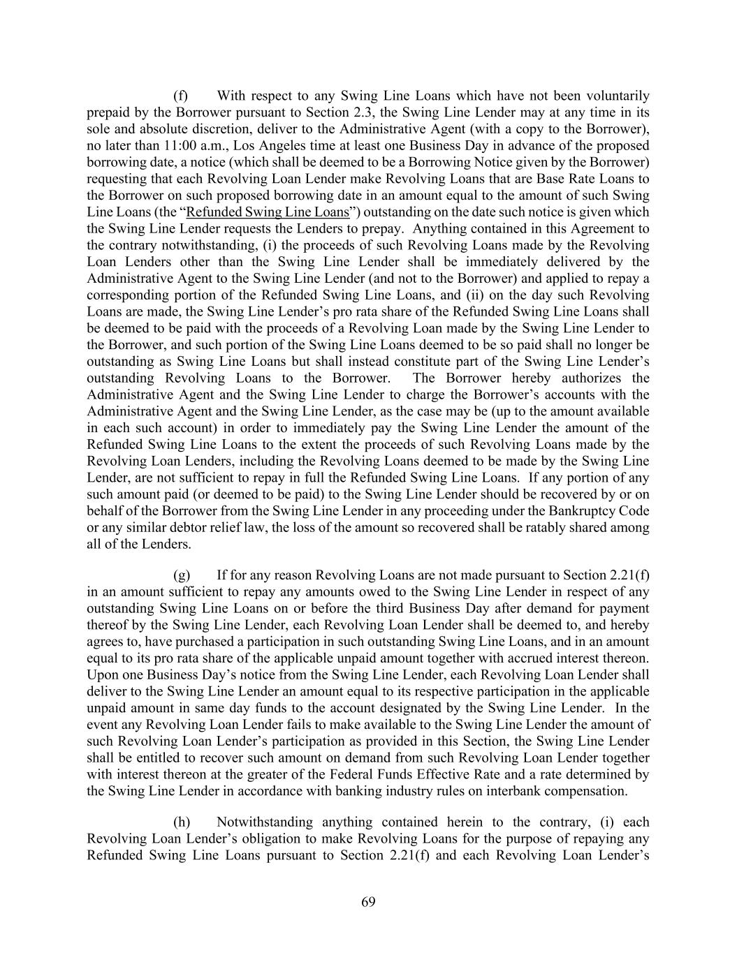 69 (f) With respect to any Swing Line Loans which have not been voluntarily prepaid by the Borrower pursuant to Section 2.3, the Swing Line Lender may at any time in its sole and absolute discretion, deliver to the Administrative Agent (with a copy to the Borrower), no later than 11:00 a.m., Los Angeles time at least one Business Day in advance of the proposed borrowing date, a notice (which shall be deemed to be a Borrowing Notice given by the Borrower) requesting that each Revolving Loan Lender make Revolving Loans that are Base Rate Loans to the Borrower on such proposed borrowing date in an amount equal to the amount of such Swing Line Loans (the “Refunded Swing Line Loans”) outstanding on the date such notice is given which the Swing Line Lender requests the Lenders to prepay. Anything contained in this Agreement to the contrary notwithstanding, (i) the proceeds of such Revolving Loans made by the Revolving Loan Lenders other than the Swing Line Lender shall be immediately delivered by the Administrative Agent to the Swing Line Lender (and not to the Borrower) and applied to repay a corresponding portion of the Refunded Swing Line Loans, and (ii) on the day such Revolving Loans are made, the Swing Line Lender’s pro rata share of the Refunded Swing Line Loans shall be deemed to be paid with the proceeds of a Revolving Loan made by the Swing Line Lender to the Borrower, and such portion of the Swing Line Loans deemed to be so paid shall no longer be outstanding as Swing Line Loans but shall instead constitute part of the Swing Line Lender’s outstanding Revolving Loans to the Borrower. The Borrower hereby authorizes the Administrative Agent and the Swing Line Lender to charge the Borrower’s accounts with the Administrative Agent and the Swing Line Lender, as the case may be (up to the amount available in each such account) in order to immediately pay the Swing Line Lender the amount of the Refunded Swing Line Loans to the extent the proceeds of such Revolving Loans made by the Revolving Loan Lenders, including the Revolving Loans deemed to be made by the Swing Line Lender, are not sufficient to repay in full the Refunded Swing Line Loans. If any portion of any such amount paid (or deemed to be paid) to the Swing Line Lender should be recovered by or on behalf of the Borrower from the Swing Line Lender in any proceeding under the Bankruptcy Code or any similar debtor relief law, the loss of the amount so recovered shall be ratably shared among all of the Lenders. (g) If for any reason Revolving Loans are not made pursuant to Section 2.21(f) in an amount sufficient to repay any amounts owed to the Swing Line Lender in respect of any outstanding Swing Line Loans on or before the third Business Day after demand for payment thereof by the Swing Line Lender, each Revolving Loan Lender shall be deemed to, and hereby agrees to, have purchased a participation in such outstanding Swing Line Loans, and in an amount equal to its pro rata share of the applicable unpaid amount together with accrued interest thereon. Upon one Business Day’s notice from the Swing Line Lender, each Revolving Loan Lender shall deliver to the Swing Line Lender an amount equal to its respective participation in the applicable unpaid amount in same day funds to the account designated by the Swing Line Lender. In the event any Revolving Loan Lender fails to make available to the Swing Line Lender the amount of such Revolving Loan Lender’s participation as provided in this Section, the Swing Line Lender shall be entitled to recover such amount on demand from such Revolving Loan Lender together with interest thereon at the greater of the Federal Funds Effective Rate and a rate determined by the Swing Line Lender in accordance with banking industry rules on interbank compensation. (h) Notwithstanding anything contained herein to the contrary, (i) each Revolving Loan Lender’s obligation to make Revolving Loans for the purpose of repaying any Refunded Swing Line Loans pursuant to Section 2.21(f) and each Revolving Loan Lender’s