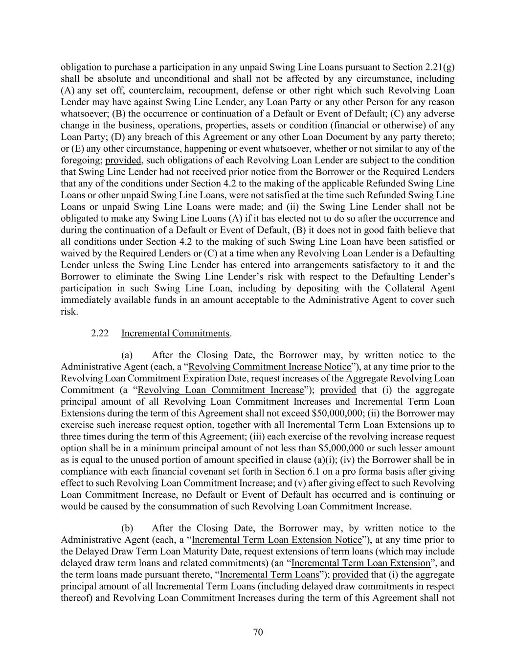 70 obligation to purchase a participation in any unpaid Swing Line Loans pursuant to Section 2.21(g) shall be absolute and unconditional and shall not be affected by any circumstance, including (A) any set off, counterclaim, recoupment, defense or other right which such Revolving Loan Lender may have against Swing Line Lender, any Loan Party or any other Person for any reason whatsoever; (B) the occurrence or continuation of a Default or Event of Default; (C) any adverse change in the business, operations, properties, assets or condition (financial or otherwise) of any Loan Party; (D) any breach of this Agreement or any other Loan Document by any party thereto; or (E) any other circumstance, happening or event whatsoever, whether or not similar to any of the foregoing; provided, such obligations of each Revolving Loan Lender are subject to the condition that Swing Line Lender had not received prior notice from the Borrower or the Required Lenders that any of the conditions under Section 4.2 to the making of the applicable Refunded Swing Line Loans or other unpaid Swing Line Loans, were not satisfied at the time such Refunded Swing Line Loans or unpaid Swing Line Loans were made; and (ii) the Swing Line Lender shall not be obligated to make any Swing Line Loans (A) if it has elected not to do so after the occurrence and during the continuation of a Default or Event of Default, (B) it does not in good faith believe that all conditions under Section 4.2 to the making of such Swing Line Loan have been satisfied or waived by the Required Lenders or (C) at a time when any Revolving Loan Lender is a Defaulting Lender unless the Swing Line Lender has entered into arrangements satisfactory to it and the Borrower to eliminate the Swing Line Lender’s risk with respect to the Defaulting Lender’s participation in such Swing Line Loan, including by depositing with the Collateral Agent immediately available funds in an amount acceptable to the Administrative Agent to cover such risk. 2.22 Incremental Commitments. (a) After the Closing Date, the Borrower may, by written notice to the Administrative Agent (each, a “Revolving Commitment Increase Notice”), at any time prior to the Revolving Loan Commitment Expiration Date, request increases of the Aggregate Revolving Loan Commitment (a “Revolving Loan Commitment Increase”); provided that (i) the aggregate principal amount of all Revolving Loan Commitment Increases and Incremental Term Loan Extensions during the term of this Agreement shall not exceed $50,000,000; (ii) the Borrower may exercise such increase request option, together with all Incremental Term Loan Extensions up to three times during the term of this Agreement; (iii) each exercise of the revolving increase request option shall be in a minimum principal amount of not less than $5,000,000 or such lesser amount as is equal to the unused portion of amount specified in clause (a)(i); (iv) the Borrower shall be in compliance with each financial covenant set forth in Section 6.1 on a pro forma basis after giving effect to such Revolving Loan Commitment Increase; and (v) after giving effect to such Revolving Loan Commitment Increase, no Default or Event of Default has occurred and is continuing or would be caused by the consummation of such Revolving Loan Commitment Increase. (b) After the Closing Date, the Borrower may, by written notice to the Administrative Agent (each, a “Incremental Term Loan Extension Notice”), at any time prior to the Delayed Draw Term Loan Maturity Date, request extensions of term loans (which may include delayed draw term loans and related commitments) (an “Incremental Term Loan Extension”, and the term loans made pursuant thereto, “Incremental Term Loans”); provided that (i) the aggregate principal amount of all Incremental Term Loans (including delayed draw commitments in respect thereof) and Revolving Loan Commitment Increases during the term of this Agreement shall not
