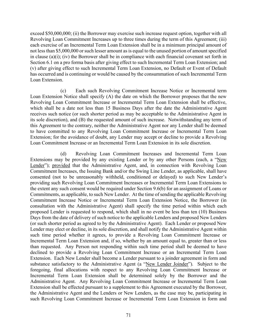 71 exceed $50,000,000; (ii) the Borrower may exercise such increase request option, together with all Revolving Loan Commitment Increases up to three times during the term of this Agreement; (iii) each exercise of an Incremental Term Loan Extension shall be in a minimum principal amount of not less than $5,000,000 or such lesser amount as is equal to the unused portion of amount specified in clause (a)(i); (iv) the Borrower shall be in compliance with each financial covenant set forth in Section 6.1 on a pro forma basis after giving effect to such Incremental Term Loan Extension; and (v) after giving effect to such Incremental Term Loan Extension, no Default or Event of Default has occurred and is continuing or would be caused by the consummation of such Incremental Term Loan Extension. (c) Each such Revolving Commitment Increase Notice or Incremental term Loan Extension Notice shall specify (A) the date on which the Borrower proposes that the new Revolving Loan Commitment Increase or Incremental Term Loan Extension shall be effective, which shall be a date not less than 15 Business Days after the date the Administrative Agent receives such notice (or such shorter period as may be acceptable to the Administrative Agent in its sole discretion), and (B) the requested amount of such increase. Notwithstanding any term of this Agreement to the contrary, neither the Administrative Agent nor any Lender shall be deemed to have committed to any Revolving Loan Commitment Increase or Incremental Term Loan Extension; for the avoidance of doubt, any Lender may accept or decline to provide a Revolving Loan Commitment Increase or an Incremental Term Loan Extension in its sole discretion. (d) Revolving Loan Commitment Increases and Incremental Term Loan Extensions may be provided by any existing Lender or by any other Persons (each, a “New Lender”); provided that the Administrative Agent, and, in connection with Revolving Loan Commitment Increases, the Issuing Bank and/or the Swing Line Lender, as applicable, shall have consented (not to be unreasonably withheld, conditioned or delayed) to such New Lender’s providing such Revolving Loan Commitment Increases or Incremental Term Loan Extensions to the extent any such consent would be required under Section 9.6(b) for an assignment of Loans or Commitments, as applicable, to such New Lender. At the time of sending the applicable Revolving Commitment Increase Notice or Incremental Term Loan Extension Notice, the Borrower (in consultation with the Administrative Agent) shall specify the time period within which each proposed Lender is requested to respond, which shall in no event be less than ten (10) Business Days from the date of delivery of such notice to the applicable Lenders and proposed New Lenders (or such shorter period as agreed to by the Administrative Agent). Each Lender or proposed New Lender may elect or decline, in its sole discretion, and shall notify the Administrative Agent within such time period whether it agrees, to provide a Revolving Loan Commitment Increase or Incremental Term Loan Extension and, if so, whether by an amount equal to, greater than or less than requested. Any Person not responding within such time period shall be deemed to have declined to provide a Revolving Loan Commitment Increase or an Incremental Term Loan Extension. Each New Lender shall become a Lender pursuant to a joinder agreement in form and substance satisfactory to the Administrative Agent (a “New Lender Joinder”). Subject to the foregoing, final allocations with respect to any Revolving Loan Commitment Increase or Incremental Term Loan Extension shall be determined solely by the Borrower and the Administrative Agent. Any Revolving Loan Commitment Increase or Incremental Term Loan Extension shall be effected pursuant to a supplement to this Agreement executed by the Borrower, the Administrative Agent and the Lenders or New Lenders, as the case may be, participating in such Revolving Loan Commitment Increase or Incremental Term Loan Extension in form and
