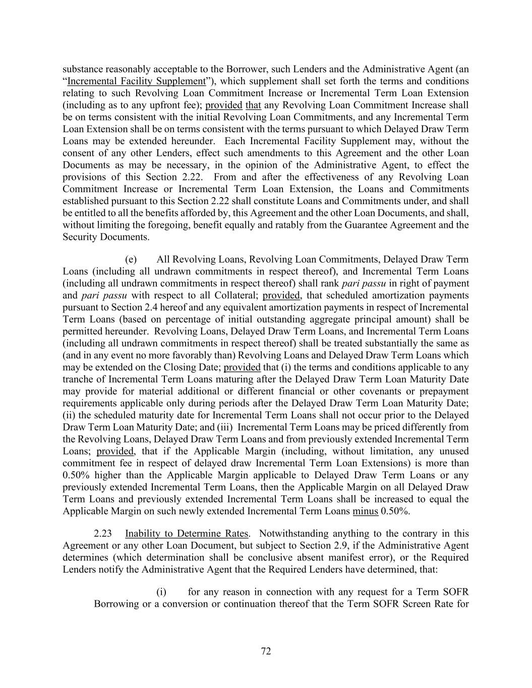 72 substance reasonably acceptable to the Borrower, such Lenders and the Administrative Agent (an “Incremental Facility Supplement”), which supplement shall set forth the terms and conditions relating to such Revolving Loan Commitment Increase or Incremental Term Loan Extension (including as to any upfront fee); provided that any Revolving Loan Commitment Increase shall be on terms consistent with the initial Revolving Loan Commitments, and any Incremental Term Loan Extension shall be on terms consistent with the terms pursuant to which Delayed Draw Term Loans may be extended hereunder. Each Incremental Facility Supplement may, without the consent of any other Lenders, effect such amendments to this Agreement and the other Loan Documents as may be necessary, in the opinion of the Administrative Agent, to effect the provisions of this Section 2.22. From and after the effectiveness of any Revolving Loan Commitment Increase or Incremental Term Loan Extension, the Loans and Commitments established pursuant to this Section 2.22 shall constitute Loans and Commitments under, and shall be entitled to all the benefits afforded by, this Agreement and the other Loan Documents, and shall, without limiting the foregoing, benefit equally and ratably from the Guarantee Agreement and the Security Documents. (e) All Revolving Loans, Revolving Loan Commitments, Delayed Draw Term Loans (including all undrawn commitments in respect thereof), and Incremental Term Loans (including all undrawn commitments in respect thereof) shall rank pari passu in right of payment and pari passu with respect to all Collateral; provided, that scheduled amortization payments pursuant to Section 2.4 hereof and any equivalent amortization payments in respect of Incremental Term Loans (based on percentage of initial outstanding aggregate principal amount) shall be permitted hereunder. Revolving Loans, Delayed Draw Term Loans, and Incremental Term Loans (including all undrawn commitments in respect thereof) shall be treated substantially the same as (and in any event no more favorably than) Revolving Loans and Delayed Draw Term Loans which may be extended on the Closing Date; provided that (i) the terms and conditions applicable to any tranche of Incremental Term Loans maturing after the Delayed Draw Term Loan Maturity Date may provide for material additional or different financial or other covenants or prepayment requirements applicable only during periods after the Delayed Draw Term Loan Maturity Date; (ii) the scheduled maturity date for Incremental Term Loans shall not occur prior to the Delayed Draw Term Loan Maturity Date; and (iii) Incremental Term Loans may be priced differently from the Revolving Loans, Delayed Draw Term Loans and from previously extended Incremental Term Loans; provided, that if the Applicable Margin (including, without limitation, any unused commitment fee in respect of delayed draw Incremental Term Loan Extensions) is more than 0.50% higher than the Applicable Margin applicable to Delayed Draw Term Loans or any previously extended Incremental Term Loans, then the Applicable Margin on all Delayed Draw Term Loans and previously extended Incremental Term Loans shall be increased to equal the Applicable Margin on such newly extended Incremental Term Loans minus 0.50%. 2.23 Inability to Determine Rates. Notwithstanding anything to the contrary in this Agreement or any other Loan Document, but subject to Section 2.9, if the Administrative Agent determines (which determination shall be conclusive absent manifest error), or the Required Lenders notify the Administrative Agent that the Required Lenders have determined, that: (i) for any reason in connection with any request for a Term SOFR Borrowing or a conversion or continuation thereof that the Term SOFR Screen Rate for