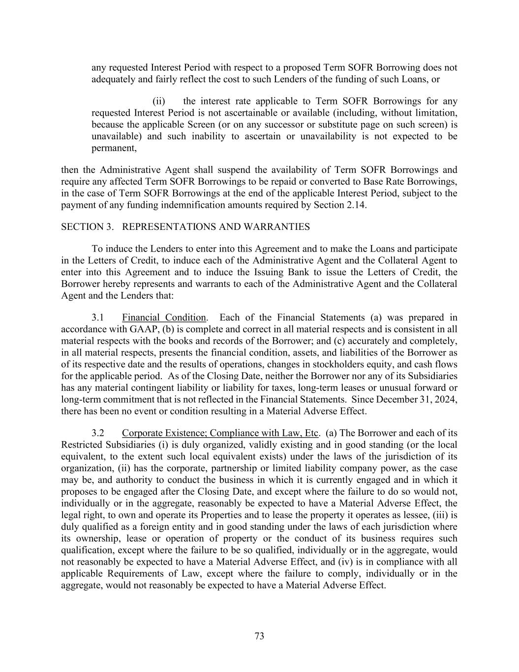 73 any requested Interest Period with respect to a proposed Term SOFR Borrowing does not adequately and fairly reflect the cost to such Lenders of the funding of such Loans, or (ii) the interest rate applicable to Term SOFR Borrowings for any requested Interest Period is not ascertainable or available (including, without limitation, because the applicable Screen (or on any successor or substitute page on such screen) is unavailable) and such inability to ascertain or unavailability is not expected to be permanent, then the Administrative Agent shall suspend the availability of Term SOFR Borrowings and require any affected Term SOFR Borrowings to be repaid or converted to Base Rate Borrowings, in the case of Term SOFR Borrowings at the end of the applicable Interest Period, subject to the payment of any funding indemnification amounts required by Section 2.14. SECTION 3. REPRESENTATIONS AND WARRANTIES To induce the Lenders to enter into this Agreement and to make the Loans and participate in the Letters of Credit, to induce each of the Administrative Agent and the Collateral Agent to enter into this Agreement and to induce the Issuing Bank to issue the Letters of Credit, the Borrower hereby represents and warrants to each of the Administrative Agent and the Collateral Agent and the Lenders that: 3.1 Financial Condition. Each of the Financial Statements (a) was prepared in accordance with GAAP, (b) is complete and correct in all material respects and is consistent in all material respects with the books and records of the Borrower; and (c) accurately and completely, in all material respects, presents the financial condition, assets, and liabilities of the Borrower as of its respective date and the results of operations, changes in stockholders equity, and cash flows for the applicable period. As of the Closing Date, neither the Borrower nor any of its Subsidiaries has any material contingent liability or liability for taxes, long-term leases or unusual forward or long-term commitment that is not reflected in the Financial Statements. Since December 31, 2024, there has been no event or condition resulting in a Material Adverse Effect. 3.2 Corporate Existence; Compliance with Law, Etc. (a) The Borrower and each of its Restricted Subsidiaries (i) is duly organized, validly existing and in good standing (or the local equivalent, to the extent such local equivalent exists) under the laws of the jurisdiction of its organization, (ii) has the corporate, partnership or limited liability company power, as the case may be, and authority to conduct the business in which it is currently engaged and in which it proposes to be engaged after the Closing Date, and except where the failure to do so would not, individually or in the aggregate, reasonably be expected to have a Material Adverse Effect, the legal right, to own and operate its Properties and to lease the property it operates as lessee, (iii) is duly qualified as a foreign entity and in good standing under the laws of each jurisdiction where its ownership, lease or operation of property or the conduct of its business requires such qualification, except where the failure to be so qualified, individually or in the aggregate, would not reasonably be expected to have a Material Adverse Effect, and (iv) is in compliance with all applicable Requirements of Law, except where the failure to comply, individually or in the aggregate, would not reasonably be expected to have a Material Adverse Effect.