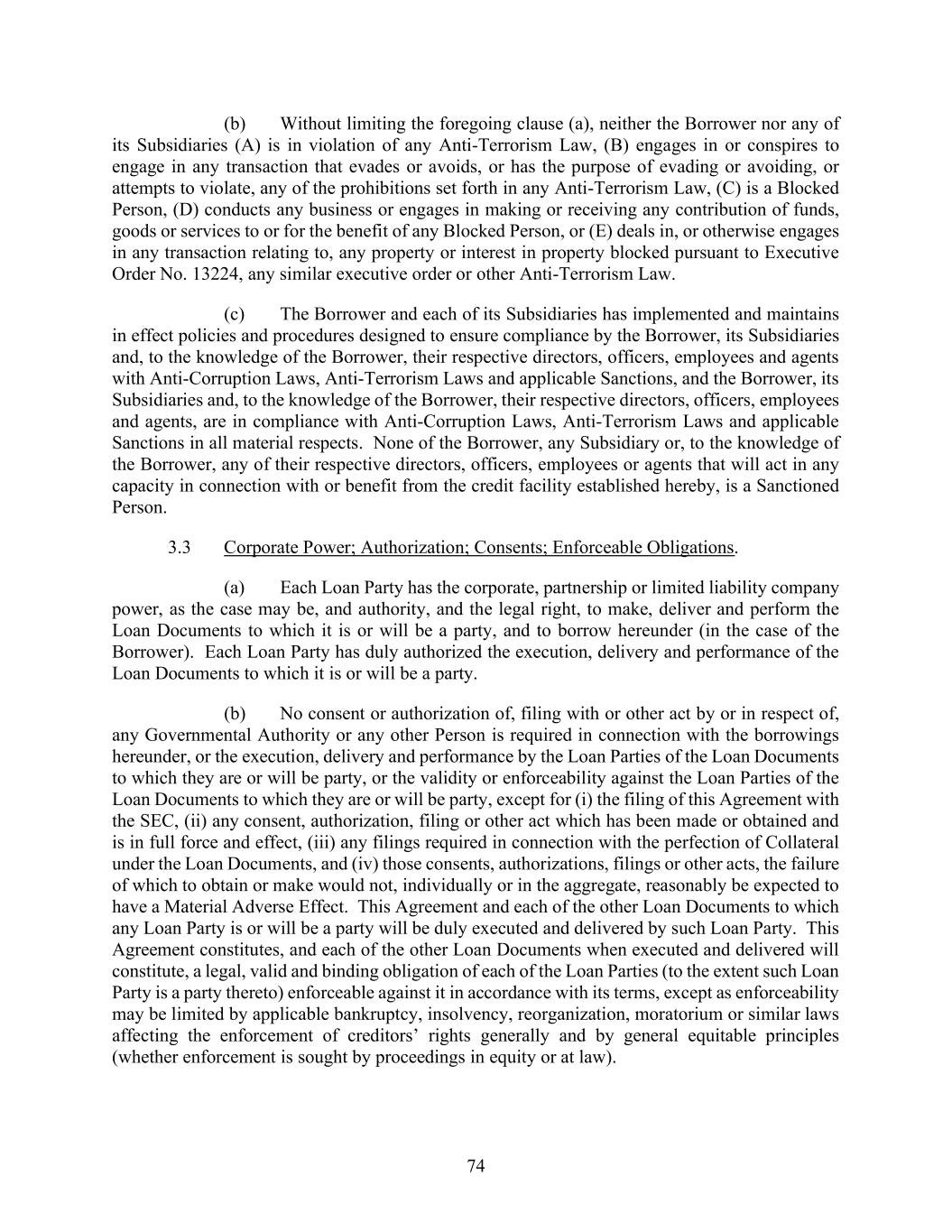 74 (b) Without limiting the foregoing clause (a), neither the Borrower nor any of its Subsidiaries (A) is in violation of any Anti-Terrorism Law, (B) engages in or conspires to engage in any transaction that evades or avoids, or has the purpose of evading or avoiding, or attempts to violate, any of the prohibitions set forth in any Anti-Terrorism Law, (C) is a Blocked Person, (D) conducts any business or engages in making or receiving any contribution of funds, goods or services to or for the benefit of any Blocked Person, or (E) deals in, or otherwise engages in any transaction relating to, any property or interest in property blocked pursuant to Executive Order No. 13224, any similar executive order or other Anti-Terrorism Law. (c) The Borrower and each of its Subsidiaries has implemented and maintains in effect policies and procedures designed to ensure compliance by the Borrower, its Subsidiaries and, to the knowledge of the Borrower, their respective directors, officers, employees and agents with Anti-Corruption Laws, Anti-Terrorism Laws and applicable Sanctions, and the Borrower, its Subsidiaries and, to the knowledge of the Borrower, their respective directors, officers, employees and agents, are in compliance with Anti-Corruption Laws, Anti-Terrorism Laws and applicable Sanctions in all material respects. None of the Borrower, any Subsidiary or, to the knowledge of the Borrower, any of their respective directors, officers, employees or agents that will act in any capacity in connection with or benefit from the credit facility established hereby, is a Sanctioned Person. 3.3 Corporate Power; Authorization; Consents; Enforceable Obligations. (a) Each Loan Party has the corporate, partnership or limited liability company power, as the case may be, and authority, and the legal right, to make, deliver and perform the Loan Documents to which it is or will be a party, and to borrow hereunder (in the case of the Borrower). Each Loan Party has duly authorized the execution, delivery and performance of the Loan Documents to which it is or will be a party. (b) No consent or authorization of, filing with or other act by or in respect of, any Governmental Authority or any other Person is required in connection with the borrowings hereunder, or the execution, delivery and performance by the Loan Parties of the Loan Documents to which they are or will be party, or the validity or enforceability against the Loan Parties of the Loan Documents to which they are or will be party, except for (i) the filing of this Agreement with the SEC, (ii) any consent, authorization, filing or other act which has been made or obtained and is in full force and effect, (iii) any filings required in connection with the perfection of Collateral under the Loan Documents, and (iv) those consents, authorizations, filings or other acts, the failure of which to obtain or make would not, individually or in the aggregate, reasonably be expected to have a Material Adverse Effect. This Agreement and each of the other Loan Documents to which any Loan Party is or will be a party will be duly executed and delivered by such Loan Party. This Agreement constitutes, and each of the other Loan Documents when executed and delivered will constitute, a legal, valid and binding obligation of each of the Loan Parties (to the extent such Loan Party is a party thereto) enforceable against it in accordance with its terms, except as enforceability may be limited by applicable bankruptcy, insolvency, reorganization, moratorium or similar laws affecting the enforcement of creditors’ rights generally and by general equitable principles (whether enforcement is sought by proceedings in equity or at law).