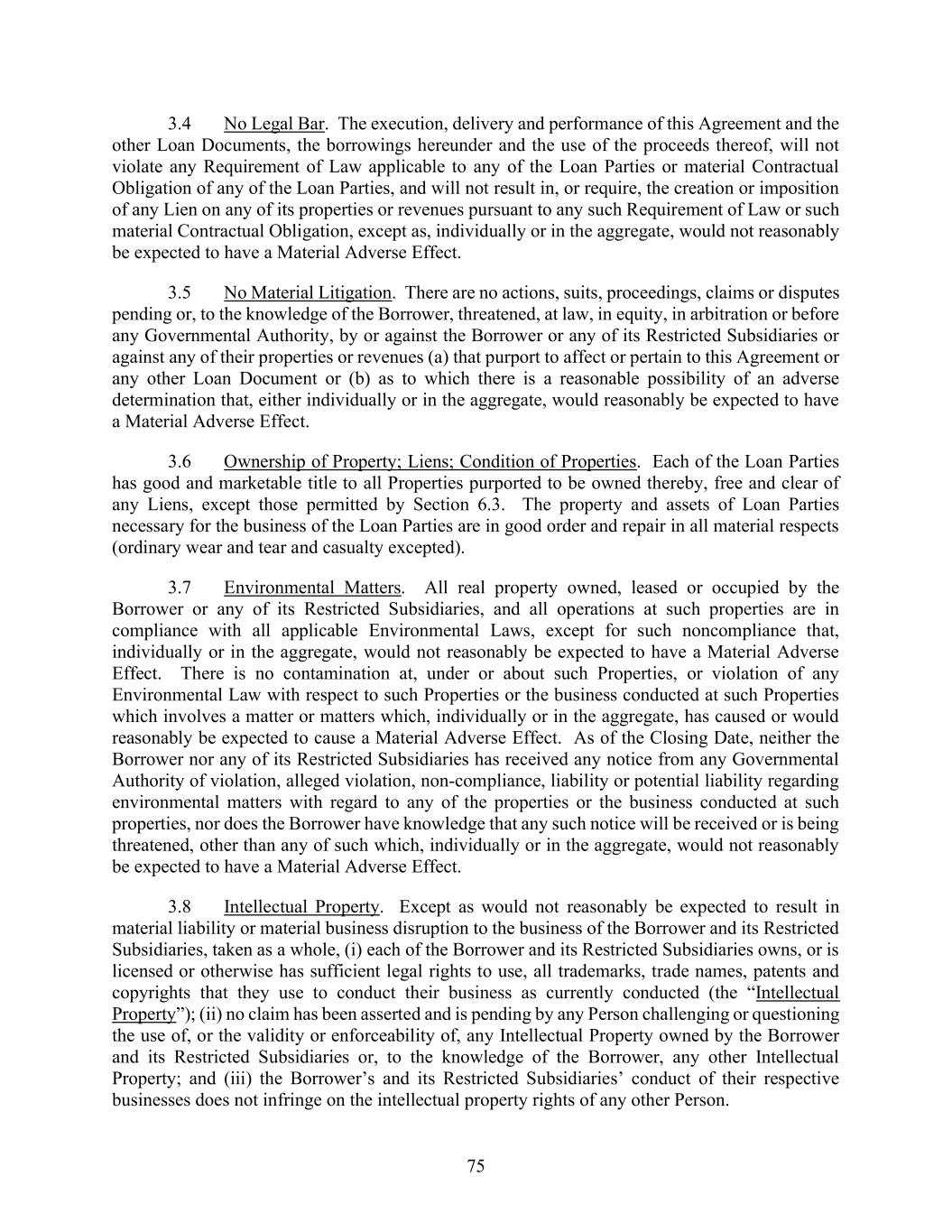 75 3.4 No Legal Bar. The execution, delivery and performance of this Agreement and the other Loan Documents, the borrowings hereunder and the use of the proceeds thereof, will not violate any Requirement of Law applicable to any of the Loan Parties or material Contractual Obligation of any of the Loan Parties, and will not result in, or require, the creation or imposition of any Lien on any of its properties or revenues pursuant to any such Requirement of Law or such material Contractual Obligation, except as, individually or in the aggregate, would not reasonably be expected to have a Material Adverse Effect. 3.5 No Material Litigation. There are no actions, suits, proceedings, claims or disputes pending or, to the knowledge of the Borrower, threatened, at law, in equity, in arbitration or before any Governmental Authority, by or against the Borrower or any of its Restricted Subsidiaries or against any of their properties or revenues (a) that purport to affect or pertain to this Agreement or any other Loan Document or (b) as to which there is a reasonable possibility of an adverse determination that, either individually or in the aggregate, would reasonably be expected to have a Material Adverse Effect. 3.6 Ownership of Property; Liens; Condition of Properties. Each of the Loan Parties has good and marketable title to all Properties purported to be owned thereby, free and clear of any Liens, except those permitted by Section 6.3. The property and assets of Loan Parties necessary for the business of the Loan Parties are in good order and repair in all material respects (ordinary wear and tear and casualty excepted). 3.7 Environmental Matters. All real property owned, leased or occupied by the Borrower or any of its Restricted Subsidiaries, and all operations at such properties are in compliance with all applicable Environmental Laws, except for such noncompliance that, individually or in the aggregate, would not reasonably be expected to have a Material Adverse Effect. There is no contamination at, under or about such Properties, or violation of any Environmental Law with respect to such Properties or the business conducted at such Properties which involves a matter or matters which, individually or in the aggregate, has caused or would reasonably be expected to cause a Material Adverse Effect. As of the Closing Date, neither the Borrower nor any of its Restricted Subsidiaries has received any notice from any Governmental Authority of violation, alleged violation, non-compliance, liability or potential liability regarding environmental matters with regard to any of the properties or the business conducted at such properties, nor does the Borrower have knowledge that any such notice will be received or is being threatened, other than any of such which, individually or in the aggregate, would not reasonably be expected to have a Material Adverse Effect. 3.8 Intellectual Property. Except as would not reasonably be expected to result in material liability or material business disruption to the business of the Borrower and its Restricted Subsidiaries, taken as a whole, (i) each of the Borrower and its Restricted Subsidiaries owns, or is licensed or otherwise has sufficient legal rights to use, all trademarks, trade names, patents and copyrights that they use to conduct their business as currently conducted (the “Intellectual Property”); (ii) no claim has been asserted and is pending by any Person challenging or questioning the use of, or the validity or enforceability of, any Intellectual Property owned by the Borrower and its Restricted Subsidiaries or, to the knowledge of the Borrower, any other Intellectual Property; and (iii) the Borrower’s and its Restricted Subsidiaries’ conduct of their respective businesses does not infringe on the intellectual property rights of any other Person.