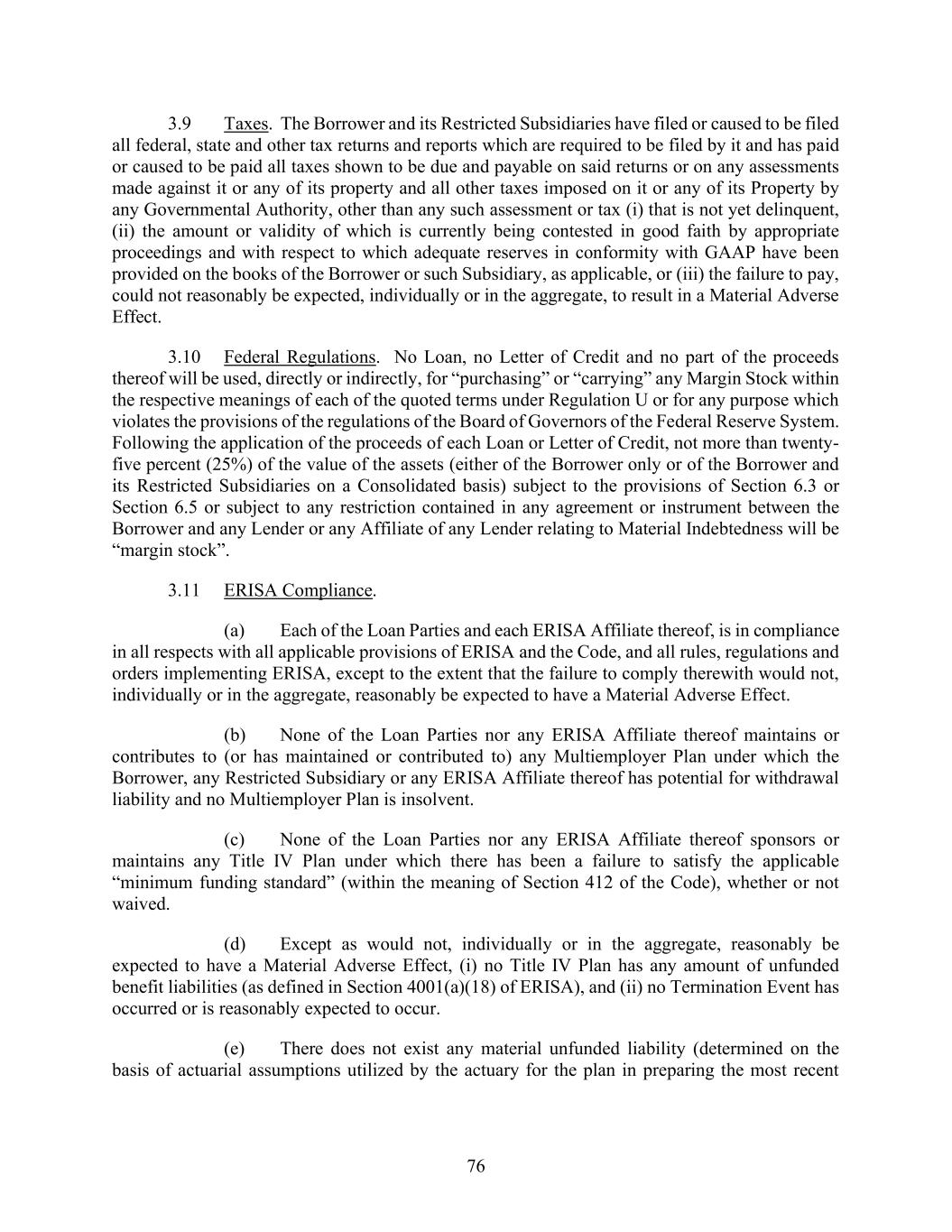 76 3.9 Taxes. The Borrower and its Restricted Subsidiaries have filed or caused to be filed all federal, state and other tax returns and reports which are required to be filed by it and has paid or caused to be paid all taxes shown to be due and payable on said returns or on any assessments made against it or any of its property and all other taxes imposed on it or any of its Property by any Governmental Authority, other than any such assessment or tax (i) that is not yet delinquent, (ii) the amount or validity of which is currently being contested in good faith by appropriate proceedings and with respect to which adequate reserves in conformity with GAAP have been provided on the books of the Borrower or such Subsidiary, as applicable, or (iii) the failure to pay, could not reasonably be expected, individually or in the aggregate, to result in a Material Adverse Effect. 3.10 Federal Regulations. No Loan, no Letter of Credit and no part of the proceeds thereof will be used, directly or indirectly, for “purchasing” or “carrying” any Margin Stock within the respective meanings of each of the quoted terms under Regulation U or for any purpose which violates the provisions of the regulations of the Board of Governors of the Federal Reserve System. Following the application of the proceeds of each Loan or Letter of Credit, not more than twenty- five percent (25%) of the value of the assets (either of the Borrower only or of the Borrower and its Restricted Subsidiaries on a Consolidated basis) subject to the provisions of Section 6.3 or Section 6.5 or subject to any restriction contained in any agreement or instrument between the Borrower and any Lender or any Affiliate of any Lender relating to Material Indebtedness will be “margin stock”. 3.11 ERISA Compliance. (a) Each of the Loan Parties and each ERISA Affiliate thereof, is in compliance in all respects with all applicable provisions of ERISA and the Code, and all rules, regulations and orders implementing ERISA, except to the extent that the failure to comply therewith would not, individually or in the aggregate, reasonably be expected to have a Material Adverse Effect. (b) None of the Loan Parties nor any ERISA Affiliate thereof maintains or contributes to (or has maintained or contributed to) any Multiemployer Plan under which the Borrower, any Restricted Subsidiary or any ERISA Affiliate thereof has potential for withdrawal liability and no Multiemployer Plan is insolvent. (c) None of the Loan Parties nor any ERISA Affiliate thereof sponsors or maintains any Title IV Plan under which there has been a failure to satisfy the applicable “minimum funding standard” (within the meaning of Section 412 of the Code), whether or not waived. (d) Except as would not, individually or in the aggregate, reasonably be expected to have a Material Adverse Effect, (i) no Title IV Plan has any amount of unfunded benefit liabilities (as defined in Section 4001(a)(18) of ERISA), and (ii) no Termination Event has occurred or is reasonably expected to occur. (e) There does not exist any material unfunded liability (determined on the basis of actuarial assumptions utilized by the actuary for the plan in preparing the most recent