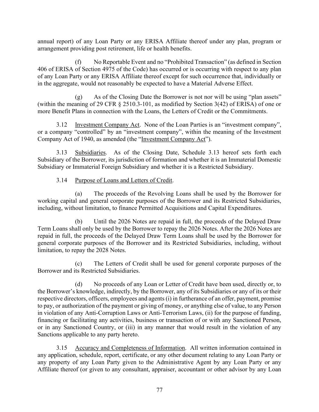 77 annual report) of any Loan Party or any ERISA Affiliate thereof under any plan, program or arrangement providing post retirement, life or health benefits. (f) No Reportable Event and no “Prohibited Transaction” (as defined in Section 406 of ERISA of Section 4975 of the Code) has occurred or is occurring with respect to any plan of any Loan Party or any ERISA Affiliate thereof except for such occurrence that, individually or in the aggregate, would not reasonably be expected to have a Material Adverse Effect. (g) As of the Closing Date the Borrower is not nor will be using “plan assets” (within the meaning of 29 CFR § 2510.3-101, as modified by Section 3(42) of ERISA) of one or more Benefit Plans in connection with the Loans, the Letters of Credit or the Commitments. 3.12 Investment Company Act. None of the Loan Parties is an “investment company”, or a company “controlled” by an “investment company”, within the meaning of the Investment Company Act of 1940, as amended (the “Investment Company Act”). 3.13 Subsidiaries. As of the Closing Date, Schedule 3.13 hereof sets forth each Subsidiary of the Borrower, its jurisdiction of formation and whether it is an Immaterial Domestic Subsidiary or Immaterial Foreign Subsidiary and whether it is a Restricted Subsidiary. 3.14 Purpose of Loans and Letters of Credit. (a) The proceeds of the Revolving Loans shall be used by the Borrower for working capital and general corporate purposes of the Borrower and its Restricted Subsidiaries, including, without limitation, to finance Permitted Acquisitions and Capital Expenditures. (b) Until the 2026 Notes are repaid in full, the proceeds of the Delayed Draw Term Loans shall only be used by the Borrower to repay the 2026 Notes. After the 2026 Notes are repaid in full, the proceeds of the Delayed Draw Term Loans shall be used by the Borrower for general corporate purposes of the Borrower and its Restricted Subsidiaries, including, without limitation, to repay the 2028 Notes. (c) The Letters of Credit shall be used for general corporate purposes of the Borrower and its Restricted Subsidiaries. (d) No proceeds of any Loan or Letter of Credit have been used, directly or, to the Borrower’s knowledge, indirectly, by the Borrower, any of its Subsidiaries or any of its or their respective directors, officers, employees and agents (i) in furtherance of an offer, payment, promise to pay, or authorization of the payment or giving of money, or anything else of value, to any Person in violation of any Anti-Corruption Laws or Anti-Terrorism Laws, (ii) for the purpose of funding, financing or facilitating any activities, business or transaction of or with any Sanctioned Person, or in any Sanctioned Country, or (iii) in any manner that would result in the violation of any Sanctions applicable to any party hereto. 3.15 Accuracy and Completeness of Information. All written information contained in any application, schedule, report, certificate, or any other document relating to any Loan Party or any property of any Loan Party given to the Administrative Agent by any Loan Party or any Affiliate thereof (or given to any consultant, appraiser, accountant or other advisor by any Loan
