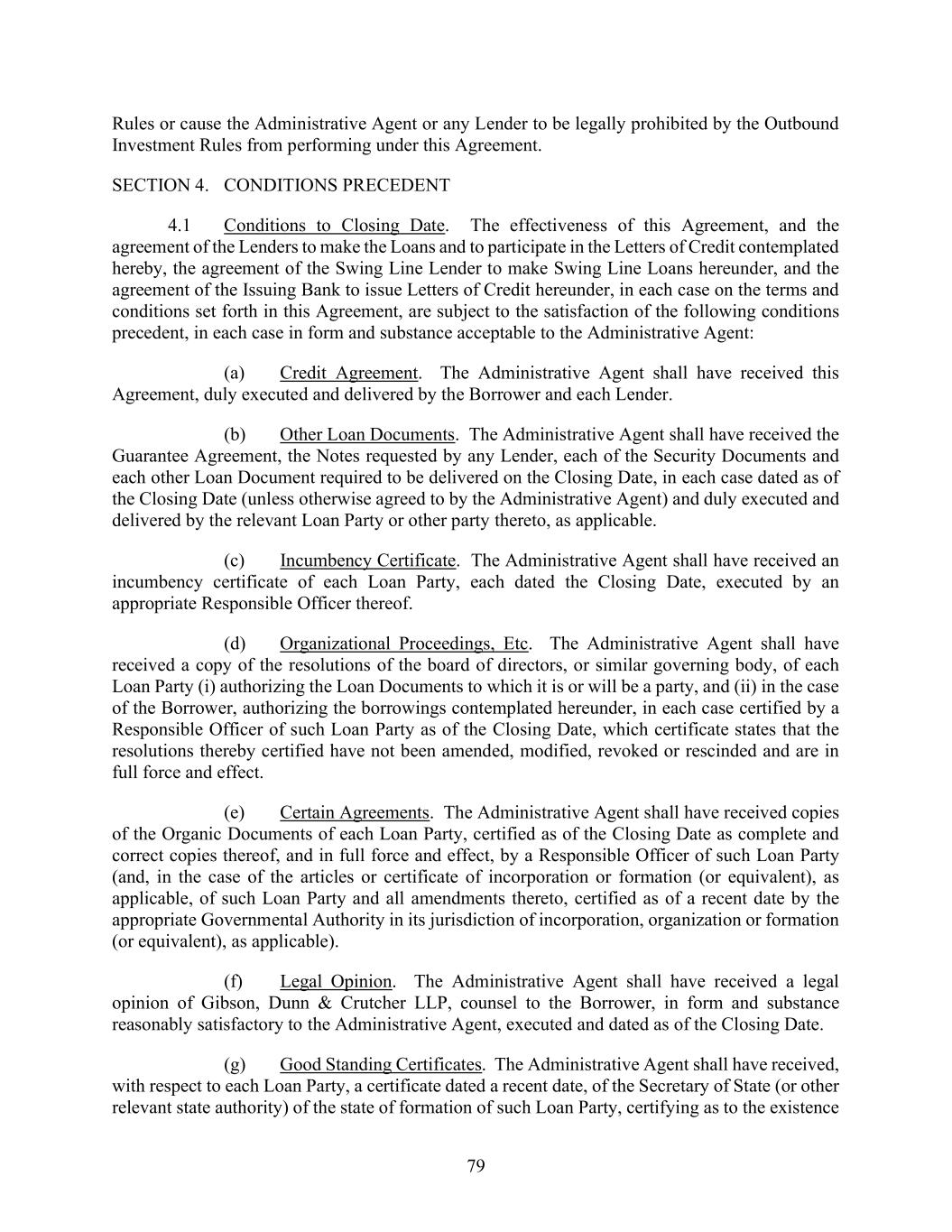 79 Rules or cause the Administrative Agent or any Lender to be legally prohibited by the Outbound Investment Rules from performing under this Agreement. SECTION 4. CONDITIONS PRECEDENT 4.1 Conditions to Closing Date. The effectiveness of this Agreement, and the agreement of the Lenders to make the Loans and to participate in the Letters of Credit contemplated hereby, the agreement of the Swing Line Lender to make Swing Line Loans hereunder, and the agreement of the Issuing Bank to issue Letters of Credit hereunder, in each case on the terms and conditions set forth in this Agreement, are subject to the satisfaction of the following conditions precedent, in each case in form and substance acceptable to the Administrative Agent: (a) Credit Agreement. The Administrative Agent shall have received this Agreement, duly executed and delivered by the Borrower and each Lender. (b) Other Loan Documents. The Administrative Agent shall have received the Guarantee Agreement, the Notes requested by any Lender, each of the Security Documents and each other Loan Document required to be delivered on the Closing Date, in each case dated as of the Closing Date (unless otherwise agreed to by the Administrative Agent) and duly executed and delivered by the relevant Loan Party or other party thereto, as applicable. (c) Incumbency Certificate. The Administrative Agent shall have received an incumbency certificate of each Loan Party, each dated the Closing Date, executed by an appropriate Responsible Officer thereof. (d) Organizational Proceedings, Etc. The Administrative Agent shall have received a copy of the resolutions of the board of directors, or similar governing body, of each Loan Party (i) authorizing the Loan Documents to which it is or will be a party, and (ii) in the case of the Borrower, authorizing the borrowings contemplated hereunder, in each case certified by a Responsible Officer of such Loan Party as of the Closing Date, which certificate states that the resolutions thereby certified have not been amended, modified, revoked or rescinded and are in full force and effect. (e) Certain Agreements. The Administrative Agent shall have received copies of the Organic Documents of each Loan Party, certified as of the Closing Date as complete and correct copies thereof, and in full force and effect, by a Responsible Officer of such Loan Party (and, in the case of the articles or certificate of incorporation or formation (or equivalent), as applicable, of such Loan Party and all amendments thereto, certified as of a recent date by the appropriate Governmental Authority in its jurisdiction of incorporation, organization or formation (or equivalent), as applicable). (f) Legal Opinion. The Administrative Agent shall have received a legal opinion of Gibson, Dunn & Crutcher LLP, counsel to the Borrower, in form and substance reasonably satisfactory to the Administrative Agent, executed and dated as of the Closing Date. (g) Good Standing Certificates. The Administrative Agent shall have received, with respect to each Loan Party, a certificate dated a recent date, of the Secretary of State (or other relevant state authority) of the state of formation of such Loan Party, certifying as to the existence