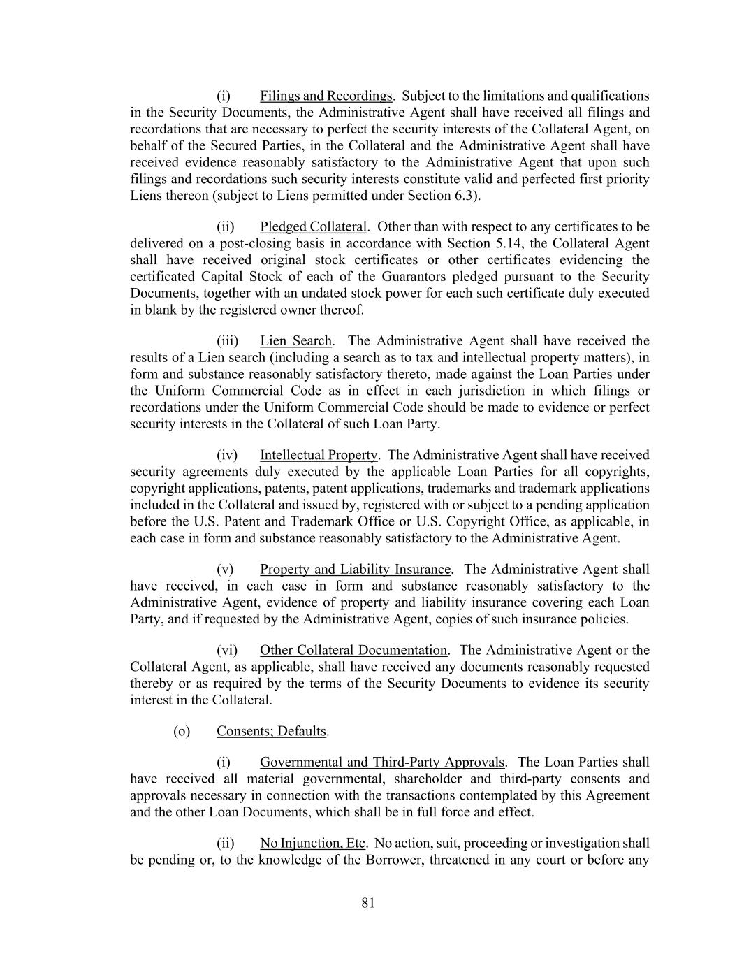 81 (i) Filings and Recordings. Subject to the limitations and qualifications in the Security Documents, the Administrative Agent shall have received all filings and recordations that are necessary to perfect the security interests of the Collateral Agent, on behalf of the Secured Parties, in the Collateral and the Administrative Agent shall have received evidence reasonably satisfactory to the Administrative Agent that upon such filings and recordations such security interests constitute valid and perfected first priority Liens thereon (subject to Liens permitted under Section 6.3). (ii) Pledged Collateral. Other than with respect to any certificates to be delivered on a post-closing basis in accordance with Section 5.14, the Collateral Agent shall have received original stock certificates or other certificates evidencing the certificated Capital Stock of each of the Guarantors pledged pursuant to the Security Documents, together with an undated stock power for each such certificate duly executed in blank by the registered owner thereof. (iii) Lien Search. The Administrative Agent shall have received the results of a Lien search (including a search as to tax and intellectual property matters), in form and substance reasonably satisfactory thereto, made against the Loan Parties under the Uniform Commercial Code as in effect in each jurisdiction in which filings or recordations under the Uniform Commercial Code should be made to evidence or perfect security interests in the Collateral of such Loan Party. (iv) Intellectual Property. The Administrative Agent shall have received security agreements duly executed by the applicable Loan Parties for all copyrights, copyright applications, patents, patent applications, trademarks and trademark applications included in the Collateral and issued by, registered with or subject to a pending application before the U.S. Patent and Trademark Office or U.S. Copyright Office, as applicable, in each case in form and substance reasonably satisfactory to the Administrative Agent. (v) Property and Liability Insurance. The Administrative Agent shall have received, in each case in form and substance reasonably satisfactory to the Administrative Agent, evidence of property and liability insurance covering each Loan Party, and if requested by the Administrative Agent, copies of such insurance policies. (vi) Other Collateral Documentation. The Administrative Agent or the Collateral Agent, as applicable, shall have received any documents reasonably requested thereby or as required by the terms of the Security Documents to evidence its security interest in the Collateral. (o) Consents; Defaults. (i) Governmental and Third-Party Approvals. The Loan Parties shall have received all material governmental, shareholder and third-party consents and approvals necessary in connection with the transactions contemplated by this Agreement and the other Loan Documents, which shall be in full force and effect. (ii) No Injunction, Etc. No action, suit, proceeding or investigation shall be pending or, to the knowledge of the Borrower, threatened in any court or before any