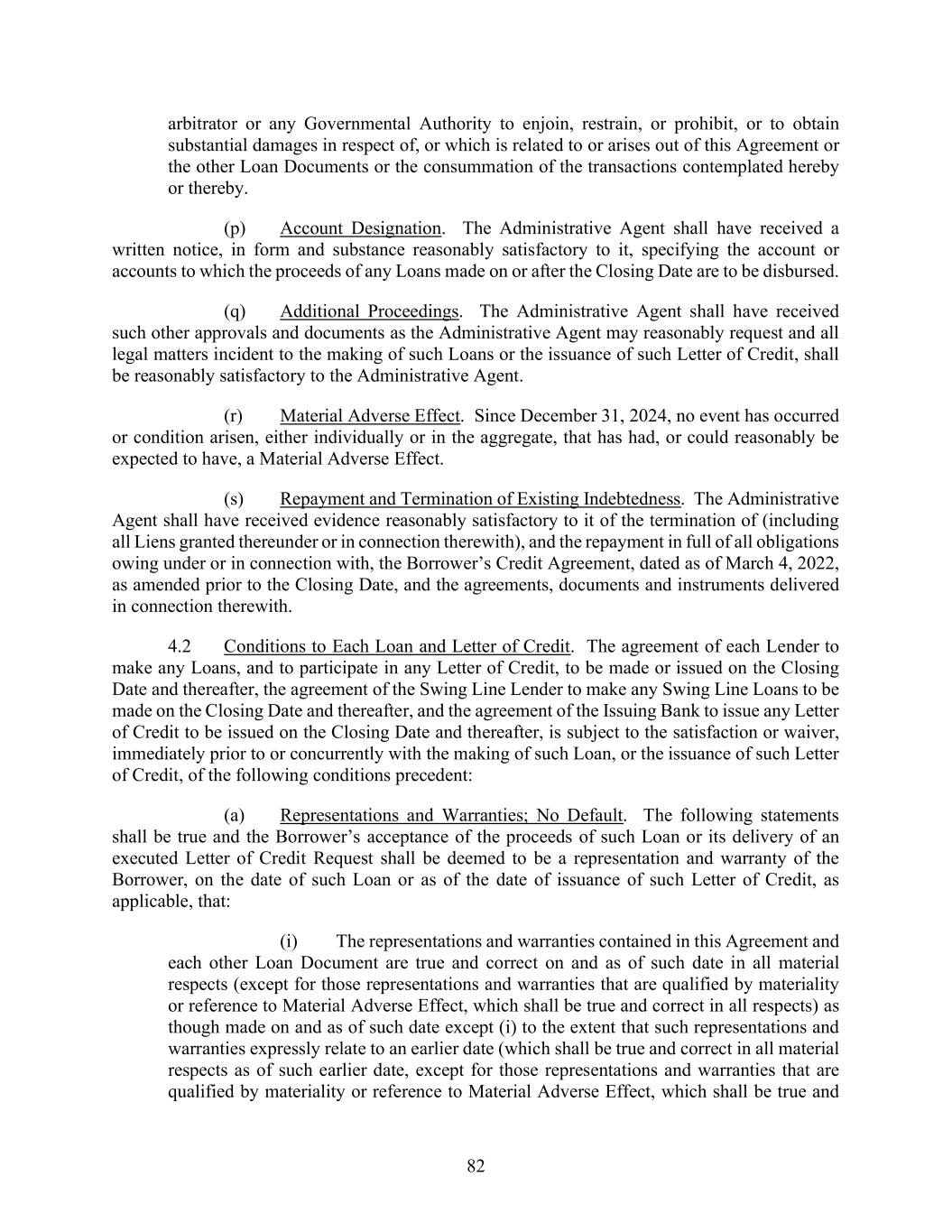 82 arbitrator or any Governmental Authority to enjoin, restrain, or prohibit, or to obtain substantial damages in respect of, or which is related to or arises out of this Agreement or the other Loan Documents or the consummation of the transactions contemplated hereby or thereby. (p) Account Designation. The Administrative Agent shall have received a written notice, in form and substance reasonably satisfactory to it, specifying the account or accounts to which the proceeds of any Loans made on or after the Closing Date are to be disbursed. (q) Additional Proceedings. The Administrative Agent shall have received such other approvals and documents as the Administrative Agent may reasonably request and all legal matters incident to the making of such Loans or the issuance of such Letter of Credit, shall be reasonably satisfactory to the Administrative Agent. (r) Material Adverse Effect. Since December 31, 2024, no event has occurred or condition arisen, either individually or in the aggregate, that has had, or could reasonably be expected to have, a Material Adverse Effect. (s) Repayment and Termination of Existing Indebtedness. The Administrative Agent shall have received evidence reasonably satisfactory to it of the termination of (including all Liens granted thereunder or in connection therewith), and the repayment in full of all obligations owing under or in connection with, the Borrower’s Credit Agreement, dated as of March 4, 2022, as amended prior to the Closing Date, and the agreements, documents and instruments delivered in connection therewith. 4.2 Conditions to Each Loan and Letter of Credit. The agreement of each Lender to make any Loans, and to participate in any Letter of Credit, to be made or issued on the Closing Date and thereafter, the agreement of the Swing Line Lender to make any Swing Line Loans to be made on the Closing Date and thereafter, and the agreement of the Issuing Bank to issue any Letter of Credit to be issued on the Closing Date and thereafter, is subject to the satisfaction or waiver, immediately prior to or concurrently with the making of such Loan, or the issuance of such Letter of Credit, of the following conditions precedent: (a) Representations and Warranties; No Default. The following statements shall be true and the Borrower’s acceptance of the proceeds of such Loan or its delivery of an executed Letter of Credit Request shall be deemed to be a representation and warranty of the Borrower, on the date of such Loan or as of the date of issuance of such Letter of Credit, as applicable, that: (i) The representations and warranties contained in this Agreement and each other Loan Document are true and correct on and as of such date in all material respects (except for those representations and warranties that are qualified by materiality or reference to Material Adverse Effect, which shall be true and correct in all respects) as though made on and as of such date except (i) to the extent that such representations and warranties expressly relate to an earlier date (which shall be true and correct in all material respects as of such earlier date, except for those representations and warranties that are qualified by materiality or reference to Material Adverse Effect, which shall be true and