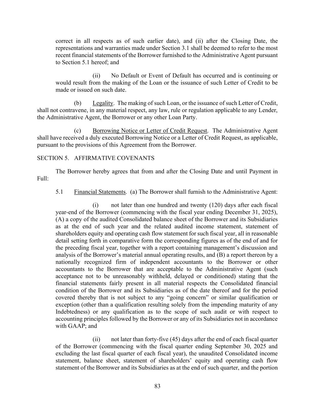 83 correct in all respects as of such earlier date), and (ii) after the Closing Date, the representations and warranties made under Section 3.1 shall be deemed to refer to the most recent financial statements of the Borrower furnished to the Administrative Agent pursuant to Section 5.1 hereof; and (ii) No Default or Event of Default has occurred and is continuing or would result from the making of the Loan or the issuance of such Letter of Credit to be made or issued on such date. (b) Legality. The making of such Loan, or the issuance of such Letter of Credit, shall not contravene, in any material respect, any law, rule or regulation applicable to any Lender, the Administrative Agent, the Borrower or any other Loan Party. (c) Borrowing Notice or Letter of Credit Request. The Administrative Agent shall have received a duly executed Borrowing Notice or a Letter of Credit Request, as applicable, pursuant to the provisions of this Agreement from the Borrower. SECTION 5. AFFIRMATIVE COVENANTS The Borrower hereby agrees that from and after the Closing Date and until Payment in Full: 5.1 Financial Statements. (a) The Borrower shall furnish to the Administrative Agent: (i) not later than one hundred and twenty (120) days after each fiscal year-end of the Borrower (commencing with the fiscal year ending December 31, 2025), (A) a copy of the audited Consolidated balance sheet of the Borrower and its Subsidiaries as at the end of such year and the related audited income statement, statement of shareholders equity and operating cash flow statement for such fiscal year, all in reasonable detail setting forth in comparative form the corresponding figures as of the end of and for the preceding fiscal year, together with a report containing management’s discussion and analysis of the Borrower’s material annual operating results, and (B) a report thereon by a nationally recognized firm of independent accountants to the Borrower or other accountants to the Borrower that are acceptable to the Administrative Agent (such acceptance not to be unreasonably withheld, delayed or conditioned) stating that the financial statements fairly present in all material respects the Consolidated financial condition of the Borrower and its Subsidiaries as of the date thereof and for the period covered thereby that is not subject to any “going concern” or similar qualification or exception (other than a qualification resulting solely from the impending maturity of any Indebtedness) or any qualification as to the scope of such audit or with respect to accounting principles followed by the Borrower or any of its Subsidiaries not in accordance with GAAP; and (ii) not later than forty-five (45) days after the end of each fiscal quarter of the Borrower (commencing with the fiscal quarter ending September 30, 2025 and excluding the last fiscal quarter of each fiscal year), the unaudited Consolidated income statement, balance sheet, statement of shareholders’ equity and operating cash flow statement of the Borrower and its Subsidiaries as at the end of such quarter, and the portion