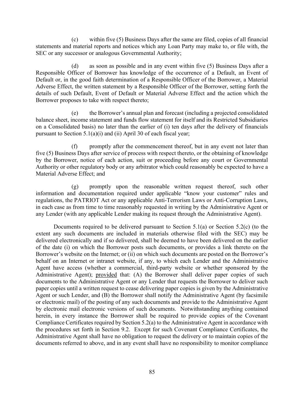 85 (c) within five (5) Business Days after the same are filed, copies of all financial statements and material reports and notices which any Loan Party may make to, or file with, the SEC or any successor or analogous Governmental Authority; (d) as soon as possible and in any event within five (5) Business Days after a Responsible Officer of Borrower has knowledge of the occurrence of a Default, an Event of Default or, in the good faith determination of a Responsible Officer of the Borrower, a Material Adverse Effect, the written statement by a Responsible Officer of the Borrower, setting forth the details of such Default, Event of Default or Material Adverse Effect and the action which the Borrower proposes to take with respect thereto; (e) the Borrower’s annual plan and forecast (including a projected consolidated balance sheet, income statement and funds flow statement for itself and its Restricted Subsidiaries on a Consolidated basis) no later than the earlier of (i) ten days after the delivery of financials pursuant to Section 5.1(a)(i) and (ii) April 30 of each fiscal year; (f) promptly after the commencement thereof, but in any event not later than five (5) Business Days after service of process with respect thereto, or the obtaining of knowledge by the Borrower, notice of each action, suit or proceeding before any court or Governmental Authority or other regulatory body or any arbitrator which could reasonably be expected to have a Material Adverse Effect; and (g) promptly upon the reasonable written request thereof, such other information and documentation required under applicable “know your customer” rules and regulations, the PATRIOT Act or any applicable Anti-Terrorism Laws or Anti-Corruption Laws, in each case as from time to time reasonably requested in writing by the Administrative Agent or any Lender (with any applicable Lender making its request through the Administrative Agent). Documents required to be delivered pursuant to Section 5.1(a) or Section 5.2(c) (to the extent any such documents are included in materials otherwise filed with the SEC) may be delivered electronically and if so delivered, shall be deemed to have been delivered on the earlier of the date (i) on which the Borrower posts such documents, or provides a link thereto on the Borrower’s website on the Internet; or (ii) on which such documents are posted on the Borrower’s behalf on an Internet or intranet website, if any, to which each Lender and the Administrative Agent have access (whether a commercial, third-party website or whether sponsored by the Administrative Agent); provided that: (A) the Borrower shall deliver paper copies of such documents to the Administrative Agent or any Lender that requests the Borrower to deliver such paper copies until a written request to cease delivering paper copies is given by the Administrative Agent or such Lender, and (B) the Borrower shall notify the Administrative Agent (by facsimile or electronic mail) of the posting of any such documents and provide to the Administrative Agent by electronic mail electronic versions of such documents. Notwithstanding anything contained herein, in every instance the Borrower shall be required to provide copies of the Covenant Compliance Certificates required by Section 5.2(a) to the Administrative Agent in accordance with the procedures set forth in Section 9.2. Except for such Covenant Compliance Certificates, the Administrative Agent shall have no obligation to request the delivery or to maintain copies of the documents referred to above, and in any event shall have no responsibility to monitor compliance
