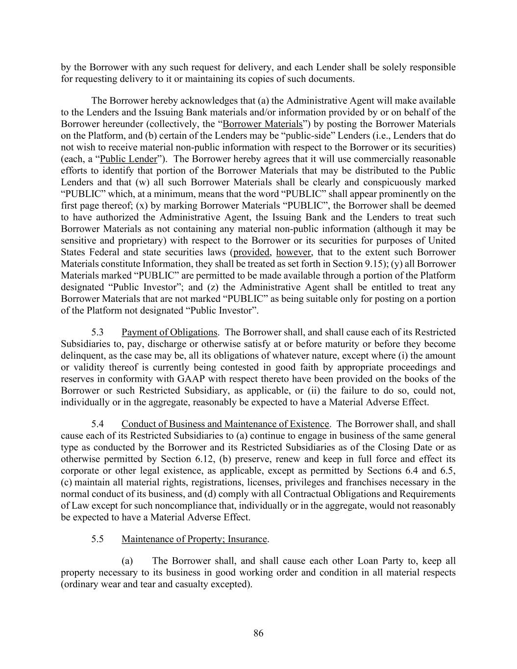 86 by the Borrower with any such request for delivery, and each Lender shall be solely responsible for requesting delivery to it or maintaining its copies of such documents. The Borrower hereby acknowledges that (a) the Administrative Agent will make available to the Lenders and the Issuing Bank materials and/or information provided by or on behalf of the Borrower hereunder (collectively, the “Borrower Materials”) by posting the Borrower Materials on the Platform, and (b) certain of the Lenders may be “public-side” Lenders (i.e., Lenders that do not wish to receive material non-public information with respect to the Borrower or its securities) (each, a “Public Lender”). The Borrower hereby agrees that it will use commercially reasonable efforts to identify that portion of the Borrower Materials that may be distributed to the Public Lenders and that (w) all such Borrower Materials shall be clearly and conspicuously marked “PUBLIC” which, at a minimum, means that the word “PUBLIC” shall appear prominently on the first page thereof; (x) by marking Borrower Materials “PUBLIC”, the Borrower shall be deemed to have authorized the Administrative Agent, the Issuing Bank and the Lenders to treat such Borrower Materials as not containing any material non-public information (although it may be sensitive and proprietary) with respect to the Borrower or its securities for purposes of United States Federal and state securities laws (provided, however, that to the extent such Borrower Materials constitute Information, they shall be treated as set forth in Section 9.15); (y) all Borrower Materials marked “PUBLIC” are permitted to be made available through a portion of the Platform designated “Public Investor”; and (z) the Administrative Agent shall be entitled to treat any Borrower Materials that are not marked “PUBLIC” as being suitable only for posting on a portion of the Platform not designated “Public Investor”. 5.3 Payment of Obligations. The Borrower shall, and shall cause each of its Restricted Subsidiaries to, pay, discharge or otherwise satisfy at or before maturity or before they become delinquent, as the case may be, all its obligations of whatever nature, except where (i) the amount or validity thereof is currently being contested in good faith by appropriate proceedings and reserves in conformity with GAAP with respect thereto have been provided on the books of the Borrower or such Restricted Subsidiary, as applicable, or (ii) the failure to do so, could not, individually or in the aggregate, reasonably be expected to have a Material Adverse Effect. 5.4 Conduct of Business and Maintenance of Existence. The Borrower shall, and shall cause each of its Restricted Subsidiaries to (a) continue to engage in business of the same general type as conducted by the Borrower and its Restricted Subsidiaries as of the Closing Date or as otherwise permitted by Section 6.12, (b) preserve, renew and keep in full force and effect its corporate or other legal existence, as applicable, except as permitted by Sections 6.4 and 6.5, (c) maintain all material rights, registrations, licenses, privileges and franchises necessary in the normal conduct of its business, and (d) comply with all Contractual Obligations and Requirements of Law except for such noncompliance that, individually or in the aggregate, would not reasonably be expected to have a Material Adverse Effect. 5.5 Maintenance of Property; Insurance. (a) The Borrower shall, and shall cause each other Loan Party to, keep all property necessary to its business in good working order and condition in all material respects (ordinary wear and tear and casualty excepted).
