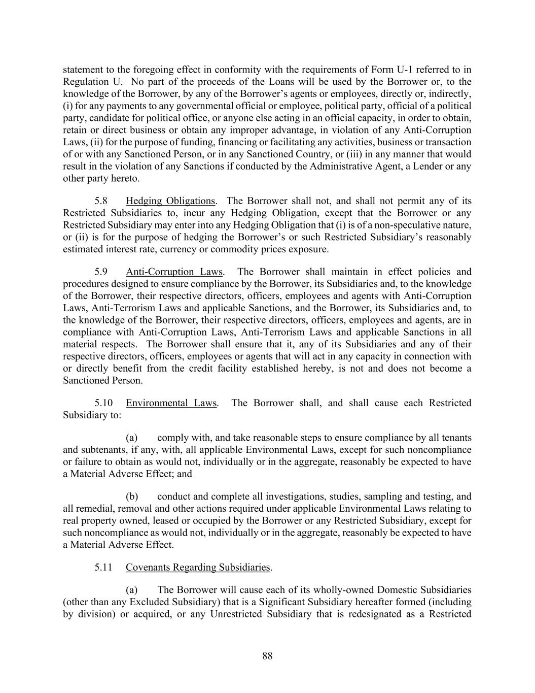 88 statement to the foregoing effect in conformity with the requirements of Form U-1 referred to in Regulation U. No part of the proceeds of the Loans will be used by the Borrower or, to the knowledge of the Borrower, by any of the Borrower’s agents or employees, directly or, indirectly, (i) for any payments to any governmental official or employee, political party, official of a political party, candidate for political office, or anyone else acting in an official capacity, in order to obtain, retain or direct business or obtain any improper advantage, in violation of any Anti-Corruption Laws, (ii) for the purpose of funding, financing or facilitating any activities, business or transaction of or with any Sanctioned Person, or in any Sanctioned Country, or (iii) in any manner that would result in the violation of any Sanctions if conducted by the Administrative Agent, a Lender or any other party hereto. 5.8 Hedging Obligations. The Borrower shall not, and shall not permit any of its Restricted Subsidiaries to, incur any Hedging Obligation, except that the Borrower or any Restricted Subsidiary may enter into any Hedging Obligation that (i) is of a non-speculative nature, or (ii) is for the purpose of hedging the Borrower’s or such Restricted Subsidiary’s reasonably estimated interest rate, currency or commodity prices exposure. 5.9 Anti-Corruption Laws. The Borrower shall maintain in effect policies and procedures designed to ensure compliance by the Borrower, its Subsidiaries and, to the knowledge of the Borrower, their respective directors, officers, employees and agents with Anti-Corruption Laws, Anti-Terrorism Laws and applicable Sanctions, and the Borrower, its Subsidiaries and, to the knowledge of the Borrower, their respective directors, officers, employees and agents, are in compliance with Anti-Corruption Laws, Anti-Terrorism Laws and applicable Sanctions in all material respects. The Borrower shall ensure that it, any of its Subsidiaries and any of their respective directors, officers, employees or agents that will act in any capacity in connection with or directly benefit from the credit facility established hereby, is not and does not become a Sanctioned Person. 5.10 Environmental Laws. The Borrower shall, and shall cause each Restricted Subsidiary to: (a) comply with, and take reasonable steps to ensure compliance by all tenants and subtenants, if any, with, all applicable Environmental Laws, except for such noncompliance or failure to obtain as would not, individually or in the aggregate, reasonably be expected to have a Material Adverse Effect; and (b) conduct and complete all investigations, studies, sampling and testing, and all remedial, removal and other actions required under applicable Environmental Laws relating to real property owned, leased or occupied by the Borrower or any Restricted Subsidiary, except for such noncompliance as would not, individually or in the aggregate, reasonably be expected to have a Material Adverse Effect. 5.11 Covenants Regarding Subsidiaries. (a) The Borrower will cause each of its wholly-owned Domestic Subsidiaries (other than any Excluded Subsidiary) that is a Significant Subsidiary hereafter formed (including by division) or acquired, or any Unrestricted Subsidiary that is redesignated as a Restricted