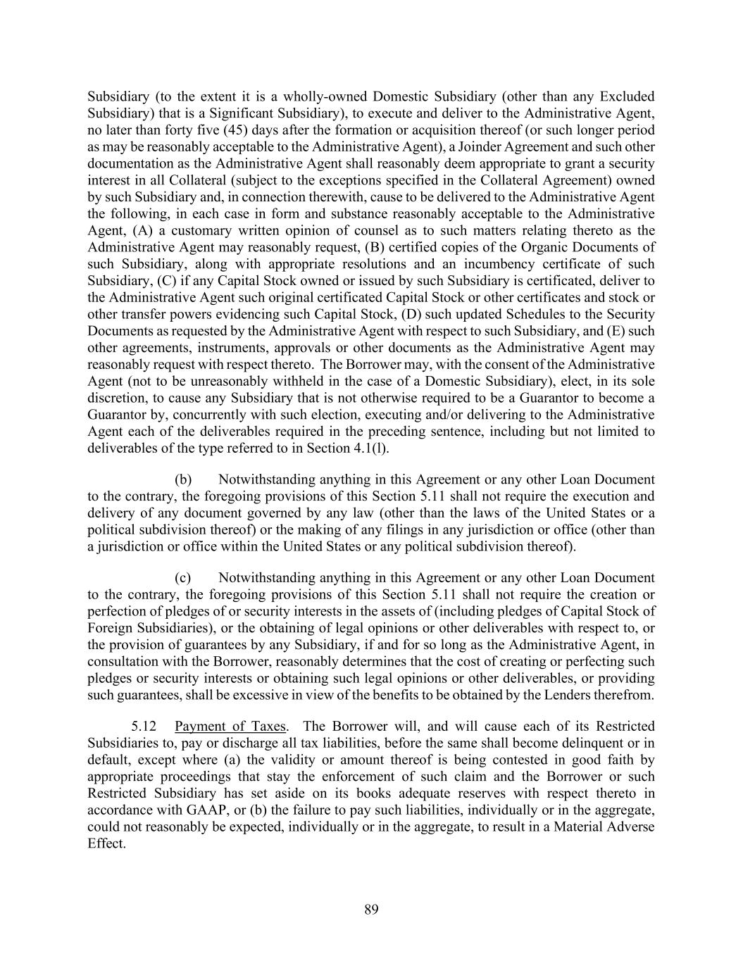 89 Subsidiary (to the extent it is a wholly-owned Domestic Subsidiary (other than any Excluded Subsidiary) that is a Significant Subsidiary), to execute and deliver to the Administrative Agent, no later than forty five (45) days after the formation or acquisition thereof (or such longer period as may be reasonably acceptable to the Administrative Agent), a Joinder Agreement and such other documentation as the Administrative Agent shall reasonably deem appropriate to grant a security interest in all Collateral (subject to the exceptions specified in the Collateral Agreement) owned by such Subsidiary and, in connection therewith, cause to be delivered to the Administrative Agent the following, in each case in form and substance reasonably acceptable to the Administrative Agent, (A) a customary written opinion of counsel as to such matters relating thereto as the Administrative Agent may reasonably request, (B) certified copies of the Organic Documents of such Subsidiary, along with appropriate resolutions and an incumbency certificate of such Subsidiary, (C) if any Capital Stock owned or issued by such Subsidiary is certificated, deliver to the Administrative Agent such original certificated Capital Stock or other certificates and stock or other transfer powers evidencing such Capital Stock, (D) such updated Schedules to the Security Documents as requested by the Administrative Agent with respect to such Subsidiary, and (E) such other agreements, instruments, approvals or other documents as the Administrative Agent may reasonably request with respect thereto. The Borrower may, with the consent of the Administrative Agent (not to be unreasonably withheld in the case of a Domestic Subsidiary), elect, in its sole discretion, to cause any Subsidiary that is not otherwise required to be a Guarantor to become a Guarantor by, concurrently with such election, executing and/or delivering to the Administrative Agent each of the deliverables required in the preceding sentence, including but not limited to deliverables of the type referred to in Section 4.1(l). (b) Notwithstanding anything in this Agreement or any other Loan Document to the contrary, the foregoing provisions of this Section 5.11 shall not require the execution and delivery of any document governed by any law (other than the laws of the United States or a political subdivision thereof) or the making of any filings in any jurisdiction or office (other than a jurisdiction or office within the United States or any political subdivision thereof). (c) Notwithstanding anything in this Agreement or any other Loan Document to the contrary, the foregoing provisions of this Section 5.11 shall not require the creation or perfection of pledges of or security interests in the assets of (including pledges of Capital Stock of Foreign Subsidiaries), or the obtaining of legal opinions or other deliverables with respect to, or the provision of guarantees by any Subsidiary, if and for so long as the Administrative Agent, in consultation with the Borrower, reasonably determines that the cost of creating or perfecting such pledges or security interests or obtaining such legal opinions or other deliverables, or providing such guarantees, shall be excessive in view of the benefits to be obtained by the Lenders therefrom. 5.12 Payment of Taxes. The Borrower will, and will cause each of its Restricted Subsidiaries to, pay or discharge all tax liabilities, before the same shall become delinquent or in default, except where (a) the validity or amount thereof is being contested in good faith by appropriate proceedings that stay the enforcement of such claim and the Borrower or such Restricted Subsidiary has set aside on its books adequate reserves with respect thereto in accordance with GAAP, or (b) the failure to pay such liabilities, individually or in the aggregate, could not reasonably be expected, individually or in the aggregate, to result in a Material Adverse Effect.
