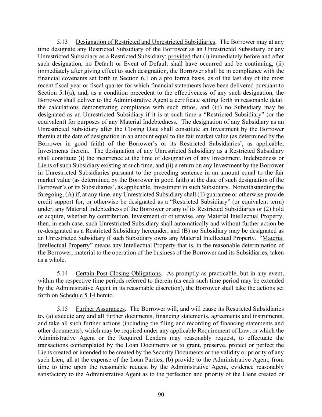 90 5.13 Designation of Restricted and Unrestricted Subsidiaries. The Borrower may at any time designate any Restricted Subsidiary of the Borrower as an Unrestricted Subsidiary or any Unrestricted Subsidiary as a Restricted Subsidiary; provided that (i) immediately before and after such designation, no Default or Event of Default shall have occurred and be continuing, (ii) immediately after giving effect to such designation, the Borrower shall be in compliance with the financial covenants set forth in Section 6.1 on a pro forma basis, as of the last day of the most recent fiscal year or fiscal quarter for which financial statements have been delivered pursuant to Section 5.1(a), and, as a condition precedent to the effectiveness of any such designation, the Borrower shall deliver to the Administrative Agent a certificate setting forth in reasonable detail the calculations demonstrating compliance with such ratios, and (iii) no Subsidiary may be designated as an Unrestricted Subsidiary if it is at such time a “Restricted Subsidiary” (or the equivalent) for purposes of any Material Indebtedness. The designation of any Subsidiary as an Unrestricted Subsidiary after the Closing Date shall constitute an Investment by the Borrower therein at the date of designation in an amount equal to the fair market value (as determined by the Borrower in good faith) of the Borrower’s or its Restricted Subsidiaries’, as applicable, Investments therein. The designation of any Unrestricted Subsidiary as a Restricted Subsidiary shall constitute (i) the incurrence at the time of designation of any Investment, Indebtedness or Liens of such Subsidiary existing at such time, and (ii) a return on any Investment by the Borrower in Unrestricted Subsidiaries pursuant to the preceding sentence in an amount equal to the fair market value (as determined by the Borrower in good faith) at the date of such designation of the Borrower’s or its Subsidiaries’, as applicable, Investment in such Subsidiary. Notwithstanding the foregoing, (A) if, at any time, any Unrestricted Subsidiary shall (1) guarantee or otherwise provide credit support for, or otherwise be designated as a “Restricted Subsidiary” (or equivalent term) under, any Material Indebtedness of the Borrower or any of its Restricted Subsidiaries or (2) hold or acquire, whether by contribution, Investment or otherwise, any Material Intellectual Property, then, in each case, such Unrestricted Subsidiary shall automatically and without further action be re-designated as a Restricted Subsidiary hereunder, and (B) no Subsidiary may be designated as an Unrestricted Subsidiary if such Subsidiary owns any Material Intellectual Property. “Material Intellectual Property” means any Intellectual Property that is, in the reasonable determination of the Borrower, material to the operation of the business of the Borrower and its Subsidiaries, taken as a whole. 5.14 Certain Post-Closing Obligations. As promptly as practicable, but in any event, within the respective time periods referred to therein (as each such time period may be extended by the Administrative Agent in its reasonable discretion), the Borrower shall take the actions set forth on Schedule 5.14 hereto. 5.15 Further Assurances. The Borrower will, and will cause its Restricted Subsidiaries to, (a) execute any and all further documents, financing statements, agreements and instruments, and take all such further actions (including the filing and recording of financing statements and other documents), which may be required under any applicable Requirement of Law, or which the Administrative Agent or the Required Lenders may reasonably request, to effectuate the transactions contemplated by the Loan Documents or to grant, preserve, protect or perfect the Liens created or intended to be created by the Security Documents or the validity or priority of any such Lien, all at the expense of the Loan Parties, (b) provide to the Administrative Agent, from time to time upon the reasonable request by the Administrative Agent, evidence reasonably satisfactory to the Administrative Agent as to the perfection and priority of the Liens created or