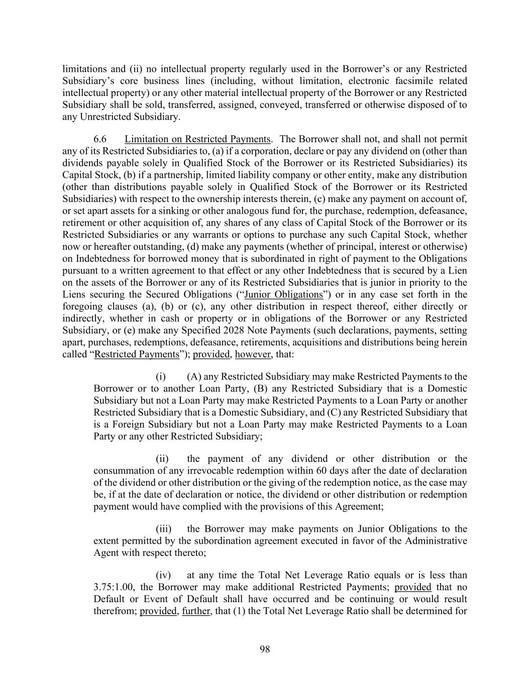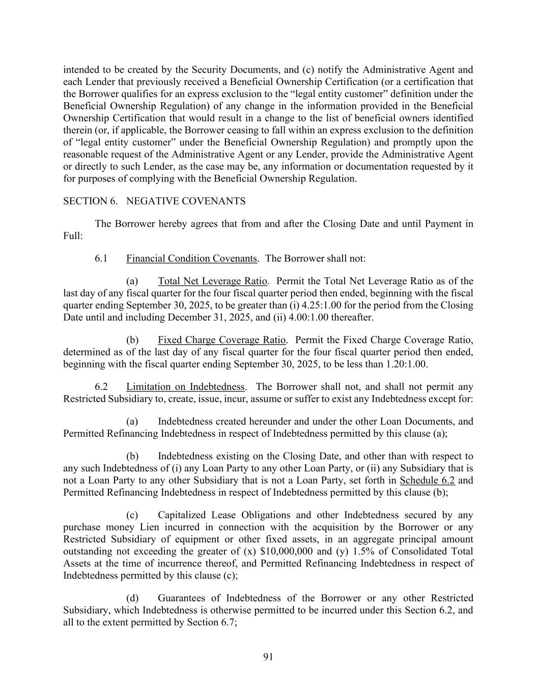 91 intended to be created by the Security Documents, and (c) notify the Administrative Agent and each Lender that previously received a Beneficial Ownership Certification (or a certification that the Borrower qualifies for an express exclusion to the “legal entity customer” definition under the Beneficial Ownership Regulation) of any change in the information provided in the Beneficial Ownership Certification that would result in a change to the list of beneficial owners identified therein (or, if applicable, the Borrower ceasing to fall within an express exclusion to the definition of “legal entity customer” under the Beneficial Ownership Regulation) and promptly upon the reasonable request of the Administrative Agent or any Lender, provide the Administrative Agent or directly to such Lender, as the case may be, any information or documentation requested by it for purposes of complying with the Beneficial Ownership Regulation. SECTION 6. NEGATIVE COVENANTS The Borrower hereby agrees that from and after the Closing Date and until Payment in Full: 6.1 Financial Condition Covenants. The Borrower shall not: (a) Total Net Leverage Ratio. Permit the Total Net Leverage Ratio as of the last day of any fiscal quarter for the four fiscal quarter period then ended, beginning with the fiscal quarter ending September 30, 2025, to be greater than (i) 4.25:1.00 for the period from the Closing Date until and including December 31, 2025, and (ii) 4.00:1.00 thereafter. (b) Fixed Charge Coverage Ratio. Permit the Fixed Charge Coverage Ratio, determined as of the last day of any fiscal quarter for the four fiscal quarter period then ended, beginning with the fiscal quarter ending September 30, 2025, to be less than 1.20:1.00. 6.2 Limitation on Indebtedness. The Borrower shall not, and shall not permit any Restricted Subsidiary to, create, issue, incur, assume or suffer to exist any Indebtedness except for: (a) Indebtedness created hereunder and under the other Loan Documents, and Permitted Refinancing Indebtedness in respect of Indebtedness permitted by this clause (a); (b) Indebtedness existing on the Closing Date, and other than with respect to any such Indebtedness of (i) any Loan Party to any other Loan Party, or (ii) any Subsidiary that is not a Loan Party to any other Subsidiary that is not a Loan Party, set forth in Schedule 6.2 and Permitted Refinancing Indebtedness in respect of Indebtedness permitted by this clause (b); (c) Capitalized Lease Obligations and other Indebtedness secured by any purchase money Lien incurred in connection with the acquisition by the Borrower or any Restricted Subsidiary of equipment or other fixed assets, in an aggregate principal amount outstanding not exceeding the greater of (x) $10,000,000 and (y) 1.5% of Consolidated Total Assets at the time of incurrence thereof, and Permitted Refinancing Indebtedness in respect of Indebtedness permitted by this clause (c); (d) Guarantees of Indebtedness of the Borrower or any other Restricted Subsidiary, which Indebtedness is otherwise permitted to be incurred under this Section 6.2, and all to the extent permitted by Section 6.7;