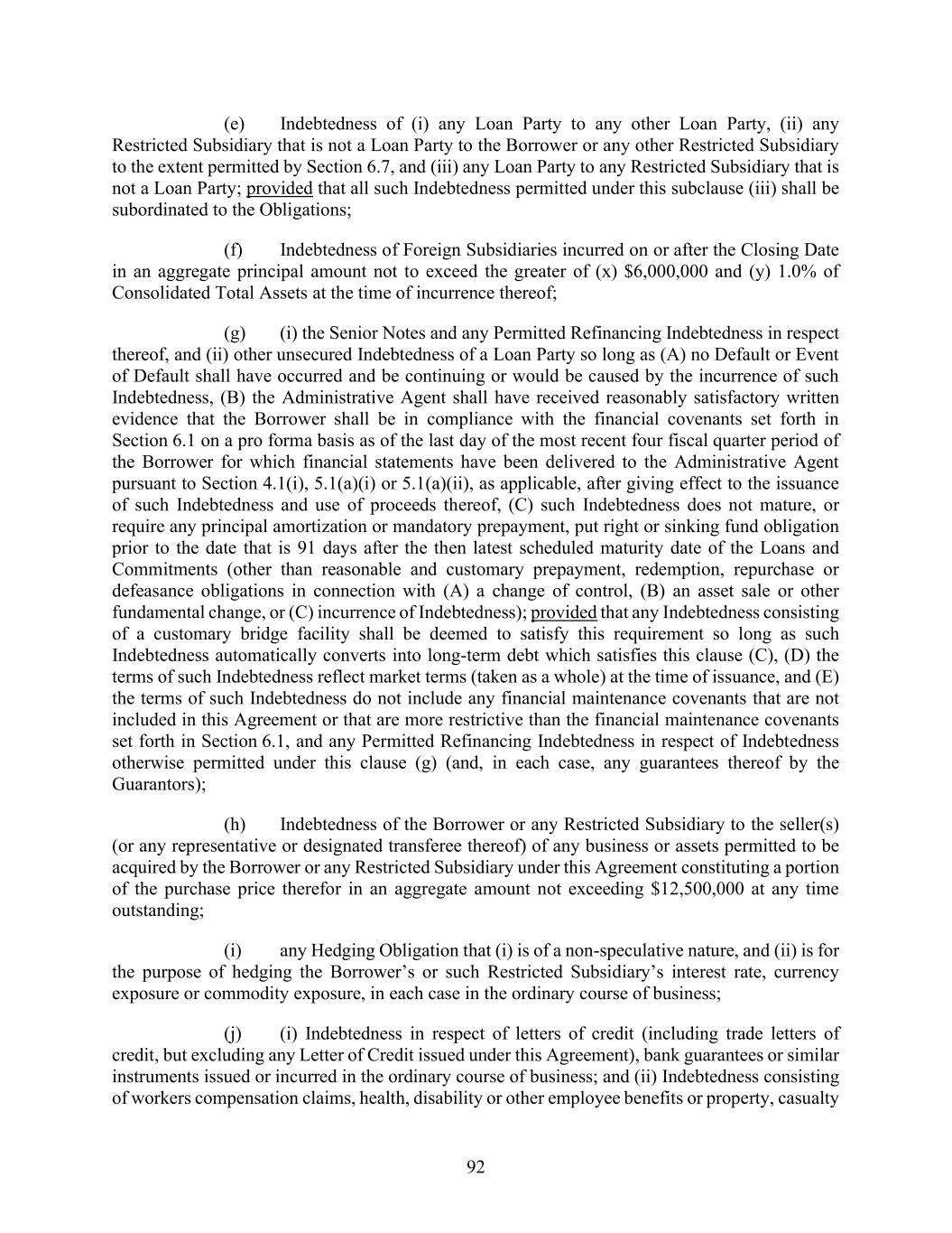 92 (e) Indebtedness of (i) any Loan Party to any other Loan Party, (ii) any Restricted Subsidiary that is not a Loan Party to the Borrower or any other Restricted Subsidiary to the extent permitted by Section 6.7, and (iii) any Loan Party to any Restricted Subsidiary that is not a Loan Party; provided that all such Indebtedness permitted under this subclause (iii) shall be subordinated to the Obligations; (f) Indebtedness of Foreign Subsidiaries incurred on or after the Closing Date in an aggregate principal amount not to exceed the greater of (x) $6,000,000 and (y) 1.0% of Consolidated Total Assets at the time of incurrence thereof; (g) (i) the Senior Notes and any Permitted Refinancing Indebtedness in respect thereof, and (ii) other unsecured Indebtedness of a Loan Party so long as (A) no Default or Event of Default shall have occurred and be continuing or would be caused by the incurrence of such Indebtedness, (B) the Administrative Agent shall have received reasonably satisfactory written evidence that the Borrower shall be in compliance with the financial covenants set forth in Section 6.1 on a pro forma basis as of the last day of the most recent four fiscal quarter period of the Borrower for which financial statements have been delivered to the Administrative Agent pursuant to Section 4.1(i), 5.1(a)(i) or 5.1(a)(ii), as applicable, after giving effect to the issuance of such Indebtedness and use of proceeds thereof, (C) such Indebtedness does not mature, or require any principal amortization or mandatory prepayment, put right or sinking fund obligation prior to the date that is 91 days after the then latest scheduled maturity date of the Loans and Commitments (other than reasonable and customary prepayment, redemption, repurchase or defeasance obligations in connection with (A) a change of control, (B) an asset sale or other fundamental change, or (C) incurrence of Indebtedness); provided that any Indebtedness consisting of a customary bridge facility shall be deemed to satisfy this requirement so long as such Indebtedness automatically converts into long-term debt which satisfies this clause (C), (D) the terms of such Indebtedness reflect market terms (taken as a whole) at the time of issuance, and (E) the terms of such Indebtedness do not include any financial maintenance covenants that are not included in this Agreement or that are more restrictive than the financial maintenance covenants set forth in Section 6.1, and any Permitted Refinancing Indebtedness in respect of Indebtedness otherwise permitted under this clause (g) (and, in each case, any guarantees thereof by the Guarantors); (h) Indebtedness of the Borrower or any Restricted Subsidiary to the seller(s) (or any representative or designated transferee thereof) of any business or assets permitted to be acquired by the Borrower or any Restricted Subsidiary under this Agreement constituting a portion of the purchase price therefor in an aggregate amount not exceeding $12,500,000 at any time outstanding; (i) any Hedging Obligation that (i) is of a non-speculative nature, and (ii) is for the purpose of hedging the Borrower’s or such Restricted Subsidiary’s interest rate, currency exposure or commodity exposure, in each case in the ordinary course of business; (j) (i) Indebtedness in respect of letters of credit (including trade letters of credit, but excluding any Letter of Credit issued under this Agreement), bank guarantees or similar instruments issued or incurred in the ordinary course of business; and (ii) Indebtedness consisting of workers compensation claims, health, disability or other employee benefits or property, casualty