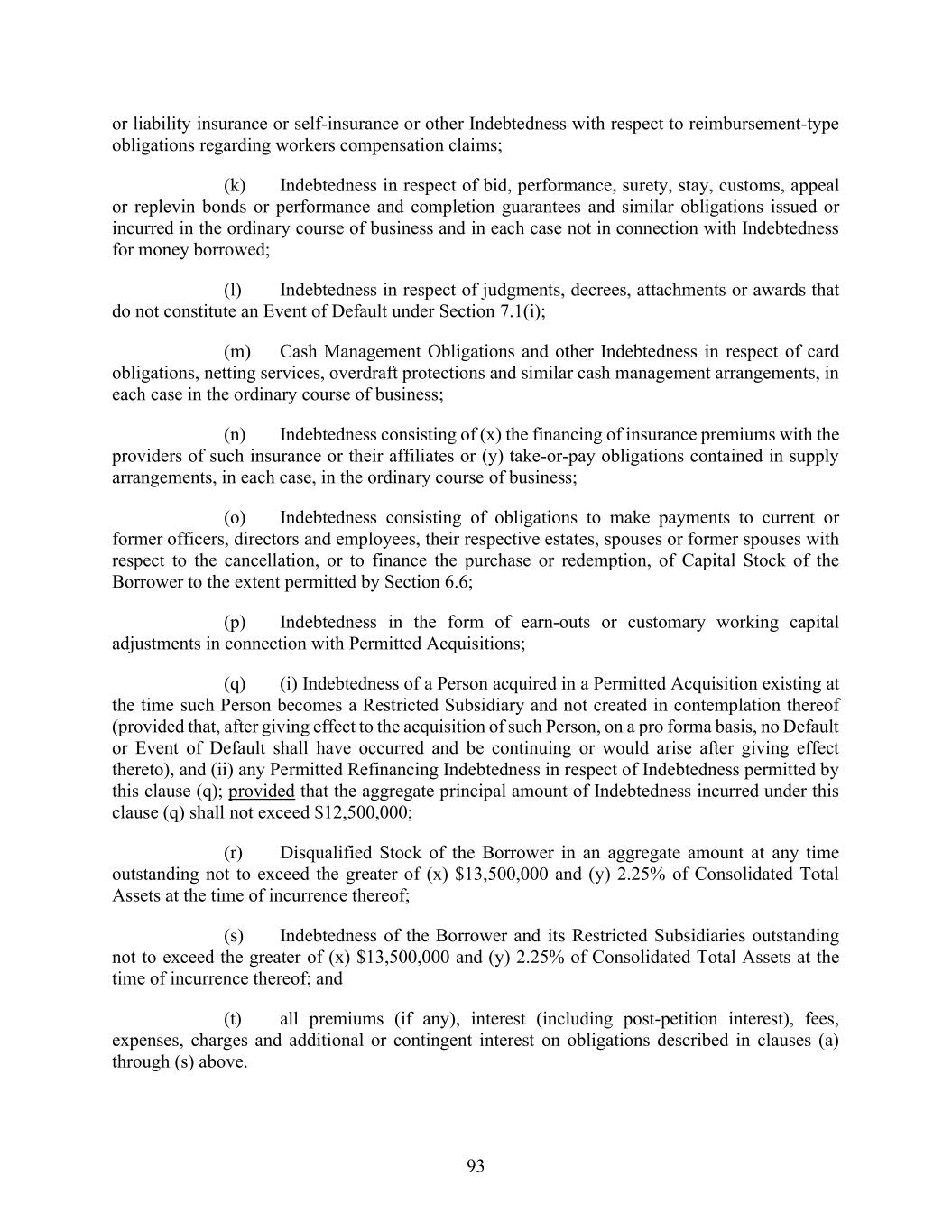 93 or liability insurance or self-insurance or other Indebtedness with respect to reimbursement-type obligations regarding workers compensation claims; (k) Indebtedness in respect of bid, performance, surety, stay, customs, appeal or replevin bonds or performance and completion guarantees and similar obligations issued or incurred in the ordinary course of business and in each case not in connection with Indebtedness for money borrowed; (l) Indebtedness in respect of judgments, decrees, attachments or awards that do not constitute an Event of Default under Section 7.1(i); (m) Cash Management Obligations and other Indebtedness in respect of card obligations, netting services, overdraft protections and similar cash management arrangements, in each case in the ordinary course of business; (n) Indebtedness consisting of (x) the financing of insurance premiums with the providers of such insurance or their affiliates or (y) take-or-pay obligations contained in supply arrangements, in each case, in the ordinary course of business; (o) Indebtedness consisting of obligations to make payments to current or former officers, directors and employees, their respective estates, spouses or former spouses with respect to the cancellation, or to finance the purchase or redemption, of Capital Stock of the Borrower to the extent permitted by Section 6.6; (p) Indebtedness in the form of earn-outs or customary working capital adjustments in connection with Permitted Acquisitions; (q) (i) Indebtedness of a Person acquired in a Permitted Acquisition existing at the time such Person becomes a Restricted Subsidiary and not created in contemplation thereof (provided that, after giving effect to the acquisition of such Person, on a pro forma basis, no Default or Event of Default shall have occurred and be continuing or would arise after giving effect thereto), and (ii) any Permitted Refinancing Indebtedness in respect of Indebtedness permitted by this clause (q); provided that the aggregate principal amount of Indebtedness incurred under this clause (q) shall not exceed $12,500,000; (r) Disqualified Stock of the Borrower in an aggregate amount at any time outstanding not to exceed the greater of (x) $13,500,000 and (y) 2.25% of Consolidated Total Assets at the time of incurrence thereof; (s) Indebtedness of the Borrower and its Restricted Subsidiaries outstanding not to exceed the greater of (x) $13,500,000 and (y) 2.25% of Consolidated Total Assets at the time of incurrence thereof; and (t) all premiums (if any), interest (including post-petition interest), fees, expenses, charges and additional or contingent interest on obligations described in clauses (a) through (s) above.