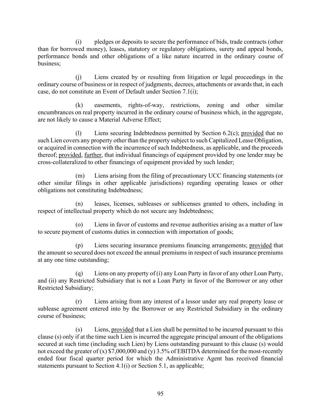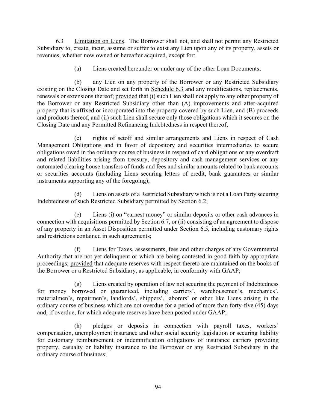 94 6.3 Limitation on Liens. The Borrower shall not, and shall not permit any Restricted Subsidiary to, create, incur, assume or suffer to exist any Lien upon any of its property, assets or revenues, whether now owned or hereafter acquired, except for: (a) Liens created hereunder or under any of the other Loan Documents; (b) any Lien on any property of the Borrower or any Restricted Subsidiary existing on the Closing Date and set forth in Schedule 6.3 and any modifications, replacements, renewals or extensions thereof; provided that (i) such Lien shall not apply to any other property of the Borrower or any Restricted Subsidiary other than (A) improvements and after-acquired property that is affixed or incorporated into the property covered by such Lien, and (B) proceeds and products thereof, and (ii) such Lien shall secure only those obligations which it secures on the Closing Date and any Permitted Refinancing Indebtedness in respect thereof; (c) rights of setoff and similar arrangements and Liens in respect of Cash Management Obligations and in favor of depository and securities intermediaries to secure obligations owed in the ordinary course of business in respect of card obligations or any overdraft and related liabilities arising from treasury, depository and cash management services or any automated clearing house transfers of funds and fees and similar amounts related to bank accounts or securities accounts (including Liens securing letters of credit, bank guarantees or similar instruments supporting any of the foregoing); (d) Liens on assets of a Restricted Subsidiary which is not a Loan Party securing Indebtedness of such Restricted Subsidiary permitted by Section 6.2; (e) Liens (i) on “earnest money” or similar deposits or other cash advances in connection with acquisitions permitted by Section 6.7, or (ii) consisting of an agreement to dispose of any property in an Asset Disposition permitted under Section 6.5, including customary rights and restrictions contained in such agreements; (f) Liens for Taxes, assessments, fees and other charges of any Governmental Authority that are not yet delinquent or which are being contested in good faith by appropriate proceedings; provided that adequate reserves with respect thereto are maintained on the books of the Borrower or a Restricted Subsidiary, as applicable, in conformity with GAAP; (g) Liens created by operation of law not securing the payment of Indebtedness for money borrowed or guaranteed, including carriers’, warehousemen’s, mechanics’, materialmen’s, repairmen’s, landlords’, shippers’, laborers’ or other like Liens arising in the ordinary course of business which are not overdue for a period of more than forty-five (45) days and, if overdue, for which adequate reserves have been posted under GAAP; (h) pledges or deposits in connection with payroll taxes, workers’ compensation, unemployment insurance and other social security legislation or securing liability for customary reimbursement or indemnification obligations of insurance carriers providing property, casualty or liability insurance to the Borrower or any Restricted Subsidiary in the ordinary course of business;