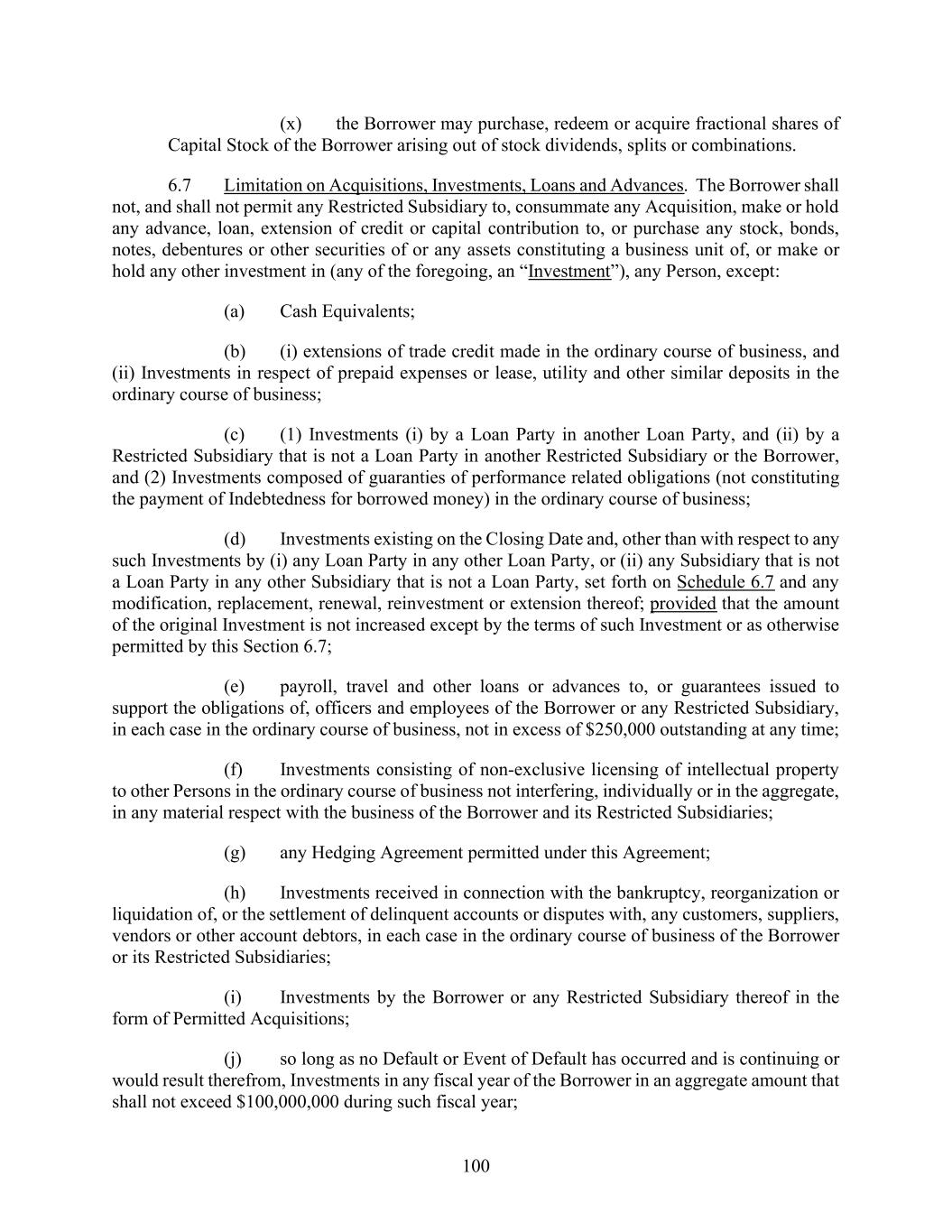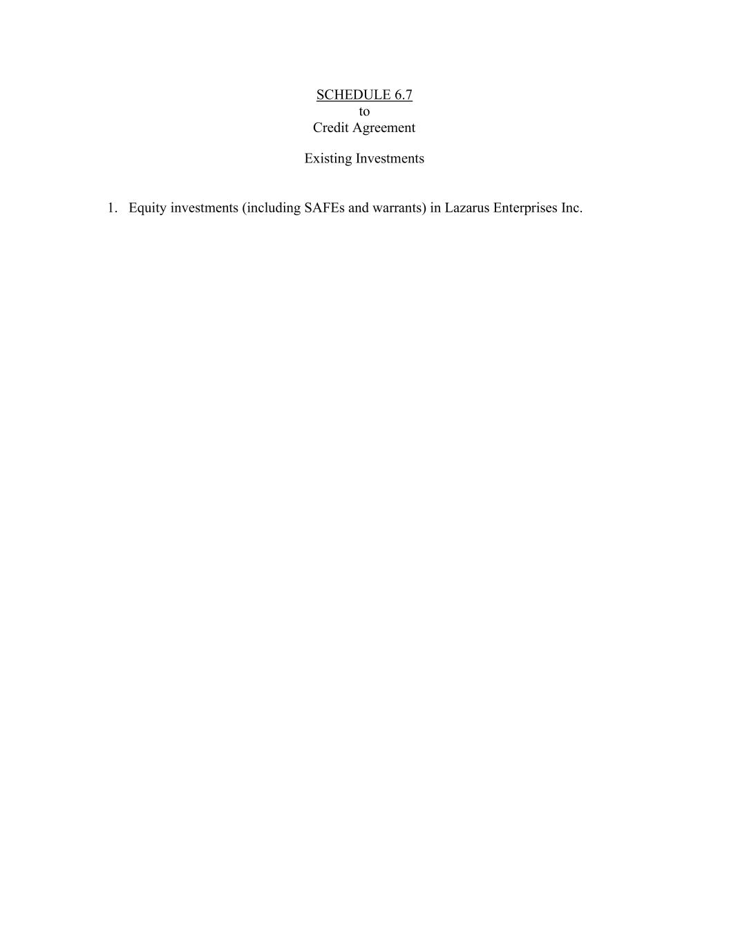 SCHEDULE 6.7 to Credit Agreement Existing Investments 1. Equity investments (including SAFEs and warrants) in Lazarus Enterprises Inc.