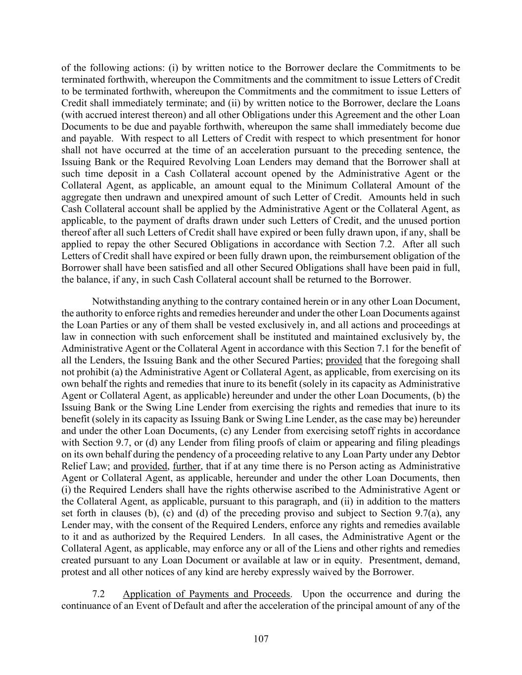 107 of the following actions: (i) by written notice to the Borrower declare the Commitments to be terminated forthwith, whereupon the Commitments and the commitment to issue Letters of Credit to be terminated forthwith, whereupon the Commitments and the commitment to issue Letters of Credit shall immediately terminate; and (ii) by written notice to the Borrower, declare the Loans (with accrued interest thereon) and all other Obligations under this Agreement and the other Loan Documents to be due and payable forthwith, whereupon the same shall immediately become due and payable. With respect to all Letters of Credit with respect to which presentment for honor shall not have occurred at the time of an acceleration pursuant to the preceding sentence, the Issuing Bank or the Required Revolving Loan Lenders may demand that the Borrower shall at such time deposit in a Cash Collateral account opened by the Administrative Agent or the Collateral Agent, as applicable, an amount equal to the Minimum Collateral Amount of the aggregate then undrawn and unexpired amount of such Letter of Credit. Amounts held in such Cash Collateral account shall be applied by the Administrative Agent or the Collateral Agent, as applicable, to the payment of drafts drawn under such Letters of Credit, and the unused portion thereof after all such Letters of Credit shall have expired or been fully drawn upon, if any, shall be applied to repay the other Secured Obligations in accordance with Section 7.2. After all such Letters of Credit shall have expired or been fully drawn upon, the reimbursement obligation of the Borrower shall have been satisfied and all other Secured Obligations shall have been paid in full, the balance, if any, in such Cash Collateral account shall be returned to the Borrower. Notwithstanding anything to the contrary contained herein or in any other Loan Document, the authority to enforce rights and remedies hereunder and under the other Loan Documents against the Loan Parties or any of them shall be vested exclusively in, and all actions and proceedings at law in connection with such enforcement shall be instituted and maintained exclusively by, the Administrative Agent or the Collateral Agent in accordance with this Section 7.1 for the benefit of all the Lenders, the Issuing Bank and the other Secured Parties; provided that the foregoing shall not prohibit (a) the Administrative Agent or Collateral Agent, as applicable, from exercising on its own behalf the rights and remedies that inure to its benefit (solely in its capacity as Administrative Agent or Collateral Agent, as applicable) hereunder and under the other Loan Documents, (b) the Issuing Bank or the Swing Line Lender from exercising the rights and remedies that inure to its benefit (solely in its capacity as Issuing Bank or Swing Line Lender, as the case may be) hereunder and under the other Loan Documents, (c) any Lender from exercising setoff rights in accordance with Section 9.7, or (d) any Lender from filing proofs of claim or appearing and filing pleadings on its own behalf during the pendency of a proceeding relative to any Loan Party under any Debtor Relief Law; and provided, further, that if at any time there is no Person acting as Administrative Agent or Collateral Agent, as applicable, hereunder and under the other Loan Documents, then (i) the Required Lenders shall have the rights otherwise ascribed to the Administrative Agent or the Collateral Agent, as applicable, pursuant to this paragraph, and (ii) in addition to the matters set forth in clauses (b), (c) and (d) of the preceding proviso and subject to Section 9.7(a), any Lender may, with the consent of the Required Lenders, enforce any rights and remedies available to it and as authorized by the Required Lenders. In all cases, the Administrative Agent or the Collateral Agent, as applicable, may enforce any or all of the Liens and other rights and remedies created pursuant to any Loan Document or available at law or in equity. Presentment, demand, protest and all other notices of any kind are hereby expressly waived by the Borrower. 7.2 Application of Payments and Proceeds. Upon the occurrence and during the continuance of an Event of Default and after the acceleration of the principal amount of any of the