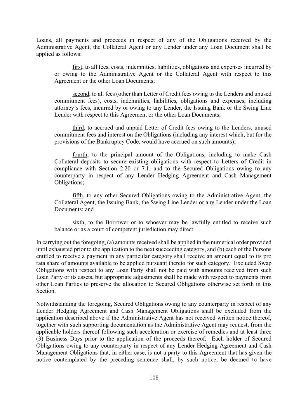 108 Loans, all payments and proceeds in respect of any of the Obligations received by the Administrative Agent, the Collateral Agent or any Lender under any Loan Document shall be applied as follows: first, to all fees, costs, indemnities, liabilities, obligations and expenses incurred by or owing to the Administrative Agent or the Collateral Agent with respect to this Agreement or the other Loan Documents; second, to all fees (other than Letter of Credit fees owing to the Lenders and unused commitment fees), costs, indemnities, liabilities, obligations and expenses, including attorney’s fees, incurred by or owing to any Lender, the Issuing Bank or the Swing Line Lender with respect to this Agreement or the other Loan Documents; third, to accrued and unpaid Letter of Credit fees owing to the Lenders, unused commitment fees and interest on the Obligations (including any interest which, but for the provisions of the Bankruptcy Code, would have accrued on such amounts); fourth, to the principal amount of the Obligations, including to make Cash Collateral deposits to secure existing obligations with respect to Letters of Credit in compliance with Section 2.20 or 7.1, and to the Secured Obligations owing to any counterparty in respect of any Lender Hedging Agreement and Cash Management Obligations; fifth, to any other Secured Obligations owing to the Administrative Agent, the Collateral Agent, the Issuing Bank, the Swing Line Lender or any Lender under the Loan Documents; and sixth, to the Borrower or to whoever may be lawfully entitled to receive such balance or as a court of competent jurisdiction may direct. In carrying out the foregoing, (a) amounts received shall be applied in the numerical order provided until exhausted prior to the application to the next succeeding category, and (b) each of the Persons entitled to receive a payment in any particular category shall receive an amount equal to its pro rata share of amounts available to be applied pursuant thereto for such category. Excluded Swap Obligations with respect to any Loan Party shall not be paid with amounts received from such Loan Party or its assets, but appropriate adjustments shall be made with respect to payments from other Loan Parties to preserve the allocation to Secured Obligations otherwise set forth in this Section. Notwithstanding the foregoing, Secured Obligations owing to any counterparty in respect of any Lender Hedging Agreement and Cash Management Obligations shall be excluded from the application described above if the Administrative Agent has not received written notice thereof, together with such supporting documentation as the Administrative Agent may request, from the applicable holders thereof following such acceleration or exercise of remedies and at least three (3) Business Days prior to the application of the proceeds thereof. Each holder of Secured Obligations owing to any counterparty in respect of any Lender Hedging Agreement and Cash Management Obligations that, in either case, is not a party to this Agreement that has given the notice contemplated by the preceding sentence shall, by such notice, be deemed to have