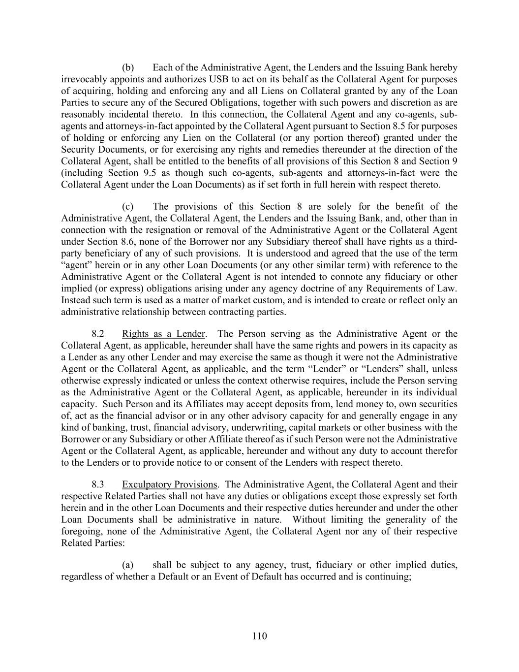 110 (b) Each of the Administrative Agent, the Lenders and the Issuing Bank hereby irrevocably appoints and authorizes USB to act on its behalf as the Collateral Agent for purposes of acquiring, holding and enforcing any and all Liens on Collateral granted by any of the Loan Parties to secure any of the Secured Obligations, together with such powers and discretion as are reasonably incidental thereto. In this connection, the Collateral Agent and any co-agents, sub- agents and attorneys-in-fact appointed by the Collateral Agent pursuant to Section 8.5 for purposes of holding or enforcing any Lien on the Collateral (or any portion thereof) granted under the Security Documents, or for exercising any rights and remedies thereunder at the direction of the Collateral Agent, shall be entitled to the benefits of all provisions of this Section 8 and Section 9 (including Section 9.5 as though such co-agents, sub-agents and attorneys-in-fact were the Collateral Agent under the Loan Documents) as if set forth in full herein with respect thereto. (c) The provisions of this Section 8 are solely for the benefit of the Administrative Agent, the Collateral Agent, the Lenders and the Issuing Bank, and, other than in connection with the resignation or removal of the Administrative Agent or the Collateral Agent under Section 8.6, none of the Borrower nor any Subsidiary thereof shall have rights as a third- party beneficiary of any of such provisions. It is understood and agreed that the use of the term “agent” herein or in any other Loan Documents (or any other similar term) with reference to the Administrative Agent or the Collateral Agent is not intended to connote any fiduciary or other implied (or express) obligations arising under any agency doctrine of any Requirements of Law. Instead such term is used as a matter of market custom, and is intended to create or reflect only an administrative relationship between contracting parties. 8.2 Rights as a Lender. The Person serving as the Administrative Agent or the Collateral Agent, as applicable, hereunder shall have the same rights and powers in its capacity as a Lender as any other Lender and may exercise the same as though it were not the Administrative Agent or the Collateral Agent, as applicable, and the term “Lender” or “Lenders” shall, unless otherwise expressly indicated or unless the context otherwise requires, include the Person serving as the Administrative Agent or the Collateral Agent, as applicable, hereunder in its individual capacity. Such Person and its Affiliates may accept deposits from, lend money to, own securities of, act as the financial advisor or in any other advisory capacity for and generally engage in any kind of banking, trust, financial advisory, underwriting, capital markets or other business with the Borrower or any Subsidiary or other Affiliate thereof as if such Person were not the Administrative Agent or the Collateral Agent, as applicable, hereunder and without any duty to account therefor to the Lenders or to provide notice to or consent of the Lenders with respect thereto. 8.3 Exculpatory Provisions. The Administrative Agent, the Collateral Agent and their respective Related Parties shall not have any duties or obligations except those expressly set forth herein and in the other Loan Documents and their respective duties hereunder and under the other Loan Documents shall be administrative in nature. Without limiting the generality of the foregoing, none of the Administrative Agent, the Collateral Agent nor any of their respective Related Parties: (a) shall be subject to any agency, trust, fiduciary or other implied duties, regardless of whether a Default or an Event of Default has occurred and is continuing;