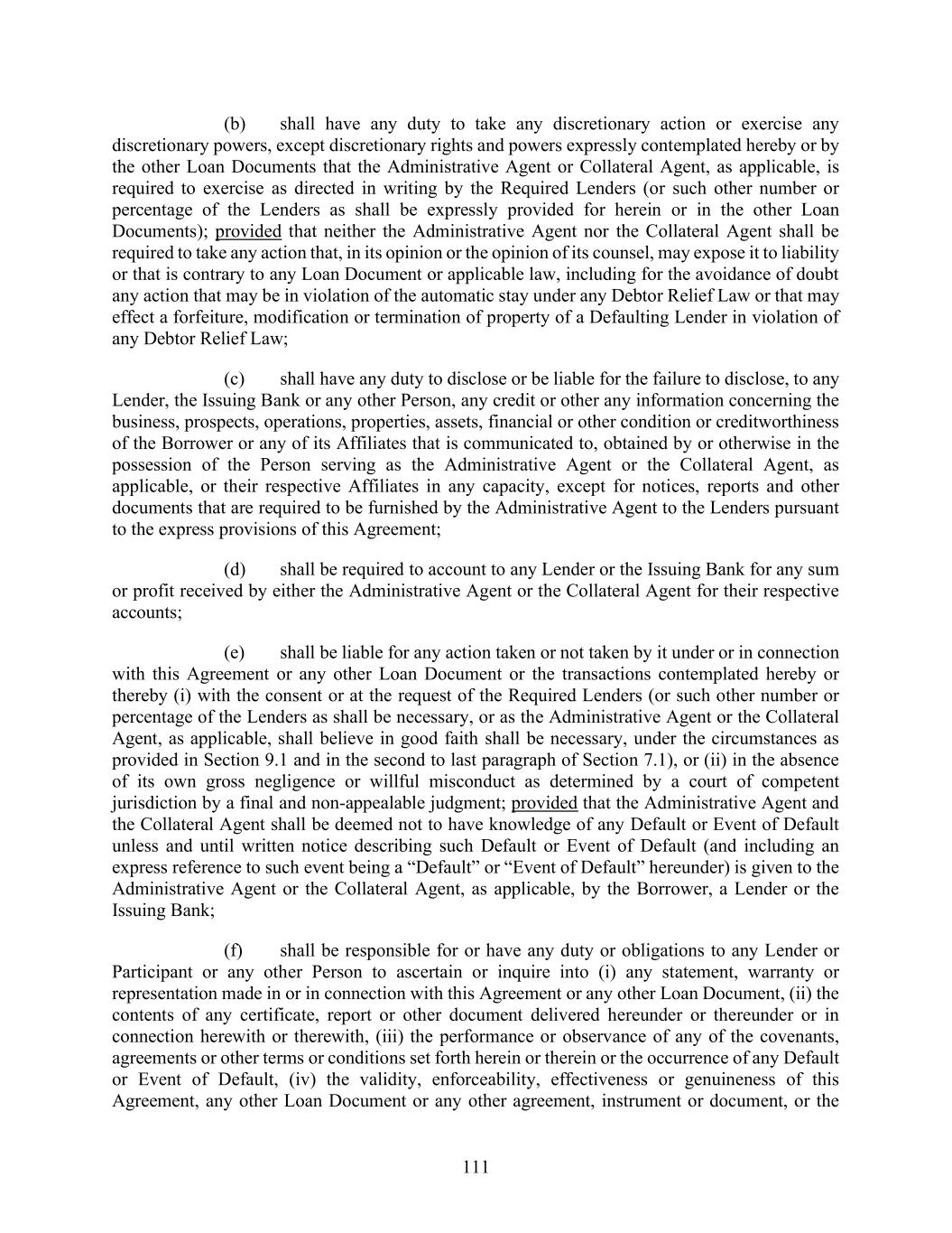 111 (b) shall have any duty to take any discretionary action or exercise any discretionary powers, except discretionary rights and powers expressly contemplated hereby or by the other Loan Documents that the Administrative Agent or Collateral Agent, as applicable, is required to exercise as directed in writing by the Required Lenders (or such other number or percentage of the Lenders as shall be expressly provided for herein or in the other Loan Documents); provided that neither the Administrative Agent nor the Collateral Agent shall be required to take any action that, in its opinion or the opinion of its counsel, may expose it to liability or that is contrary to any Loan Document or applicable law, including for the avoidance of doubt any action that may be in violation of the automatic stay under any Debtor Relief Law or that may effect a forfeiture, modification or termination of property of a Defaulting Lender in violation of any Debtor Relief Law; (c) shall have any duty to disclose or be liable for the failure to disclose, to any Lender, the Issuing Bank or any other Person, any credit or other any information concerning the business, prospects, operations, properties, assets, financial or other condition or creditworthiness of the Borrower or any of its Affiliates that is communicated to, obtained by or otherwise in the possession of the Person serving as the Administrative Agent or the Collateral Agent, as applicable, or their respective Affiliates in any capacity, except for notices, reports and other documents that are required to be furnished by the Administrative Agent to the Lenders pursuant to the express provisions of this Agreement; (d) shall be required to account to any Lender or the Issuing Bank for any sum or profit received by either the Administrative Agent or the Collateral Agent for their respective accounts; (e) shall be liable for any action taken or not taken by it under or in connection with this Agreement or any other Loan Document or the transactions contemplated hereby or thereby (i) with the consent or at the request of the Required Lenders (or such other number or percentage of the Lenders as shall be necessary, or as the Administrative Agent or the Collateral Agent, as applicable, shall believe in good faith shall be necessary, under the circumstances as provided in Section 9.1 and in the second to last paragraph of Section 7.1), or (ii) in the absence of its own gross negligence or willful misconduct as determined by a court of competent jurisdiction by a final and non-appealable judgment; provided that the Administrative Agent and the Collateral Agent shall be deemed not to have knowledge of any Default or Event of Default unless and until written notice describing such Default or Event of Default (and including an express reference to such event being a “Default” or “Event of Default” hereunder) is given to the Administrative Agent or the Collateral Agent, as applicable, by the Borrower, a Lender or the Issuing Bank; (f) shall be responsible for or have any duty or obligations to any Lender or Participant or any other Person to ascertain or inquire into (i) any statement, warranty or representation made in or in connection with this Agreement or any other Loan Document, (ii) the contents of any certificate, report or other document delivered hereunder or thereunder or in connection herewith or therewith, (iii) the performance or observance of any of the covenants, agreements or other terms or conditions set forth herein or therein or the occurrence of any Default or Event of Default, (iv) the validity, enforceability, effectiveness or genuineness of this Agreement, any other Loan Document or any other agreement, instrument or document, or the