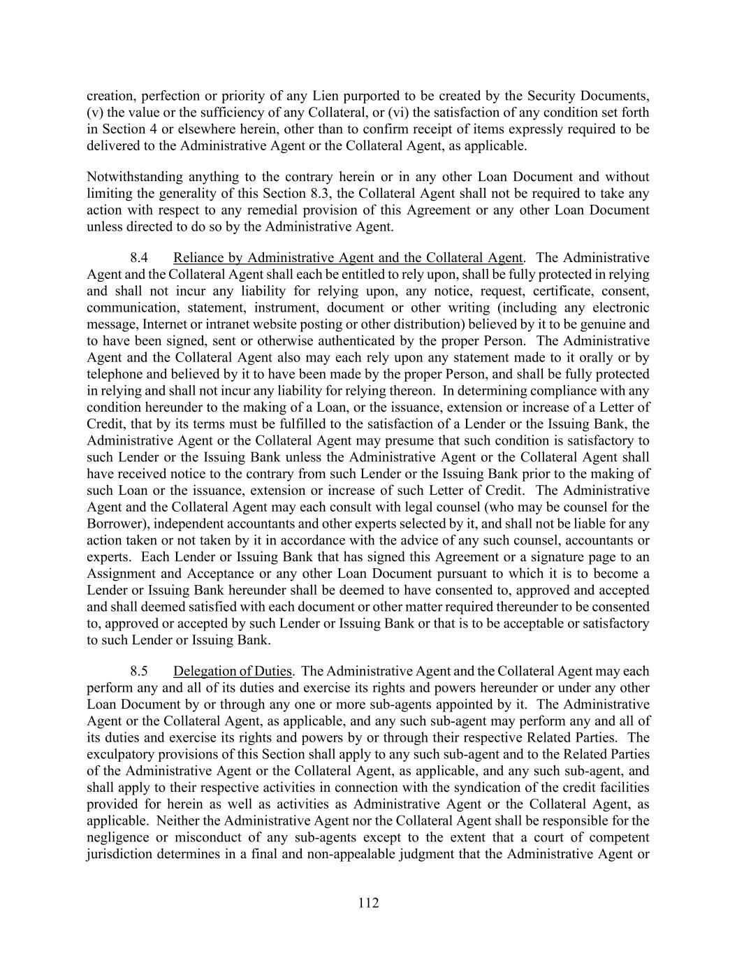 112 creation, perfection or priority of any Lien purported to be created by the Security Documents, (v) the value or the sufficiency of any Collateral, or (vi) the satisfaction of any condition set forth in Section 4 or elsewhere herein, other than to confirm receipt of items expressly required to be delivered to the Administrative Agent or the Collateral Agent, as applicable. Notwithstanding anything to the contrary herein or in any other Loan Document and without limiting the generality of this Section 8.3, the Collateral Agent shall not be required to take any action with respect to any remedial provision of this Agreement or any other Loan Document unless directed to do so by the Administrative Agent. 8.4 Reliance by Administrative Agent and the Collateral Agent. The Administrative Agent and the Collateral Agent shall each be entitled to rely upon, shall be fully protected in relying and shall not incur any liability for relying upon, any notice, request, certificate, consent, communication, statement, instrument, document or other writing (including any electronic message, Internet or intranet website posting or other distribution) believed by it to be genuine and to have been signed, sent or otherwise authenticated by the proper Person. The Administrative Agent and the Collateral Agent also may each rely upon any statement made to it orally or by telephone and believed by it to have been made by the proper Person, and shall be fully protected in relying and shall not incur any liability for relying thereon. In determining compliance with any condition hereunder to the making of a Loan, or the issuance, extension or increase of a Letter of Credit, that by its terms must be fulfilled to the satisfaction of a Lender or the Issuing Bank, the Administrative Agent or the Collateral Agent may presume that such condition is satisfactory to such Lender or the Issuing Bank unless the Administrative Agent or the Collateral Agent shall have received notice to the contrary from such Lender or the Issuing Bank prior to the making of such Loan or the issuance, extension or increase of such Letter of Credit. The Administrative Agent and the Collateral Agent may each consult with legal counsel (who may be counsel for the Borrower), independent accountants and other experts selected by it, and shall not be liable for any action taken or not taken by it in accordance with the advice of any such counsel, accountants or experts. Each Lender or Issuing Bank that has signed this Agreement or a signature page to an Assignment and Acceptance or any other Loan Document pursuant to which it is to become a Lender or Issuing Bank hereunder shall be deemed to have consented to, approved and accepted and shall deemed satisfied with each document or other matter required thereunder to be consented to, approved or accepted by such Lender or Issuing Bank or that is to be acceptable or satisfactory to such Lender or Issuing Bank. 8.5 Delegation of Duties. The Administrative Agent and the Collateral Agent may each perform any and all of its duties and exercise its rights and powers hereunder or under any other Loan Document by or through any one or more sub-agents appointed by it. The Administrative Agent or the Collateral Agent, as applicable, and any such sub-agent may perform any and all of its duties and exercise its rights and powers by or through their respective Related Parties. The exculpatory provisions of this Section shall apply to any such sub-agent and to the Related Parties of the Administrative Agent or the Collateral Agent, as applicable, and any such sub-agent, and shall apply to their respective activities in connection with the syndication of the credit facilities provided for herein as well as activities as Administrative Agent or the Collateral Agent, as applicable. Neither the Administrative Agent nor the Collateral Agent shall be responsible for the negligence or misconduct of any sub-agents except to the extent that a court of competent jurisdiction determines in a final and non-appealable judgment that the Administrative Agent or