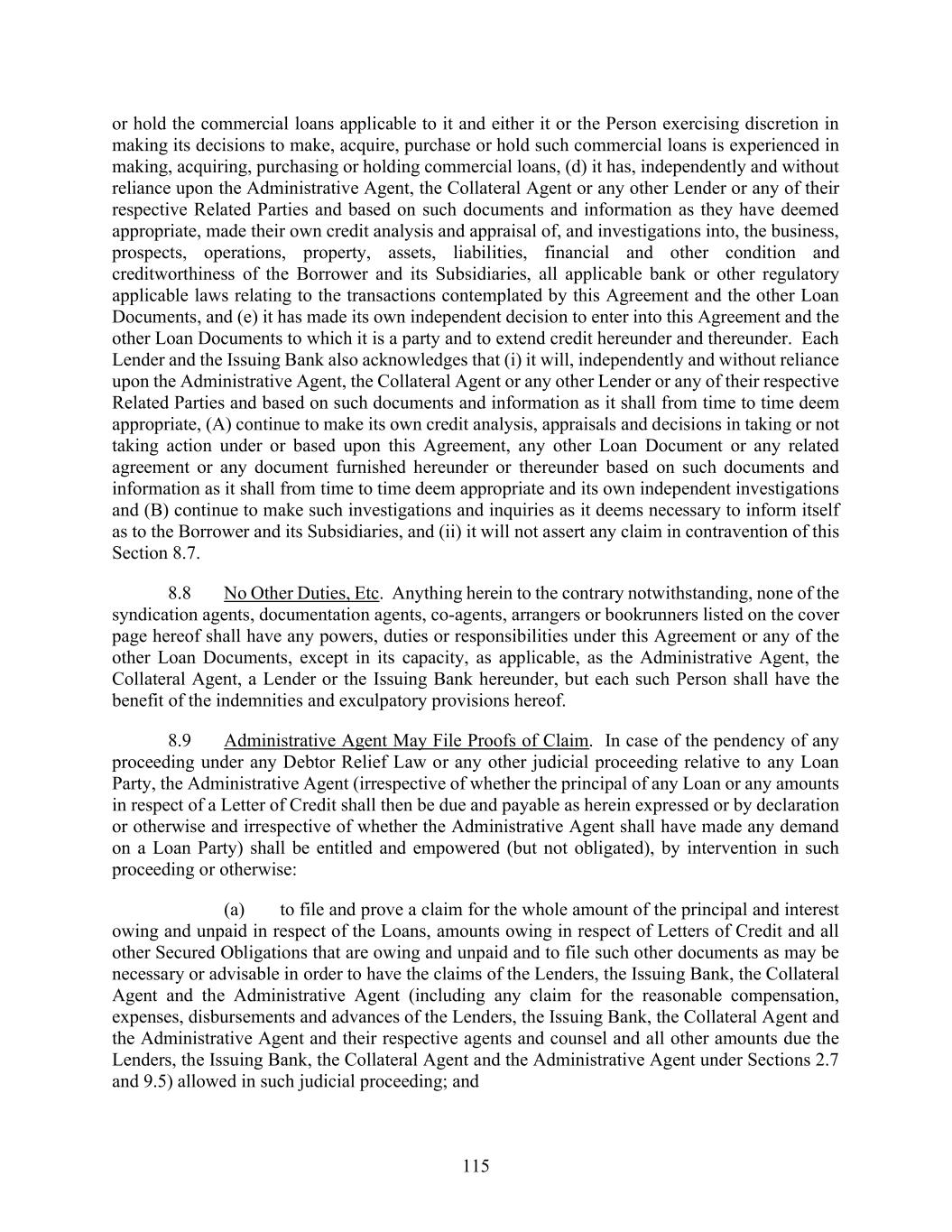115 or hold the commercial loans applicable to it and either it or the Person exercising discretion in making its decisions to make, acquire, purchase or hold such commercial loans is experienced in making, acquiring, purchasing or holding commercial loans, (d) it has, independently and without reliance upon the Administrative Agent, the Collateral Agent or any other Lender or any of their respective Related Parties and based on such documents and information as they have deemed appropriate, made their own credit analysis and appraisal of, and investigations into, the business, prospects, operations, property, assets, liabilities, financial and other condition and creditworthiness of the Borrower and its Subsidiaries, all applicable bank or other regulatory applicable laws relating to the transactions contemplated by this Agreement and the other Loan Documents, and (e) it has made its own independent decision to enter into this Agreement and the other Loan Documents to which it is a party and to extend credit hereunder and thereunder. Each Lender and the Issuing Bank also acknowledges that (i) it will, independently and without reliance upon the Administrative Agent, the Collateral Agent or any other Lender or any of their respective Related Parties and based on such documents and information as it shall from time to time deem appropriate, (A) continue to make its own credit analysis, appraisals and decisions in taking or not taking action under or based upon this Agreement, any other Loan Document or any related agreement or any document furnished hereunder or thereunder based on such documents and information as it shall from time to time deem appropriate and its own independent investigations and (B) continue to make such investigations and inquiries as it deems necessary to inform itself as to the Borrower and its Subsidiaries, and (ii) it will not assert any claim in contravention of this Section 8.7. 8.8 No Other Duties, Etc. Anything herein to the contrary notwithstanding, none of the syndication agents, documentation agents, co-agents, arrangers or bookrunners listed on the cover page hereof shall have any powers, duties or responsibilities under this Agreement or any of the other Loan Documents, except in its capacity, as applicable, as the Administrative Agent, the Collateral Agent, a Lender or the Issuing Bank hereunder, but each such Person shall have the benefit of the indemnities and exculpatory provisions hereof. 8.9 Administrative Agent May File Proofs of Claim. In case of the pendency of any proceeding under any Debtor Relief Law or any other judicial proceeding relative to any Loan Party, the Administrative Agent (irrespective of whether the principal of any Loan or any amounts in respect of a Letter of Credit shall then be due and payable as herein expressed or by declaration or otherwise and irrespective of whether the Administrative Agent shall have made any demand on a Loan Party) shall be entitled and empowered (but not obligated), by intervention in such proceeding or otherwise: (a) to file and prove a claim for the whole amount of the principal and interest owing and unpaid in respect of the Loans, amounts owing in respect of Letters of Credit and all other Secured Obligations that are owing and unpaid and to file such other documents as may be necessary or advisable in order to have the claims of the Lenders, the Issuing Bank, the Collateral Agent and the Administrative Agent (including any claim for the reasonable compensation, expenses, disbursements and advances of the Lenders, the Issuing Bank, the Collateral Agent and the Administrative Agent and their respective agents and counsel and all other amounts due the Lenders, the Issuing Bank, the Collateral Agent and the Administrative Agent under Sections 2.7 and 9.5) allowed in such judicial proceeding; and