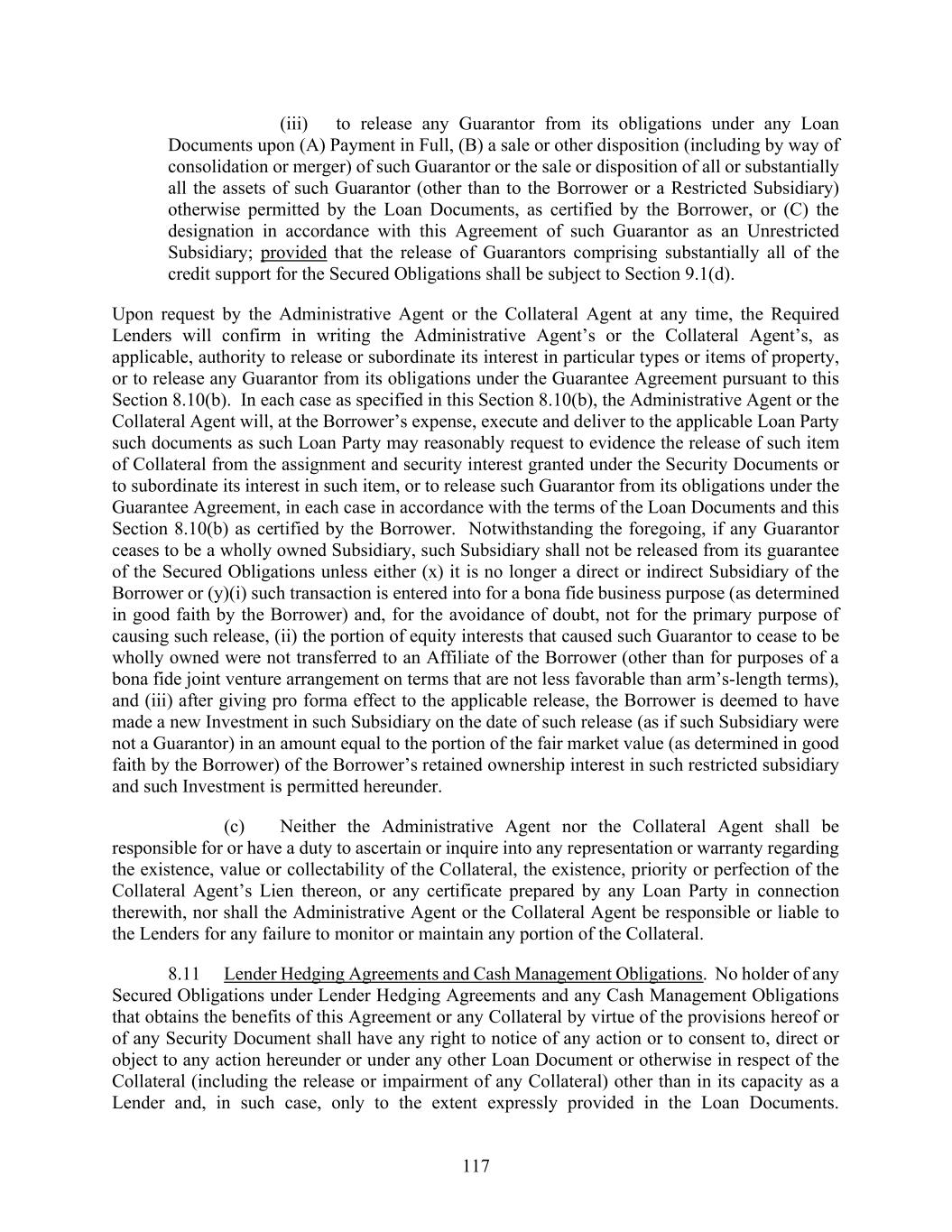 117 (iii) to release any Guarantor from its obligations under any Loan Documents upon (A) Payment in Full, (B) a sale or other disposition (including by way of consolidation or merger) of such Guarantor or the sale or disposition of all or substantially all the assets of such Guarantor (other than to the Borrower or a Restricted Subsidiary) otherwise permitted by the Loan Documents, as certified by the Borrower, or (C) the designation in accordance with this Agreement of such Guarantor as an Unrestricted Subsidiary; provided that the release of Guarantors comprising substantially all of the credit support for the Secured Obligations shall be subject to Section 9.1(d). Upon request by the Administrative Agent or the Collateral Agent at any time, the Required Lenders will confirm in writing the Administrative Agent’s or the Collateral Agent’s, as applicable, authority to release or subordinate its interest in particular types or items of property, or to release any Guarantor from its obligations under the Guarantee Agreement pursuant to this Section 8.10(b). In each case as specified in this Section 8.10(b), the Administrative Agent or the Collateral Agent will, at the Borrower’s expense, execute and deliver to the applicable Loan Party such documents as such Loan Party may reasonably request to evidence the release of such item of Collateral from the assignment and security interest granted under the Security Documents or to subordinate its interest in such item, or to release such Guarantor from its obligations under the Guarantee Agreement, in each case in accordance with the terms of the Loan Documents and this Section 8.10(b) as certified by the Borrower. Notwithstanding the foregoing, if any Guarantor ceases to be a wholly owned Subsidiary, such Subsidiary shall not be released from its guarantee of the Secured Obligations unless either (x) it is no longer a direct or indirect Subsidiary of the Borrower or (y)(i) such transaction is entered into for a bona fide business purpose (as determined in good faith by the Borrower) and, for the avoidance of doubt, not for the primary purpose of causing such release, (ii) the portion of equity interests that caused such Guarantor to cease to be wholly owned were not transferred to an Affiliate of the Borrower (other than for purposes of a bona fide joint venture arrangement on terms that are not less favorable than arm’s-length terms), and (iii) after giving pro forma effect to the applicable release, the Borrower is deemed to have made a new Investment in such Subsidiary on the date of such release (as if such Subsidiary were not a Guarantor) in an amount equal to the portion of the fair market value (as determined in good faith by the Borrower) of the Borrower’s retained ownership interest in such restricted subsidiary and such Investment is permitted hereunder. (c) Neither the Administrative Agent nor the Collateral Agent shall be responsible for or have a duty to ascertain or inquire into any representation or warranty regarding the existence, value or collectability of the Collateral, the existence, priority or perfection of the Collateral Agent’s Lien thereon, or any certificate prepared by any Loan Party in connection therewith, nor shall the Administrative Agent or the Collateral Agent be responsible or liable to the Lenders for any failure to monitor or maintain any portion of the Collateral. 8.11 Lender Hedging Agreements and Cash Management Obligations. No holder of any Secured Obligations under Lender Hedging Agreements and any Cash Management Obligations that obtains the benefits of this Agreement or any Collateral by virtue of the provisions hereof or of any Security Document shall have any right to notice of any action or to consent to, direct or object to any action hereunder or under any other Loan Document or otherwise in respect of the Collateral (including the release or impairment of any Collateral) other than in its capacity as a Lender and, in such case, only to the extent expressly provided in the Loan Documents.
